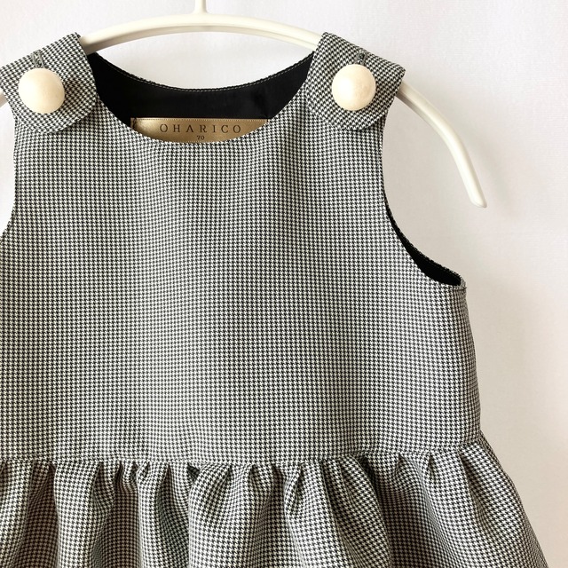 肩にちょこんと乗った大きなパールボタンが特徴の、ベビーキッズの女の子向けよそゆきワンピース(ジャンパースカート)です。 上品な千鳥チェックの生地で、ちょっぴり大人っぽい可愛さを感じられます。裏地は高級裏地のキュプラ素材を使用。 お誕生日会などのパーティーやディナーの席で、小さなレディ姿が見られますよ。 出産祝いやハーフバースデー、1歳のお誕生日など、セレモニー用に、贈り物としてもいいですね。 『シルプルなのでコーデもいろいろ♪』 ジャンスカ(ジャンパースカート)なので、中に白のシャツやセーターにタイツ、または股スナップがついたボディ肌着を組み合わせて、可愛いコーデをいろいろと楽しんでみてください。(インナーは襟がない方がベターです) 『オプションのスタイでより素敵に』 食べこぼしやよだれが気になる子は、オプションの専用スタイで、よりオシャレなスタイルを楽しめます♪ (肩のパールボタンに装着できるように作られています。※市販のスタイだとパールボタンが隠れてしまいます。) 『おすすめ着用シーン』 ハーフバースデー、お誕生日、ディナー、ランチ、結婚式、入園式、入学式、発表会、パーティー、レストラン、などフォーマルなお出かけ着として。 ★子ども服のサイズ 個人差はありますが6か月で70サイズ、1歳で80サイズが目安です。詳しくは商品写真内の「ベビー/子供服の着用時期の目安」をご覧ください。 ※写真のモデルは小さめの赤ちゃんで、1歳(身長69cm/8kg)で70サイズ着用です。 ※身長の目安 60サイズ 身長55〜65cm 70サイズ 身長65〜75cm 80サイズ 身長75〜85cm 90サイズ 身長85〜95cm ★お色違いもあります(^^) ▼チェック ・千鳥チェック〈70〉【現在のページ】 ・紺チェック〈100〉 ▼モノトーン ・アイスグレー〈80〉 ・ダークネイビー〈80〉 ・ライトグレー〈90〉 ・ブラック〈90〉 ▼グリーン系 ・ミントグリーン〈60-90〉 ・アースグリーン〈60-90〉 ▼ブルー系 ・ネイビー〈60-90〉 ・くすみブルー〈60-90〉 ・ブルーグレー〈60-90〉 『大きなパールボタンのよそゆきワンピース』 【カラー】千鳥チェック(黒×白) 【サイズ】70cmサイズのみ ※現在の身長での目安 60サイズ 身長55〜65cm 70サイズ 身長65〜75cm 80サイズ 身長75〜85cm 90サイズ 身長85〜95cm 【裏地】あり 【ポケット】なし(オプション不可) 【素材】表:ポリエステル 100% 裏:キュプラ80% ポリエステル20% <お届けまでの目安>受注制作になりますのでお時間をいただきますが、在庫がある場合はすぐに発送します。 <再販予定>完売後は再販なし <取扱の注意事項> ドライクリーニングをお勧めいたします。ご家庭での洗濯の場合、シワや縮みの原因となるためご注意ください。 ※パールボタンは外れて誤飲がないように、ビーズ用の丈夫な糸の上に、シルクの光沢が綺麗なボタン糸でとめる二重構造にしてあります。(それでも経年劣化で取れかけていたりしたら危ないので速やかに繕ってください) ※ご不明な点がありましたら、購入前にお気軽にお問い合わせください。 ※minne店、Creema店、イベント等と在庫を共有しているため、ご注文頂いた商品でもキャンセルとなる場合がございます。何卒ご理解のほどよろしくお願いいたします。 by OHARICO CLUB