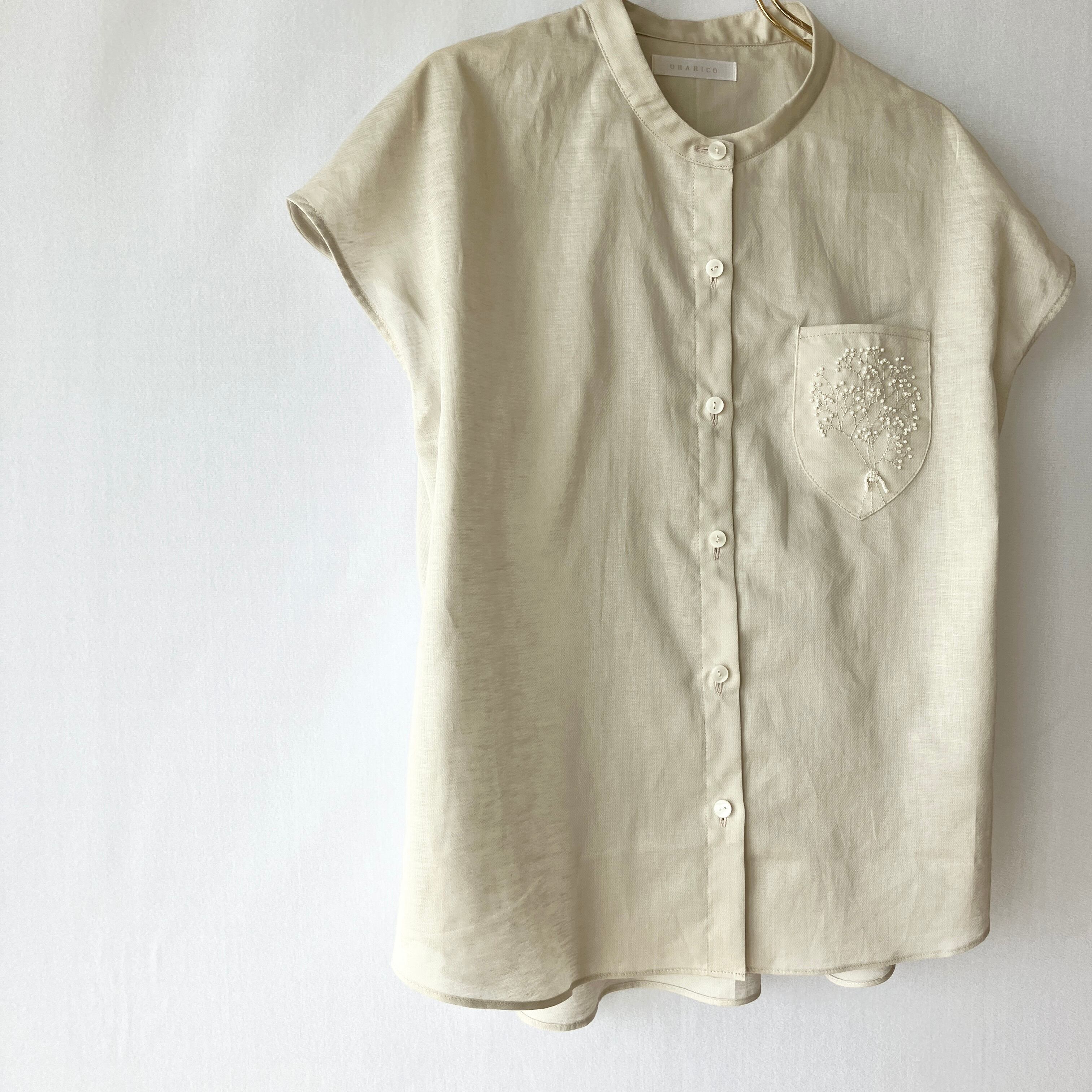 カスミ草パール刺繍のシャツブラウス【シアー/フレンチスリーブ/半袖/ベージュ/スタンドカラー(パール刺繍)】