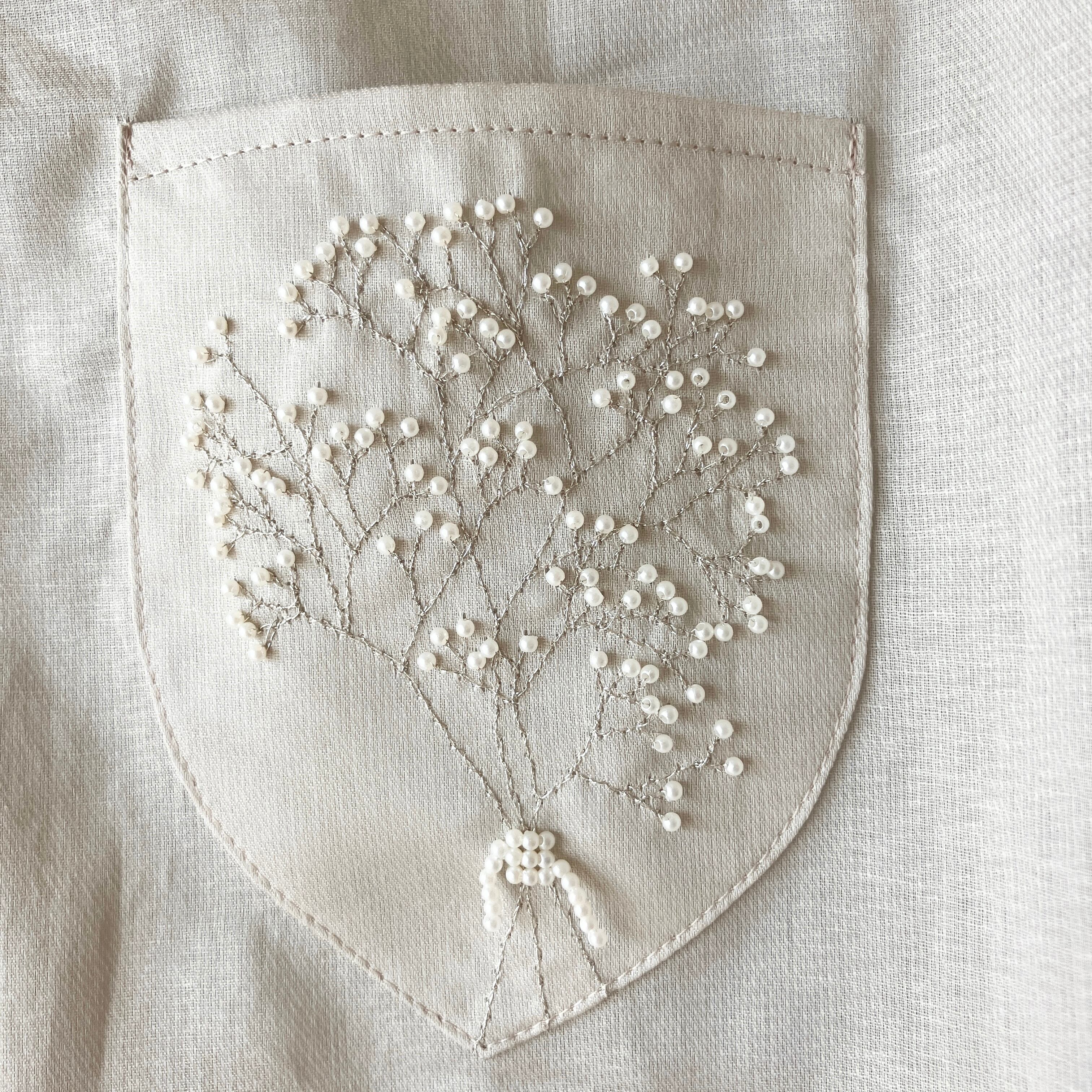 銀糸をまとった可憐な小花が、パールビーズの刺繍で美しく表現された一点もの。
