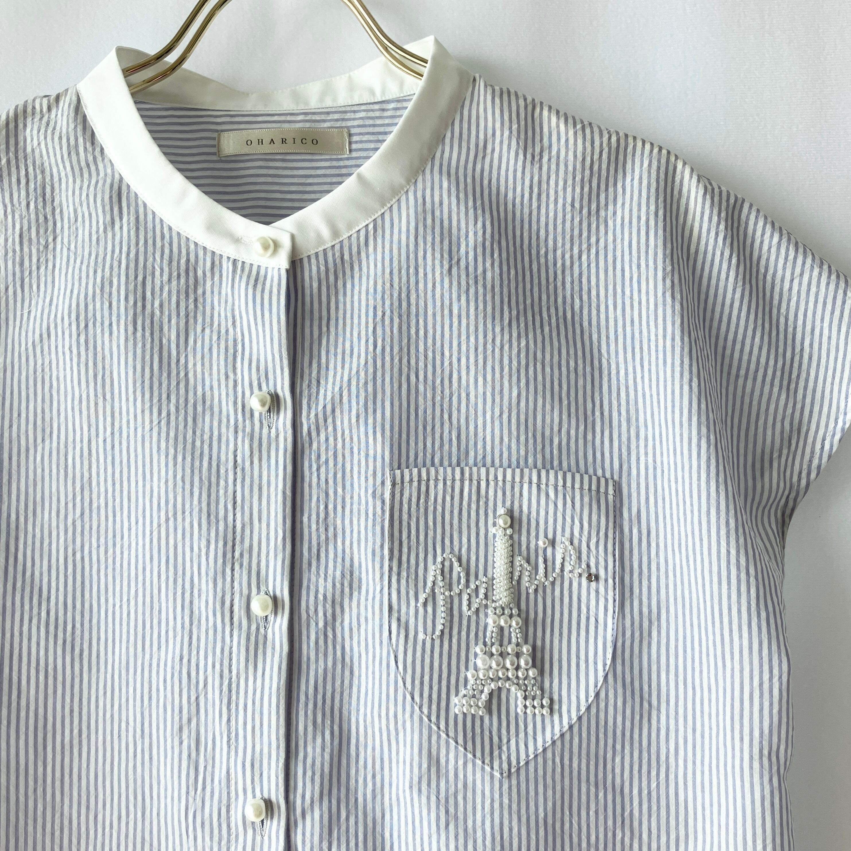 エッフェル塔パール刺繍のクレリックシャツ【フレンチスリーブ(半袖)/シアー/ストライプ/シャツブラウス/パール/刺繍】
