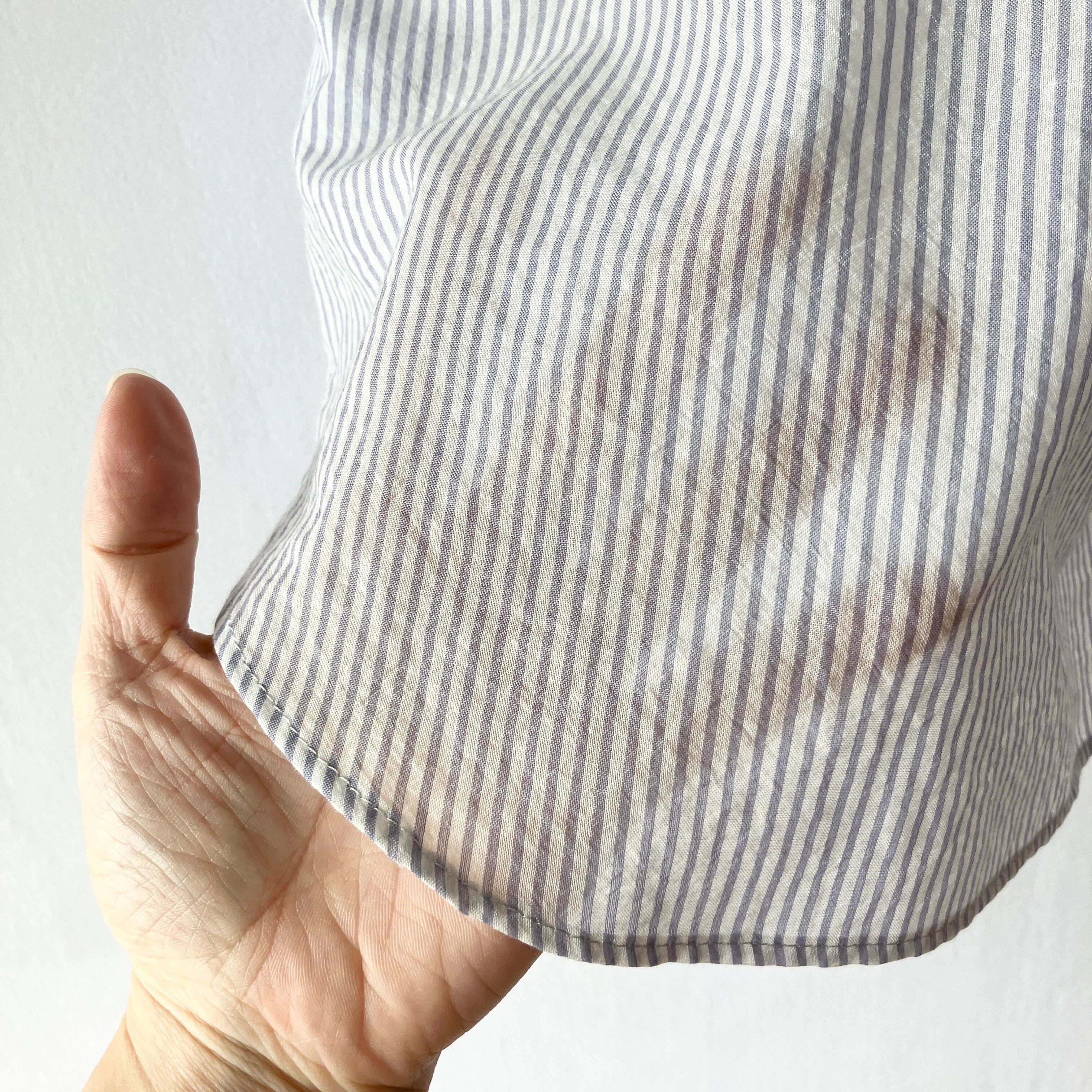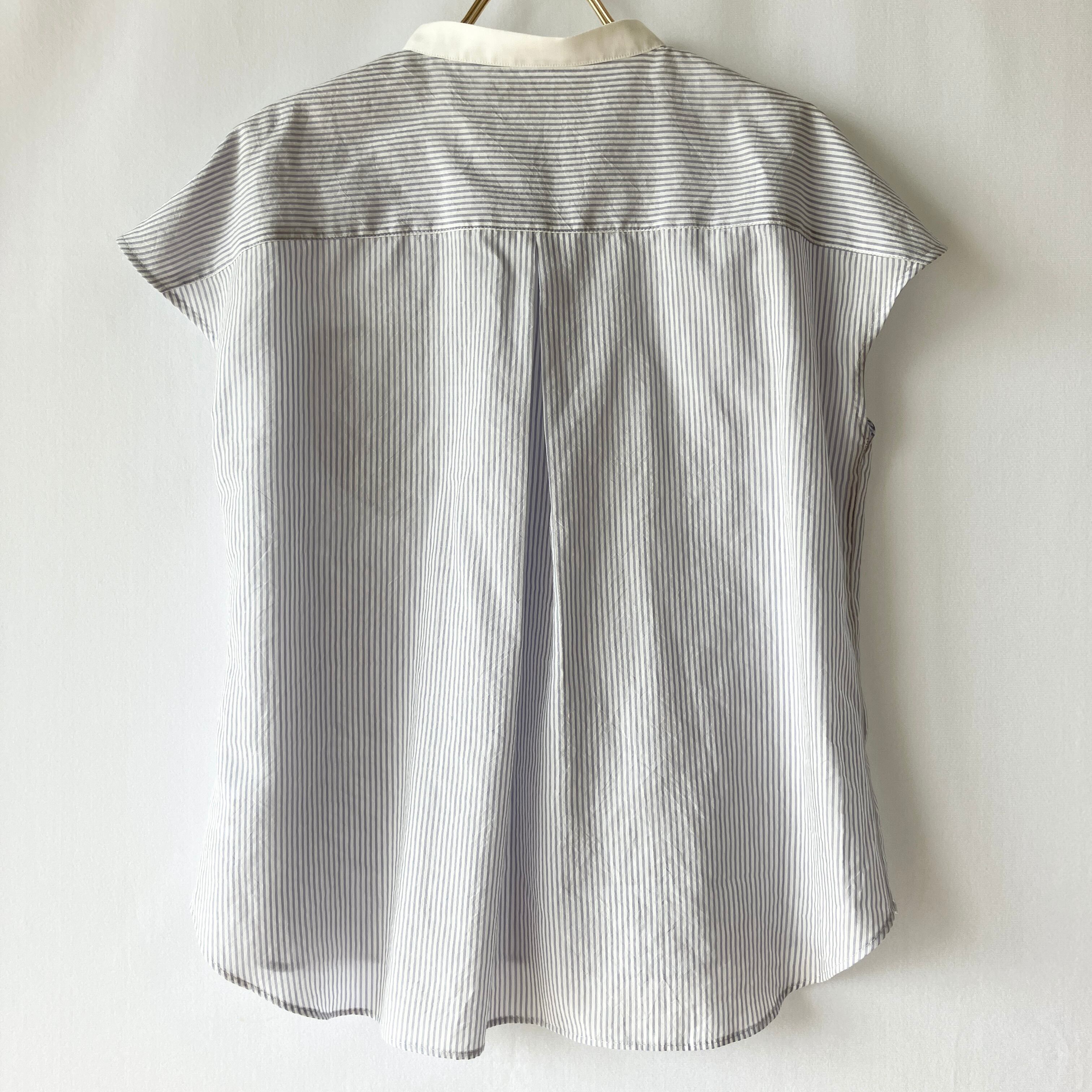シアー感のある水色&白のストライプの生地がとても素敵なフレンチスリーブ(半袖)のクレリックシャツブラウス。