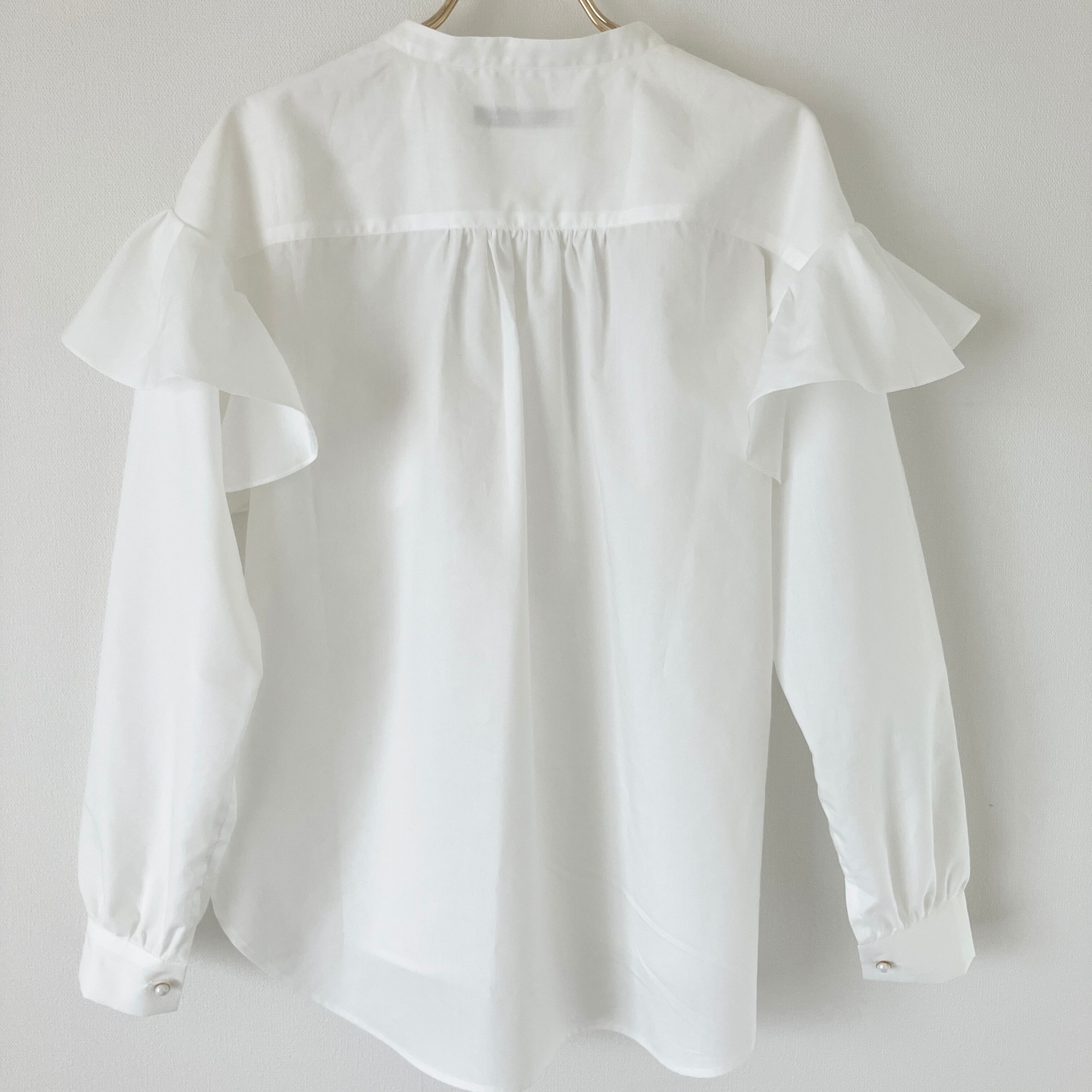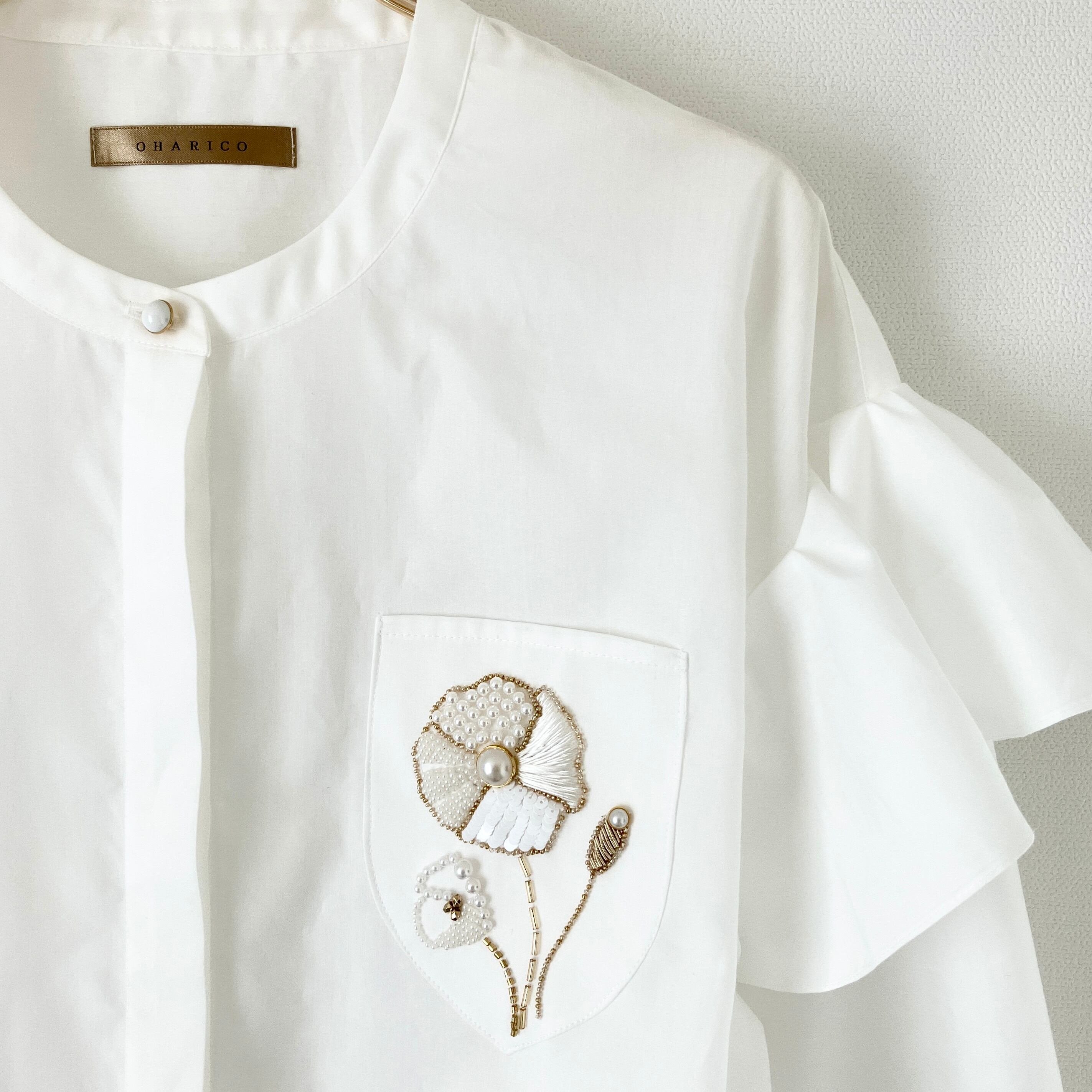 ヒナゲシの花をモチーフにした、ホワイトパールとゴールドの刺繍が上品に輝く素敵な肩フリルブラウス。