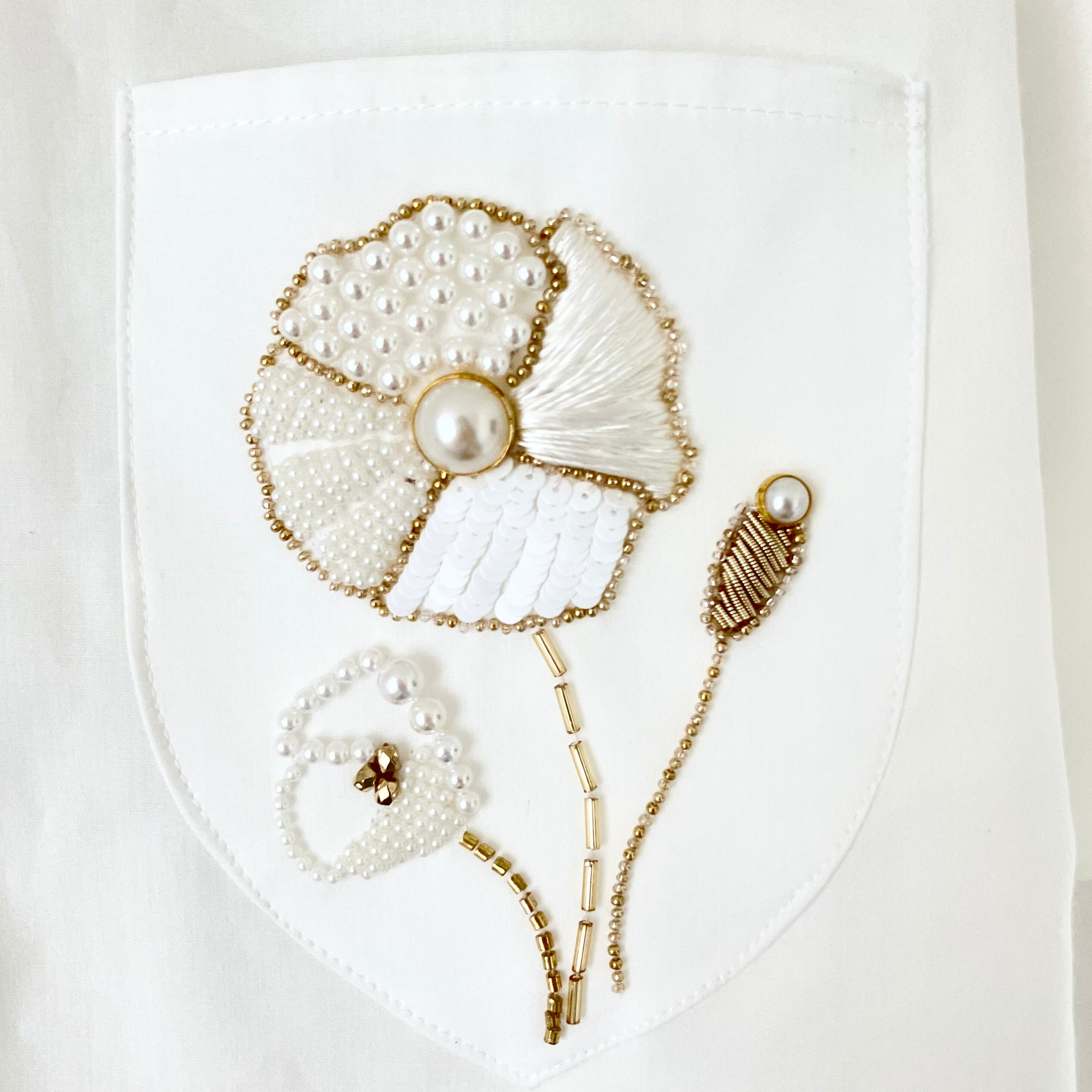 『肩フリルブラウス/長袖/白/ビーズ刺繍(ヒナゲシ白×金)』
