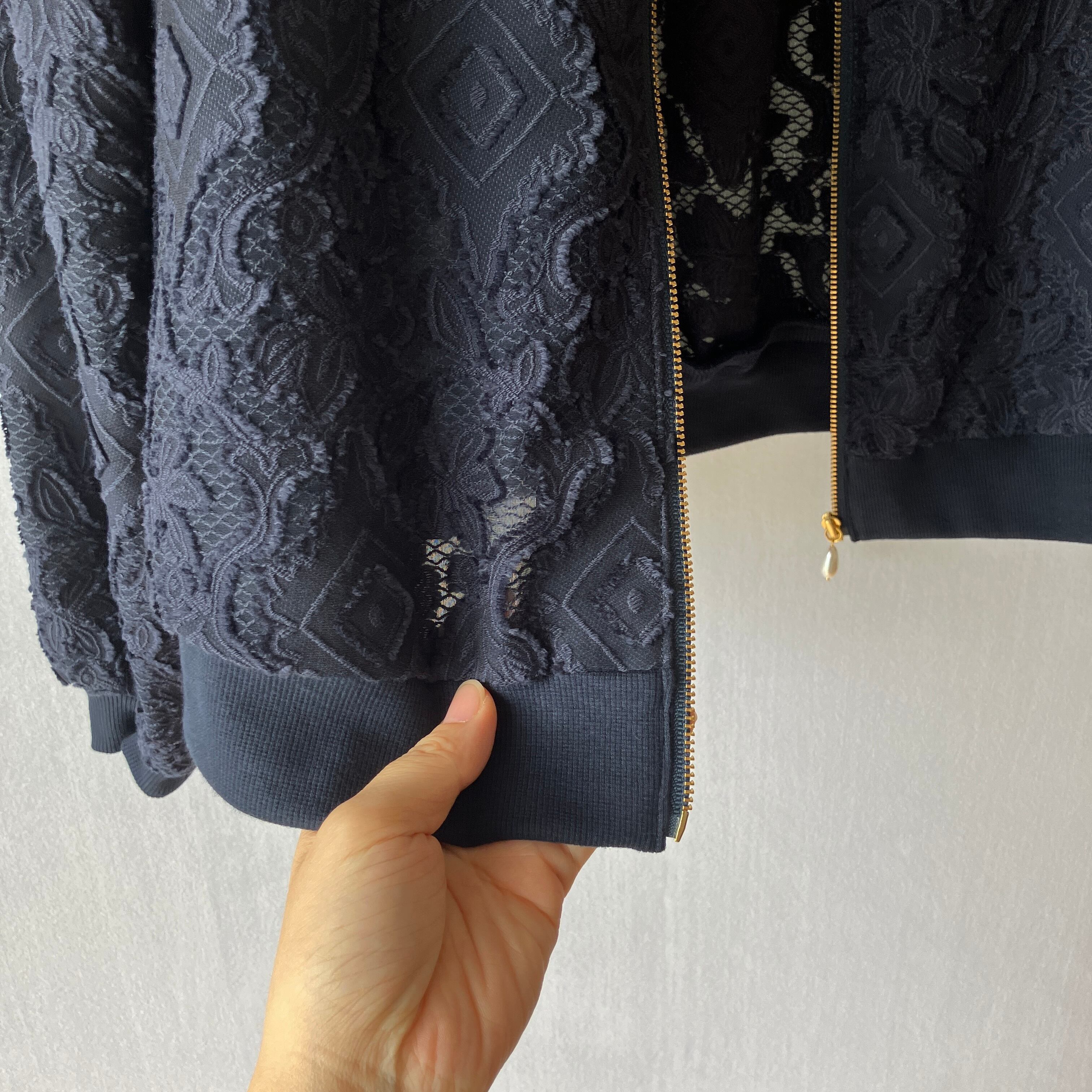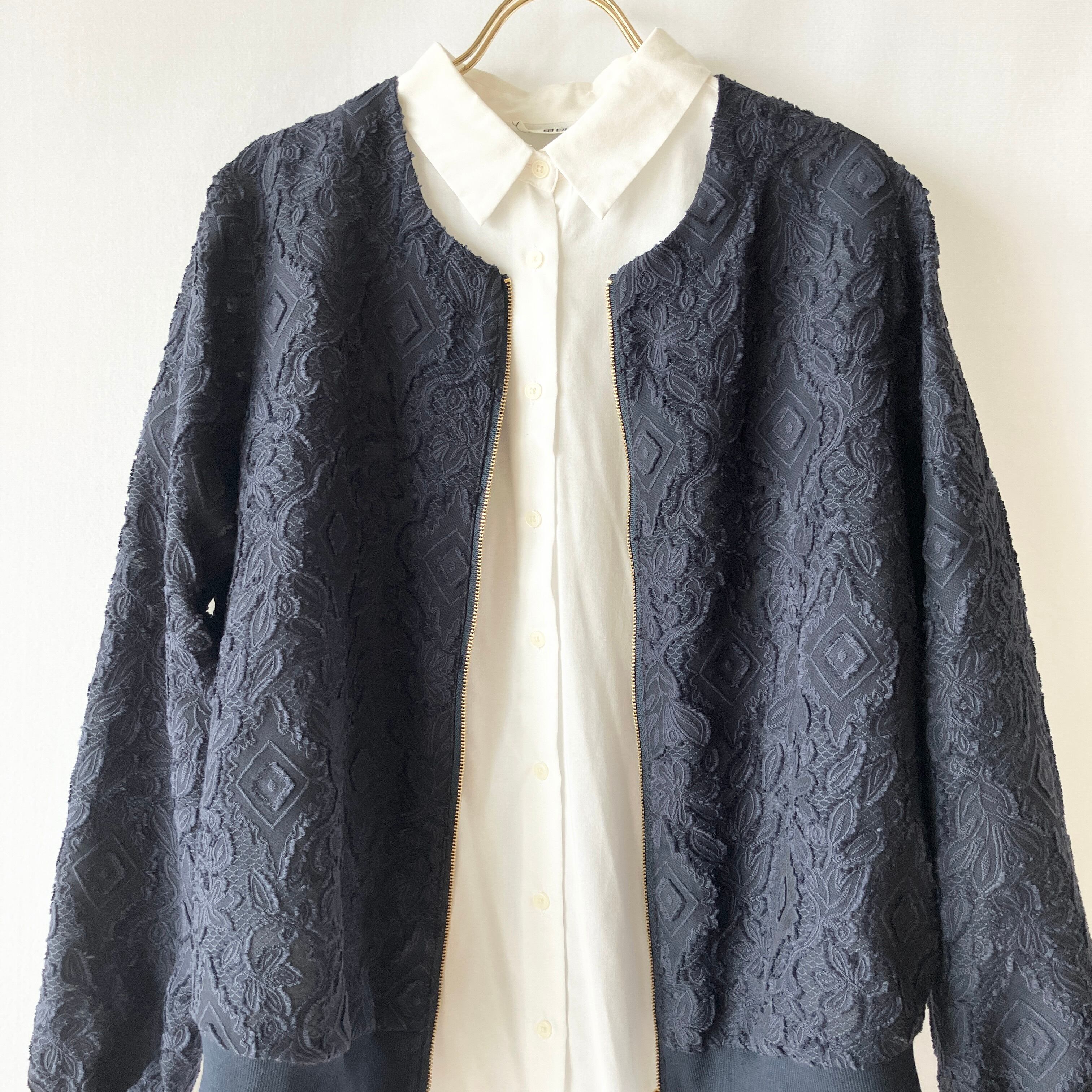 レースのノーカラーブルゾン【ネイビー(濃紺)×ゴールドファスナー(パールの引手)/MA1/裏なし/通気性】