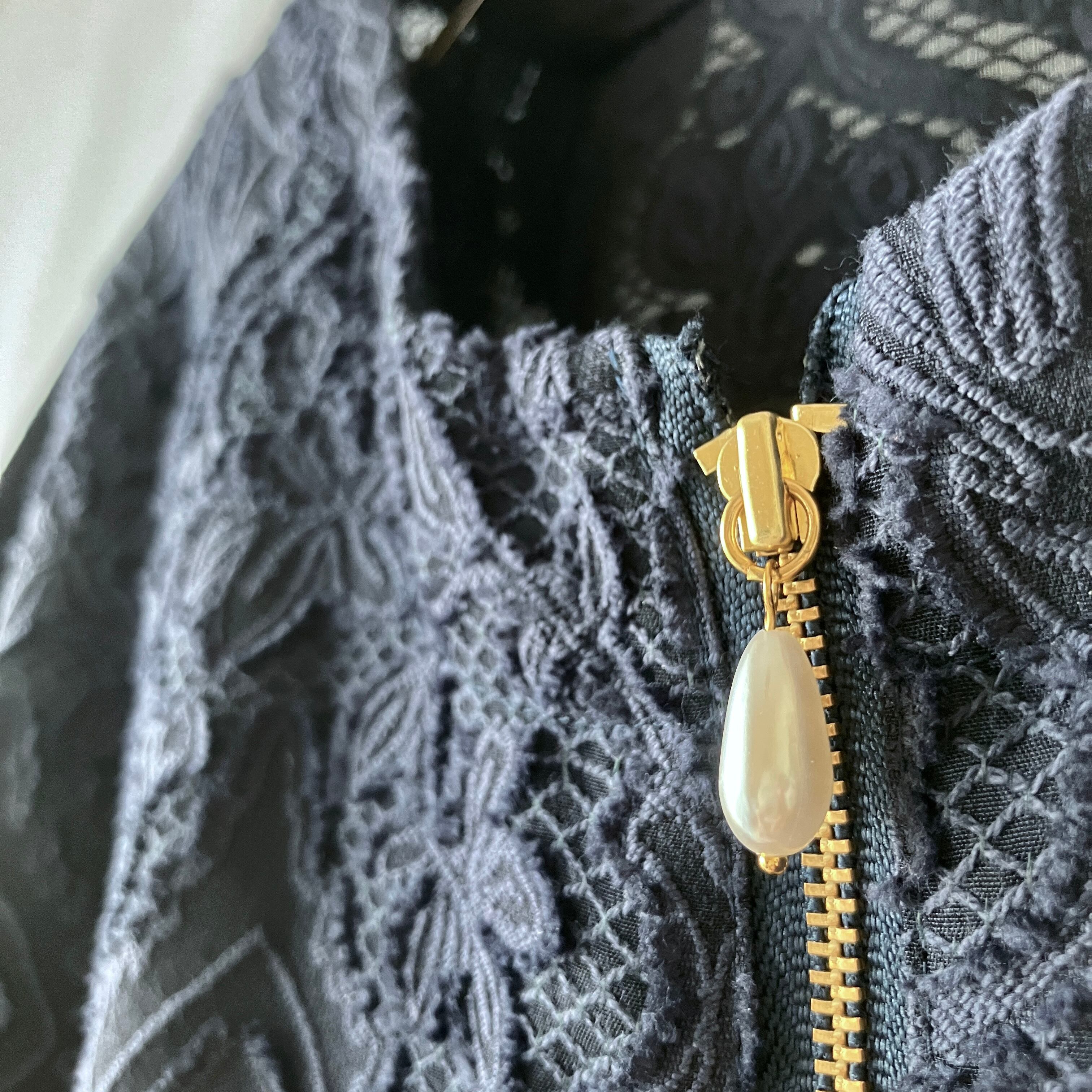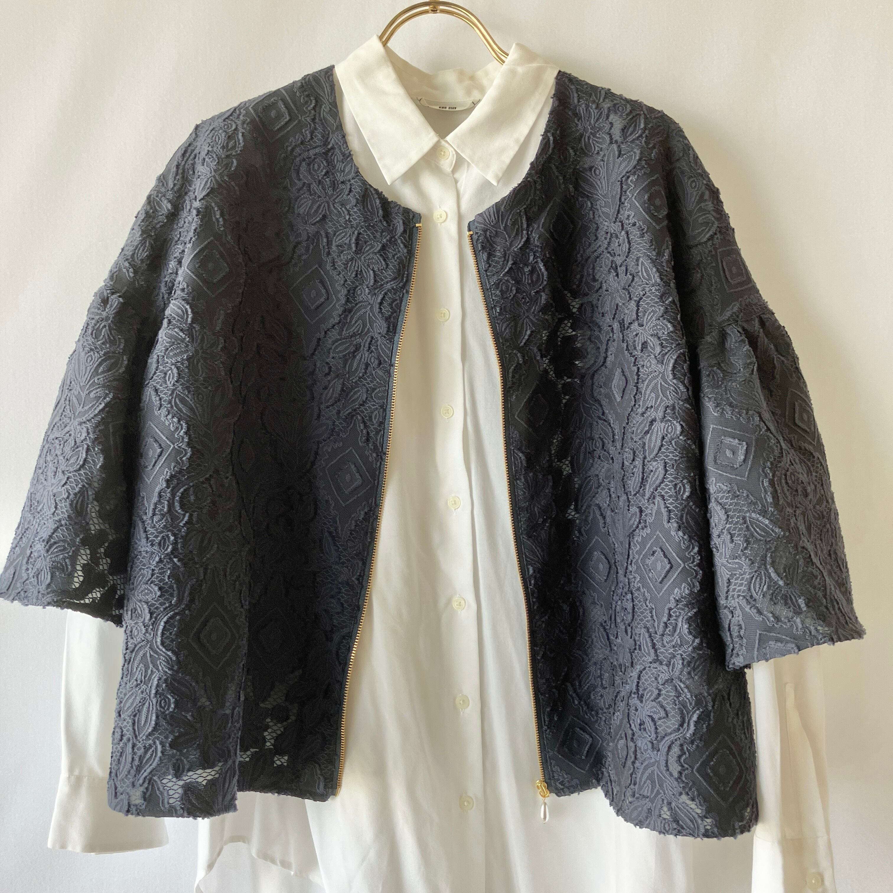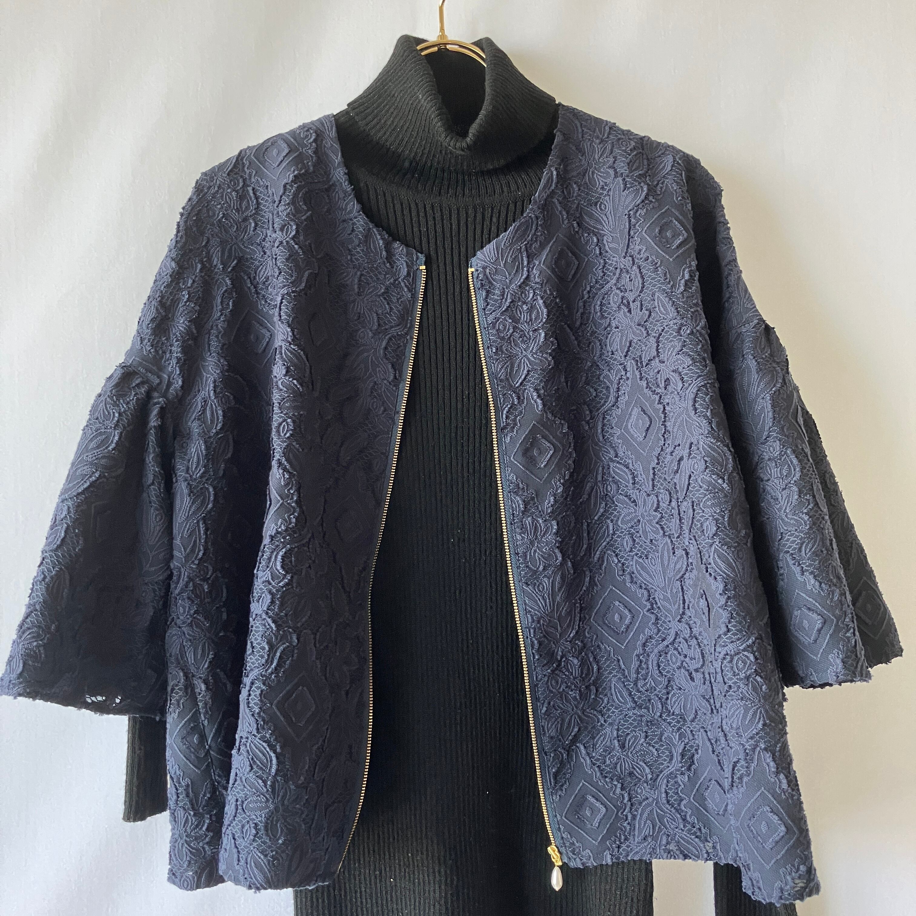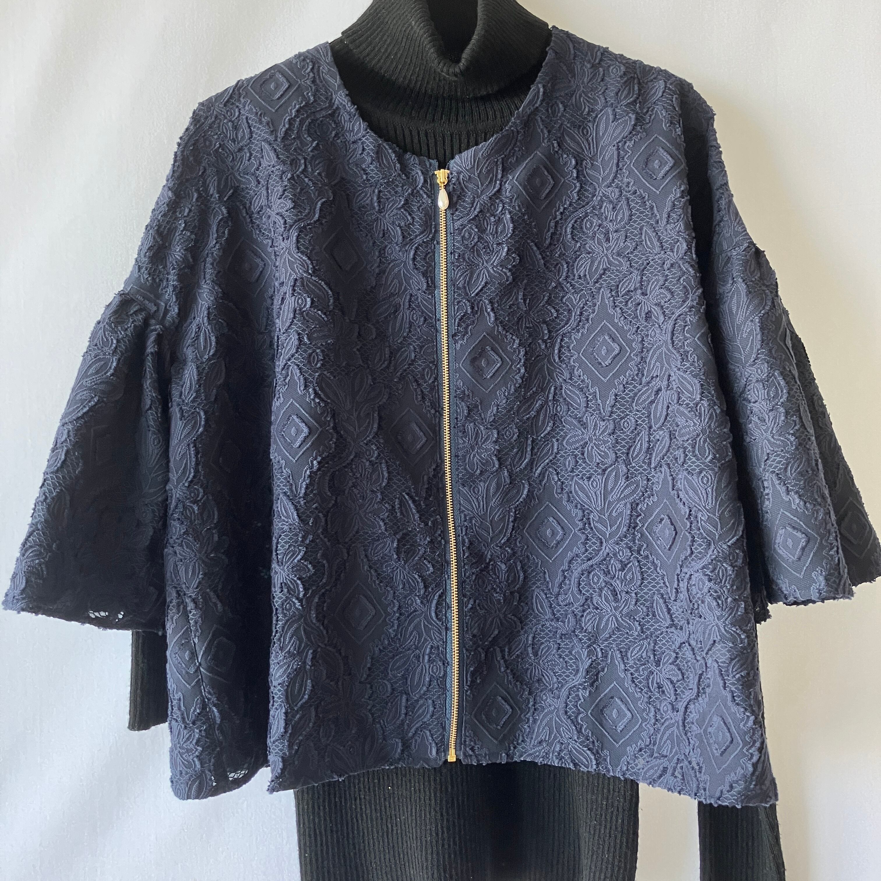 軽い♪レースのベル袖ノーカラージャケット【ネイビー×ゴールドファスナー(パールスライダー)/裏なし/衿なし/通気性】