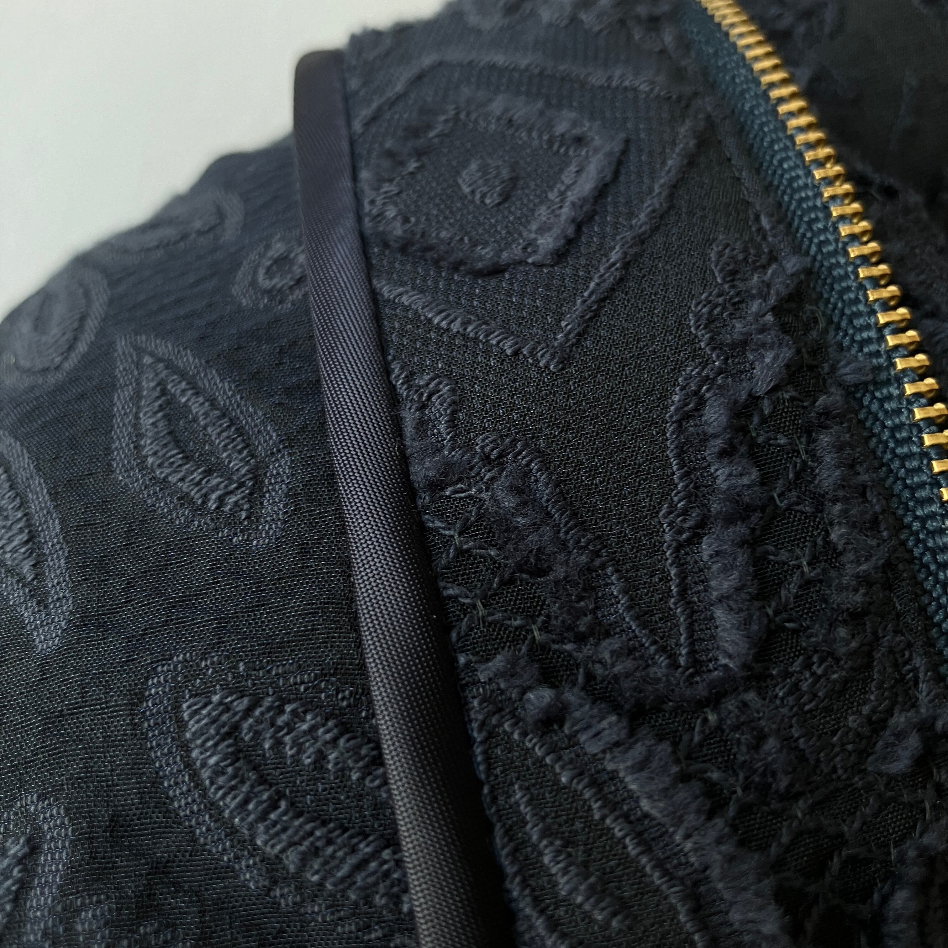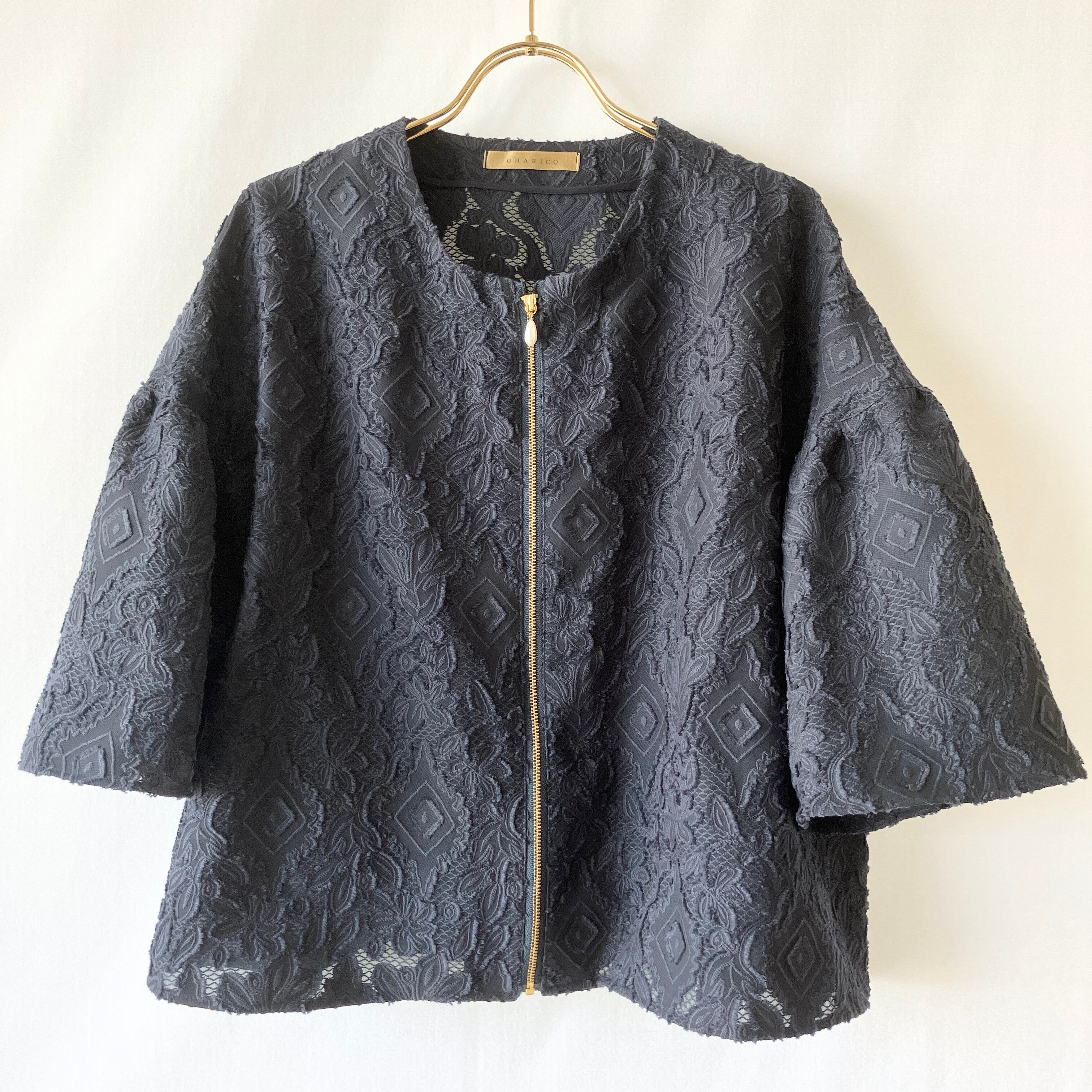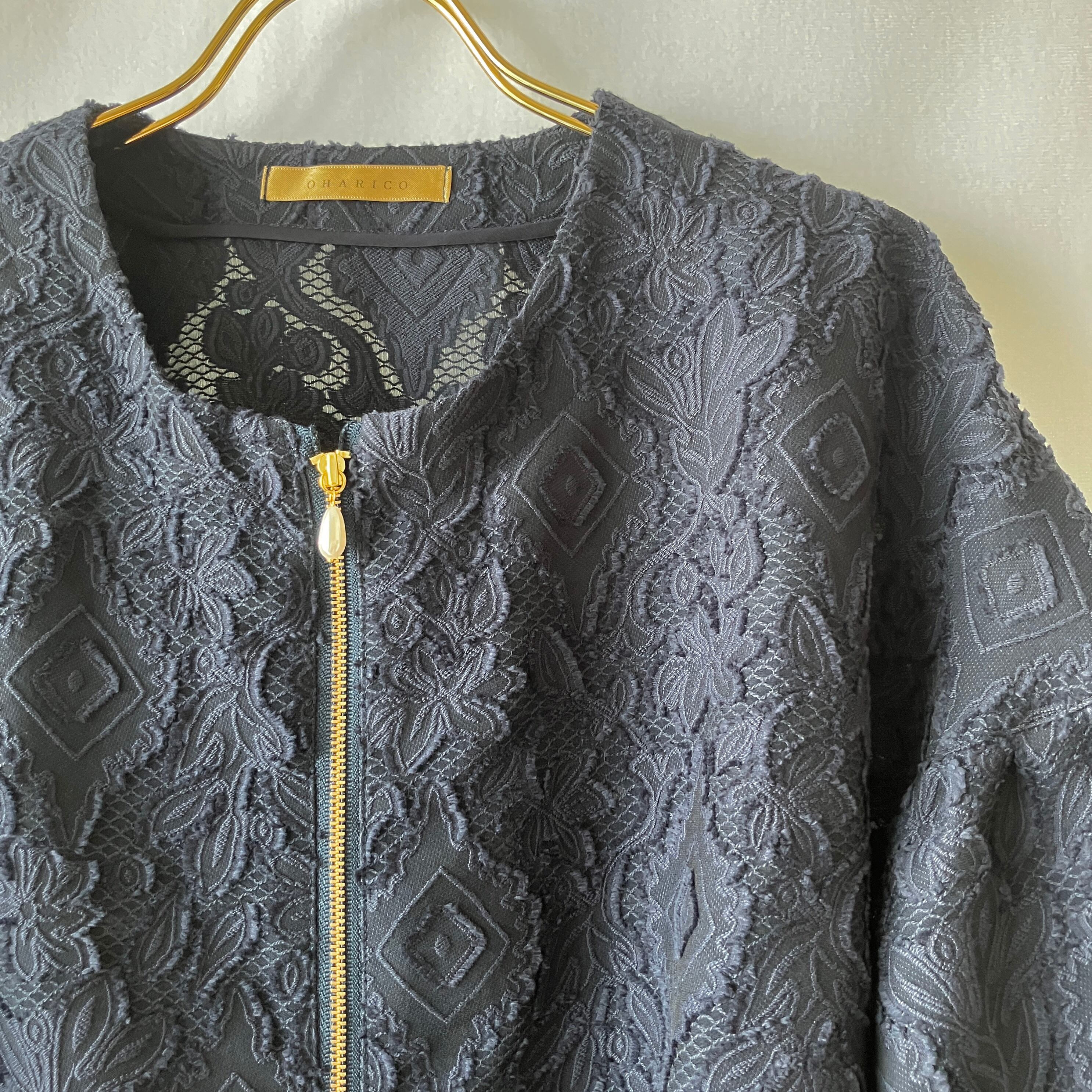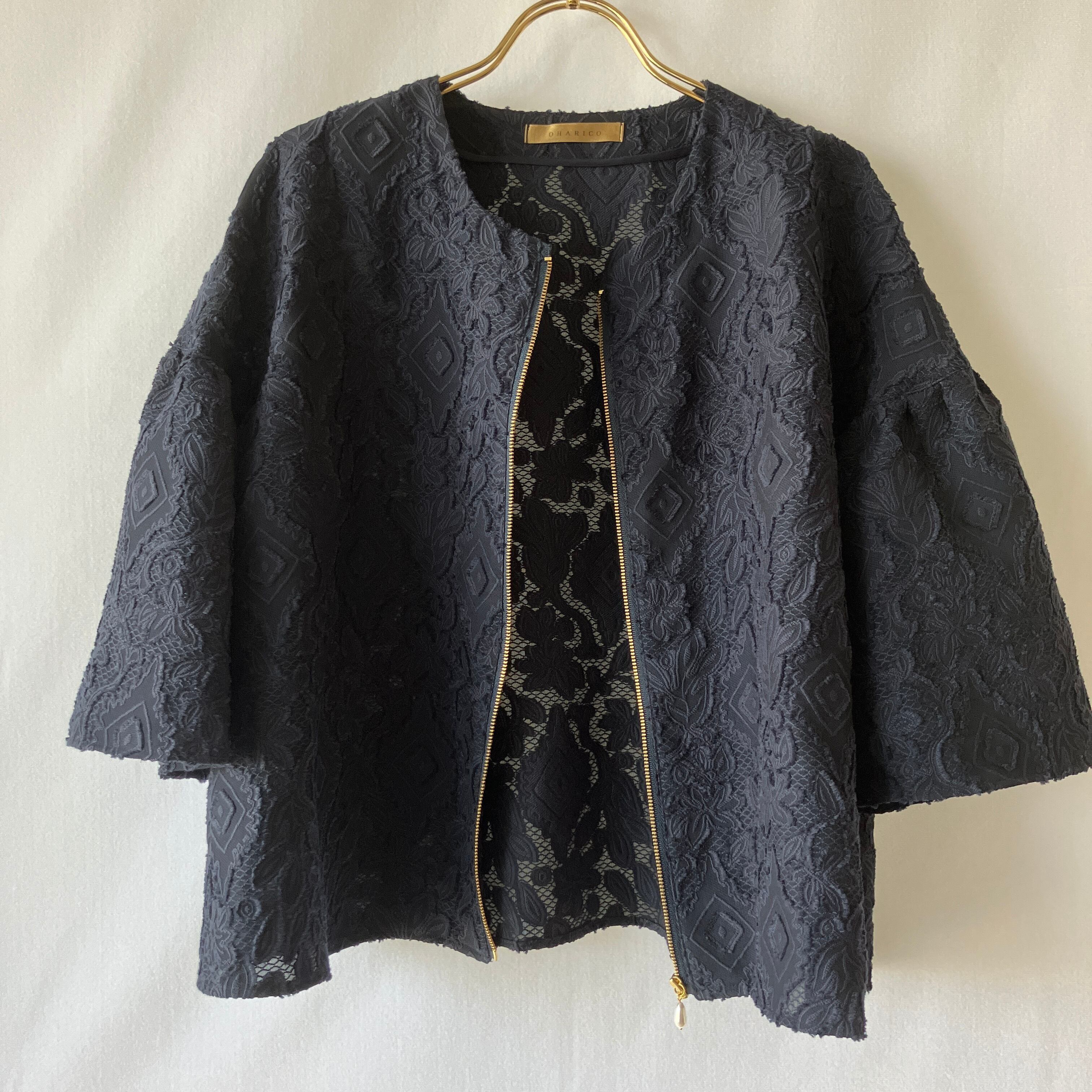 軽い♪レースのベル袖ノーカラージャケット【ネイビー×ゴールドファスナー(パールスライダー)/裏なし/衿なし/通気性】