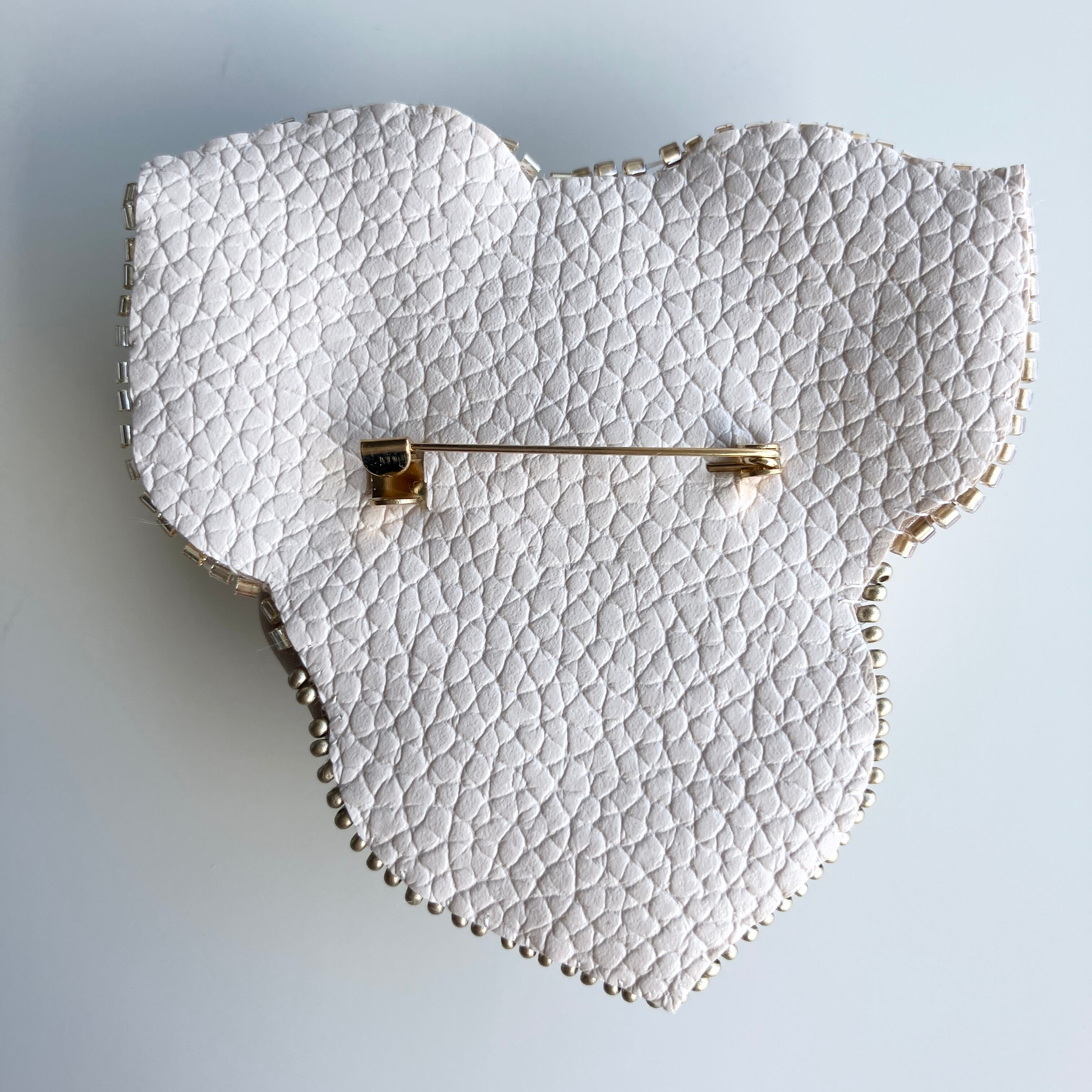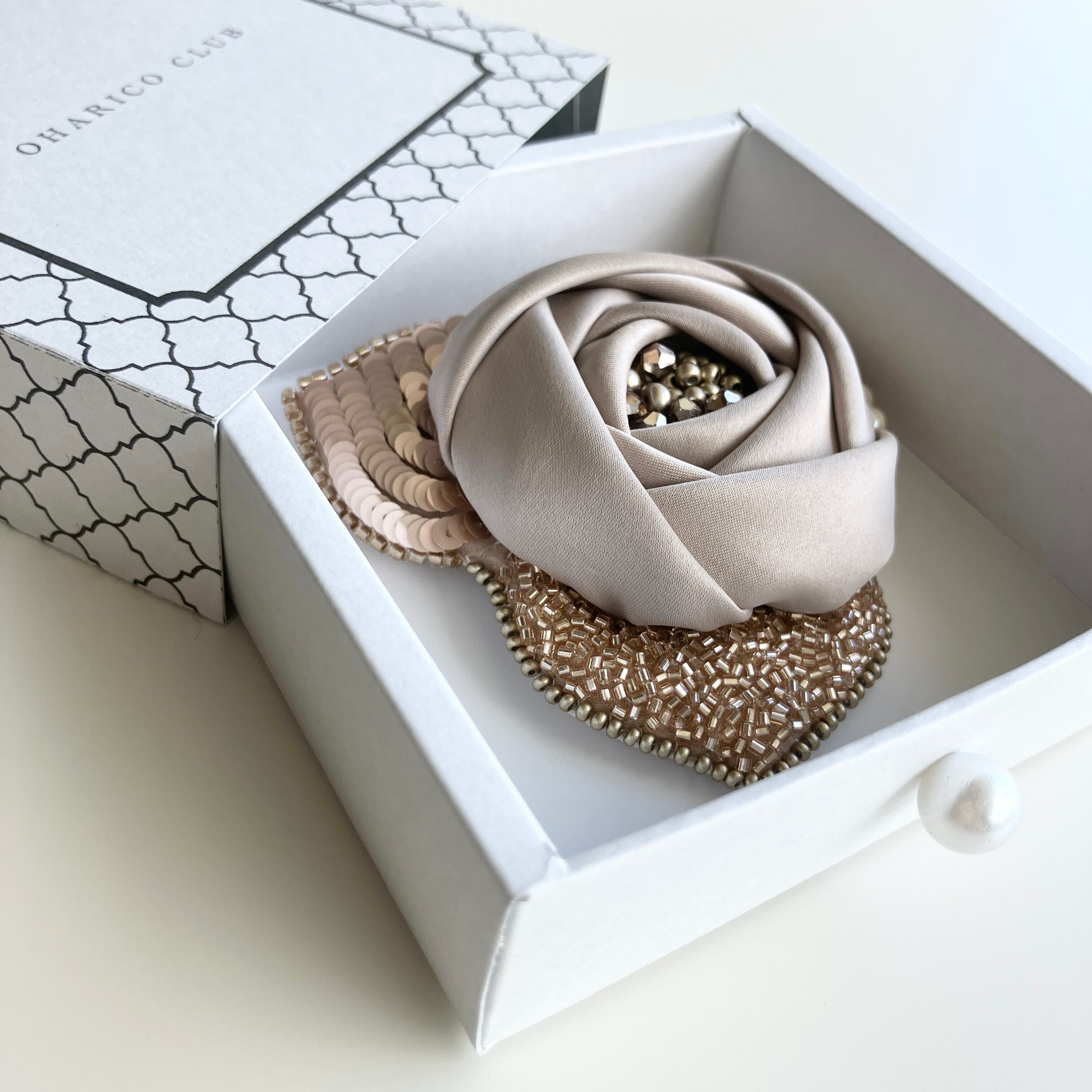 オートクチュール刺繍技法を使った手刺繍で、ひとつひとつ丁寧に仕上げ、ビーズ刺繍のコサージュとして仕立てています。