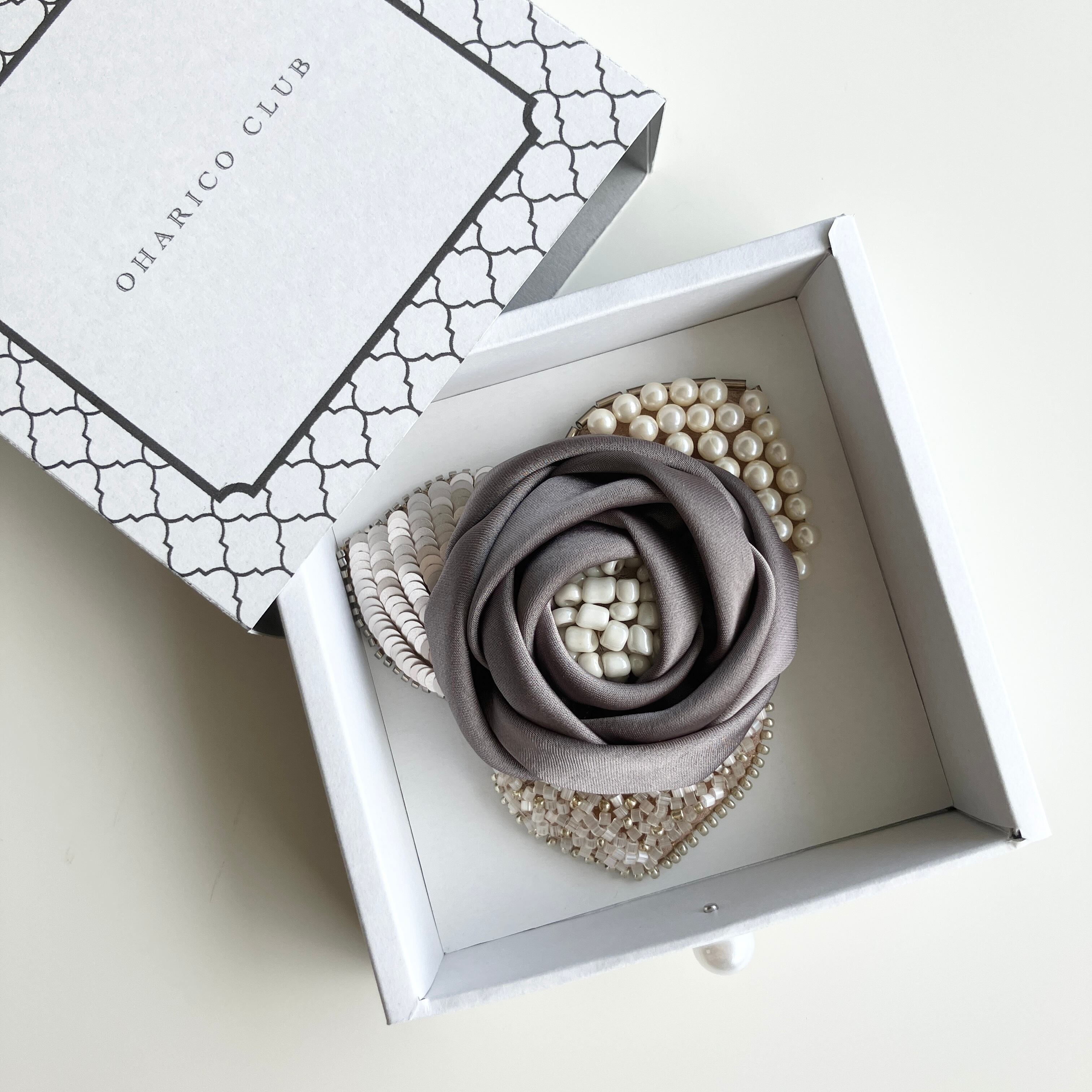 オートクチュール刺繍技法を使った手刺繍で、ひとつひとつ丁寧に仕上げ、ビーズ刺繍のコサージュとして仕立てています。