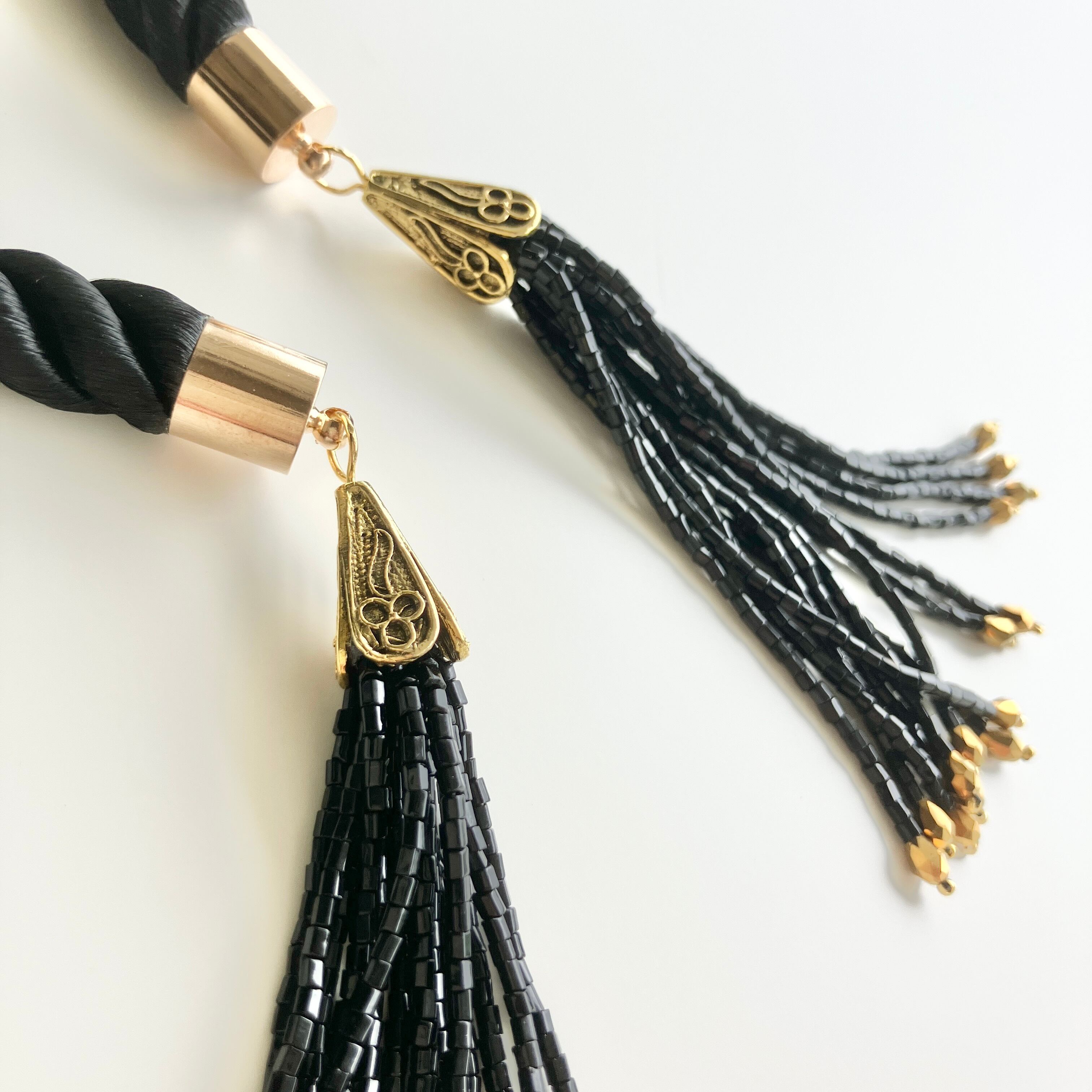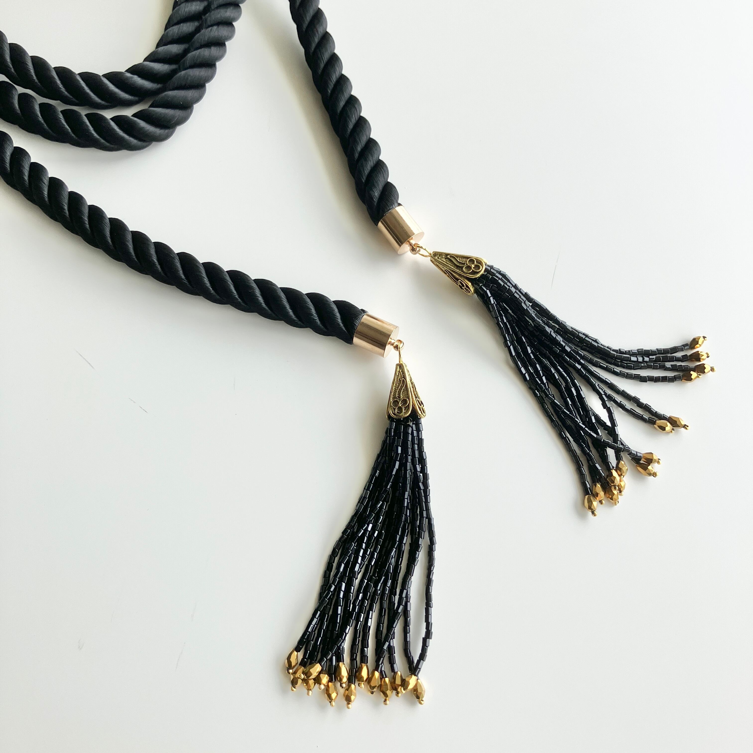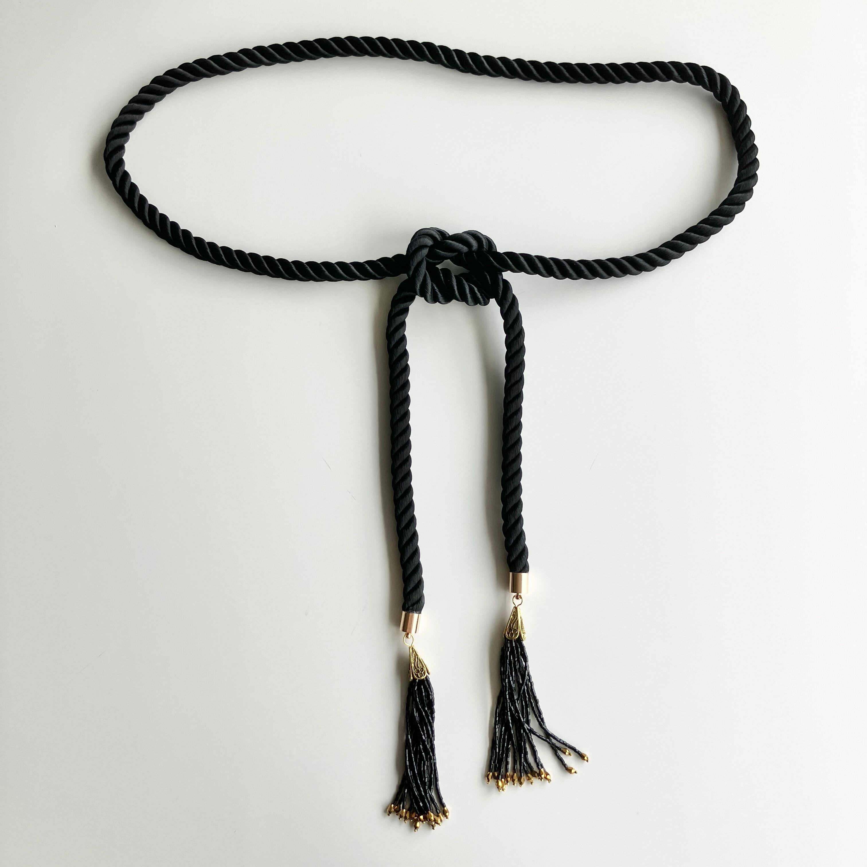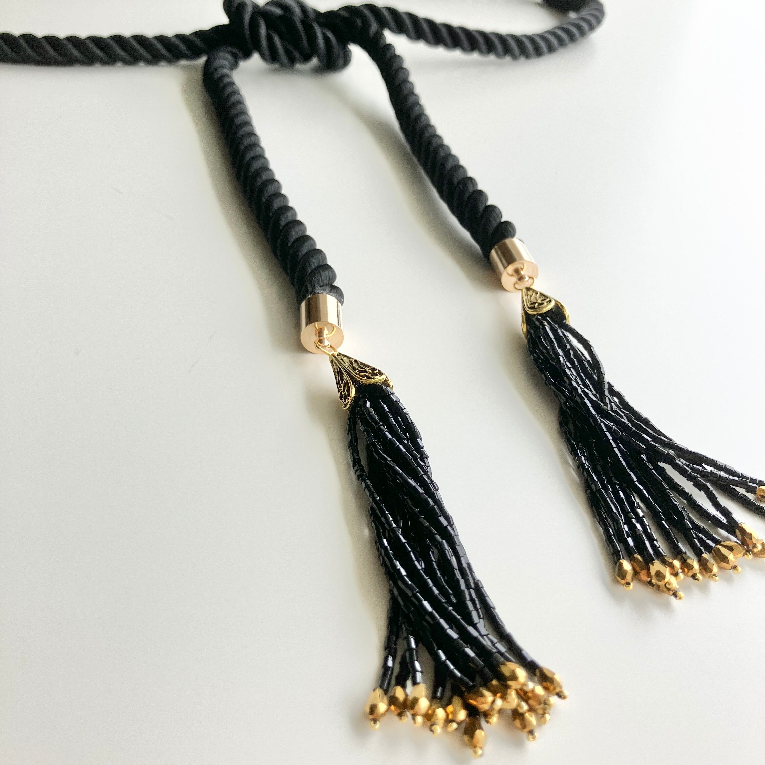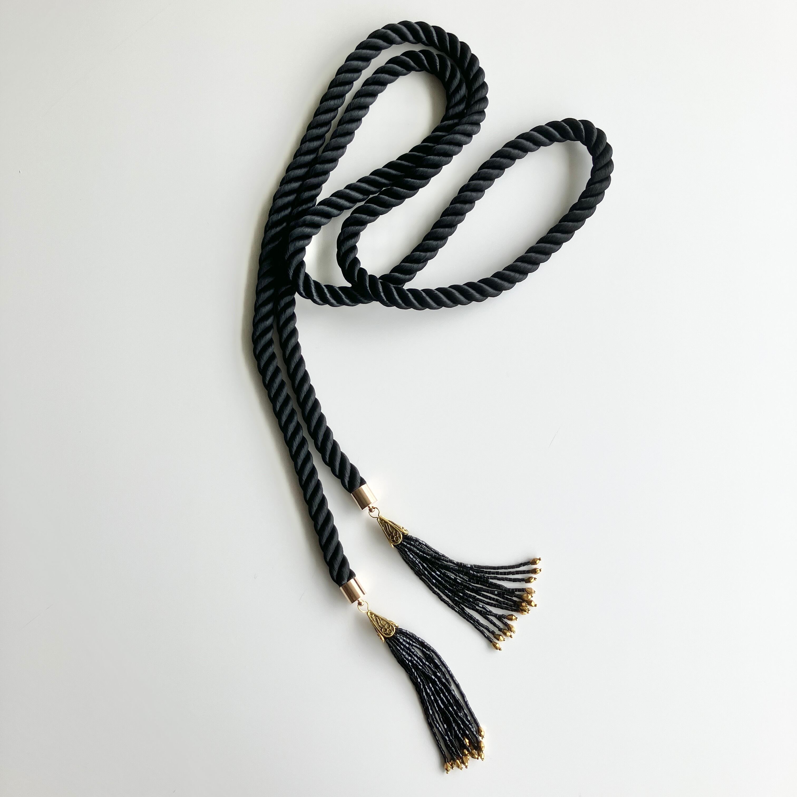 アンティーク風/ビーズタッセルの紐ベルト【ブラック×アンティークゴールド(黒×金)/10mmベルト/レトロ】