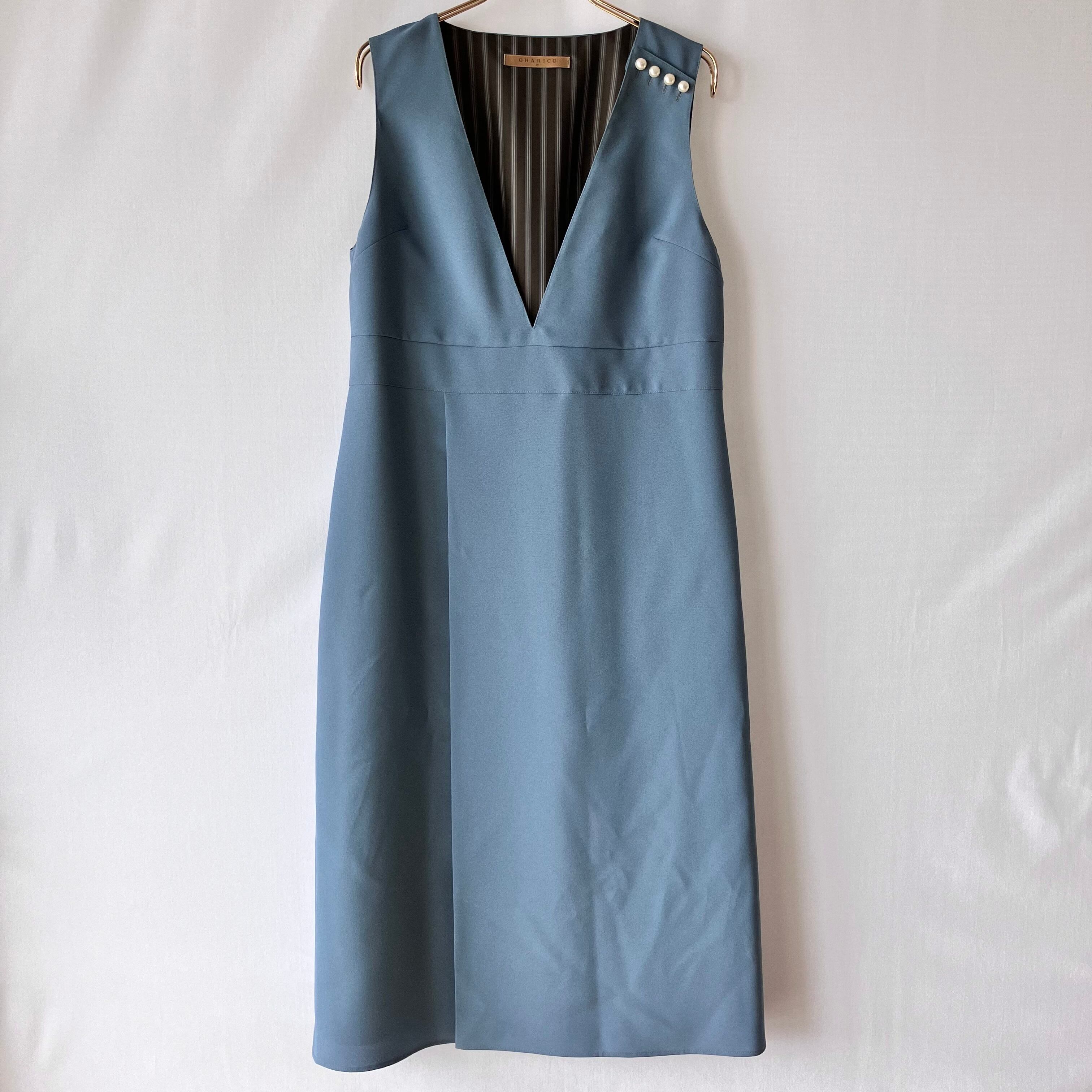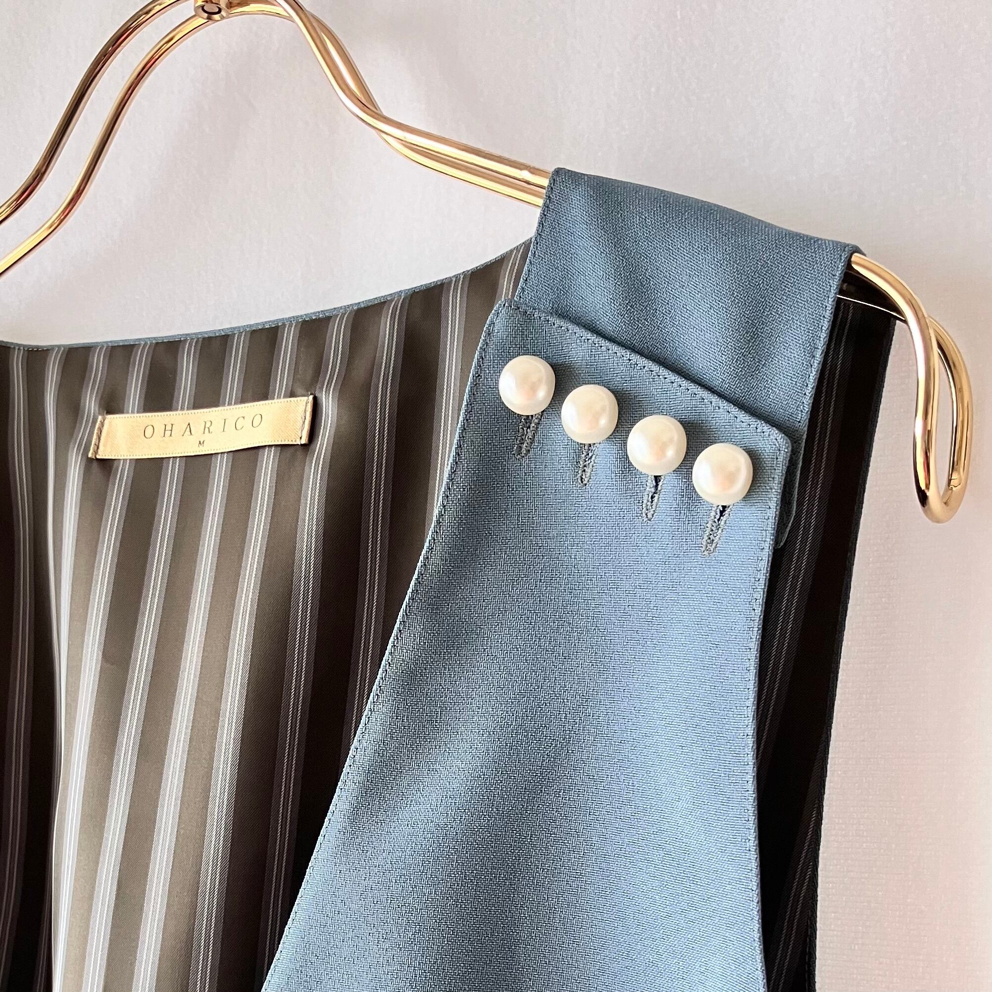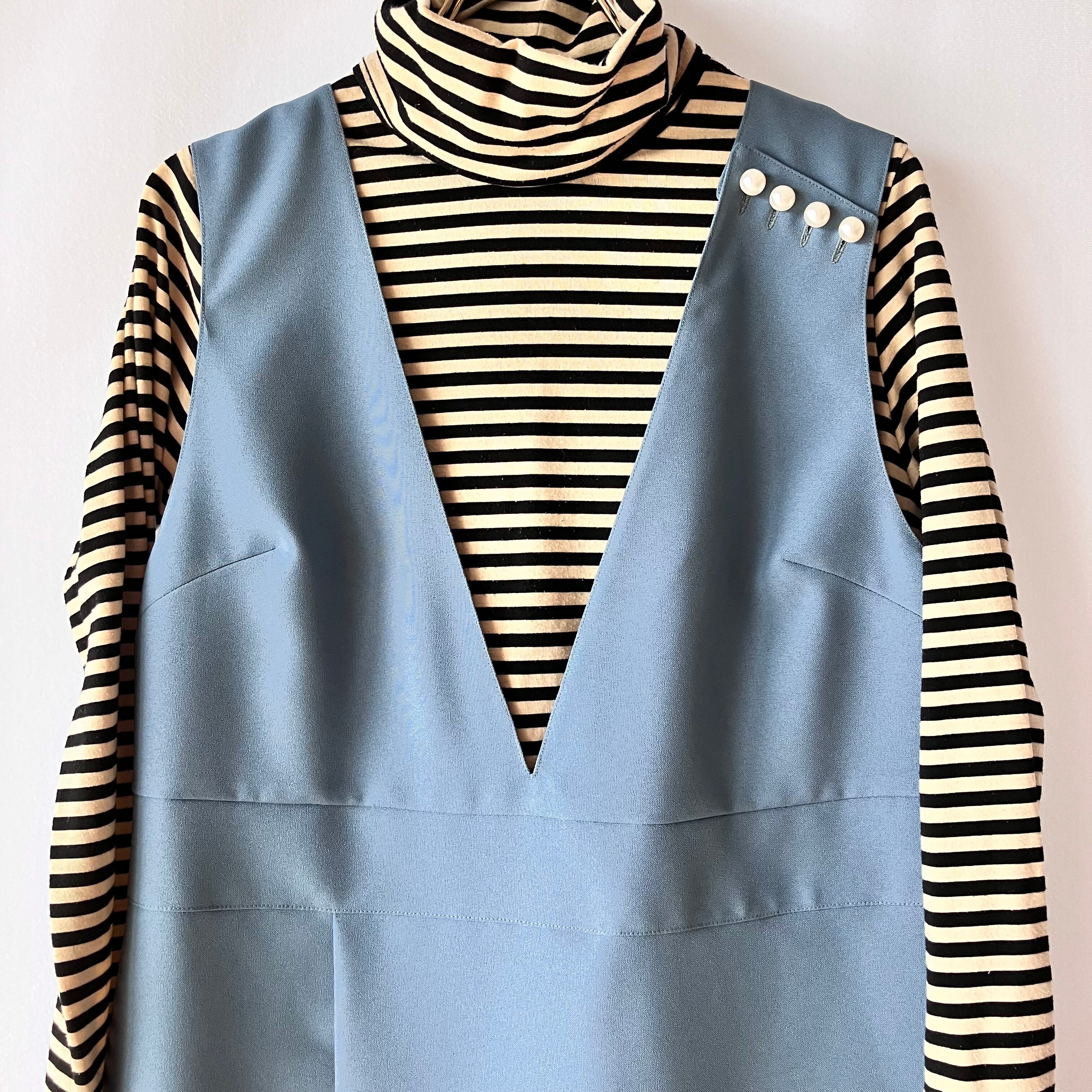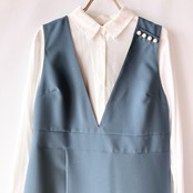このジャンパースカートにぴったりのなアクセサリー、それはパールネックレス。Vネックの空きに合わせた、大きなひと粒パールネックレス(別売)もおすすめです。