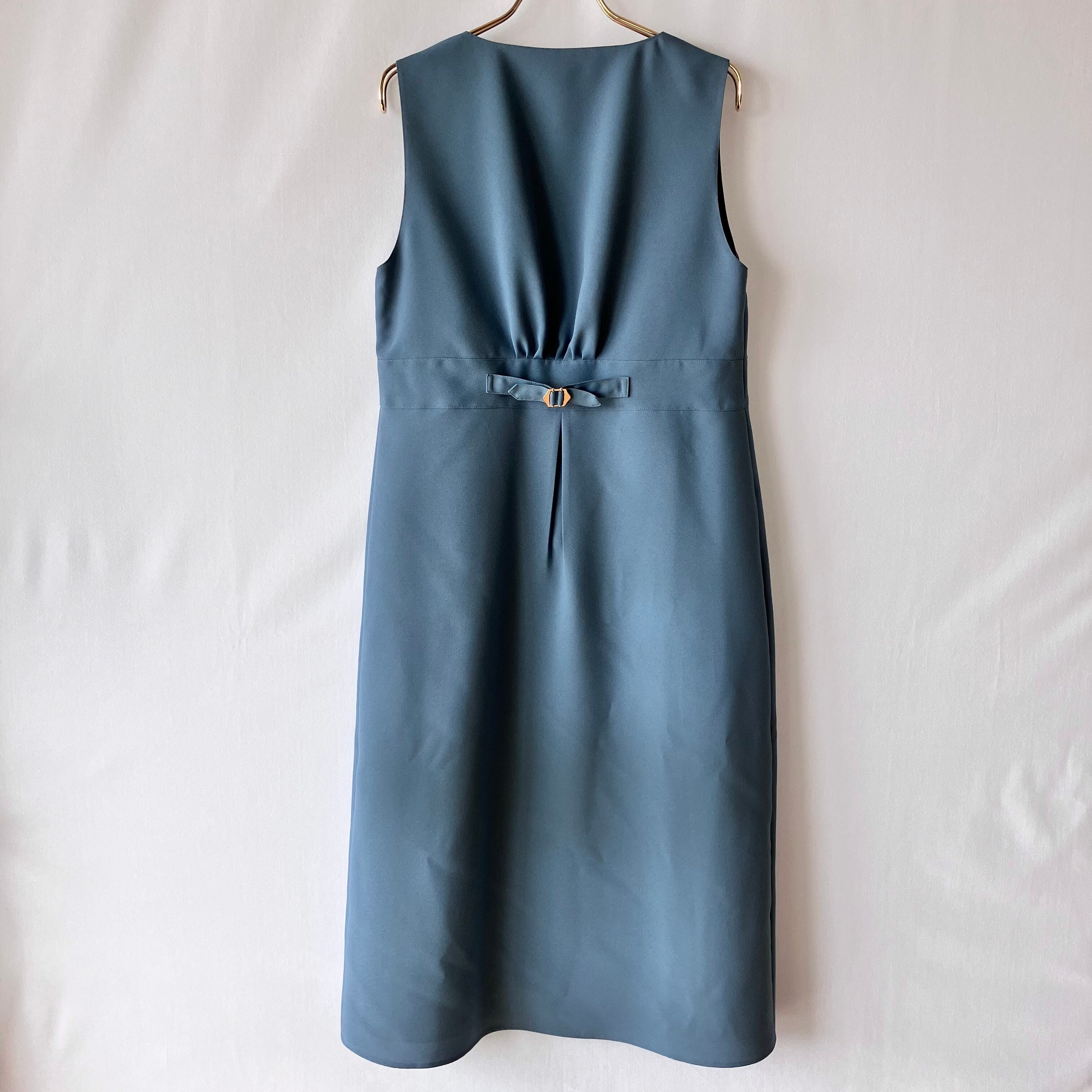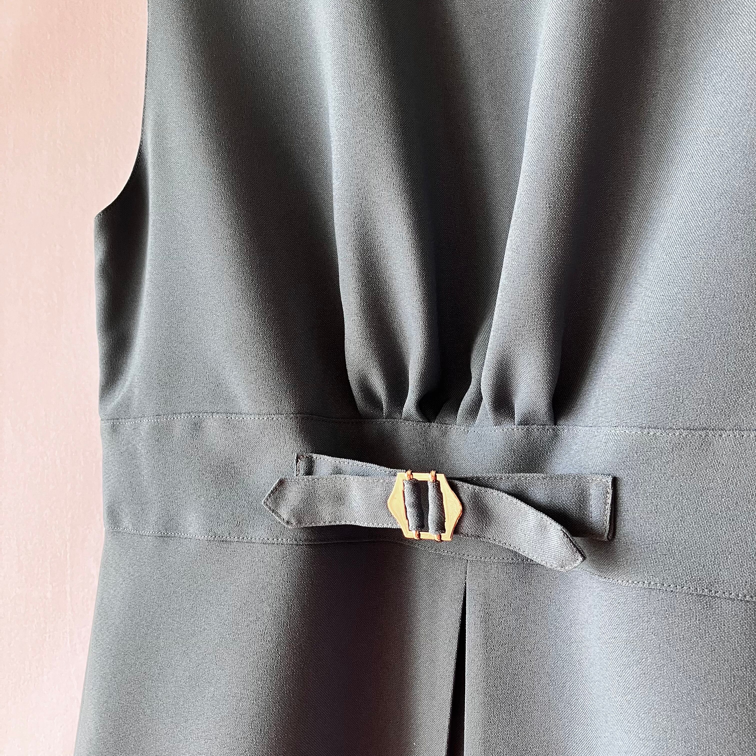 後ろのウエスト部分にベルトがあるので、ちょっとウエストに絞りを入れたいな、という時に締めてみてください。これだけで、ぐっと女性らしくスタイルアップに。
