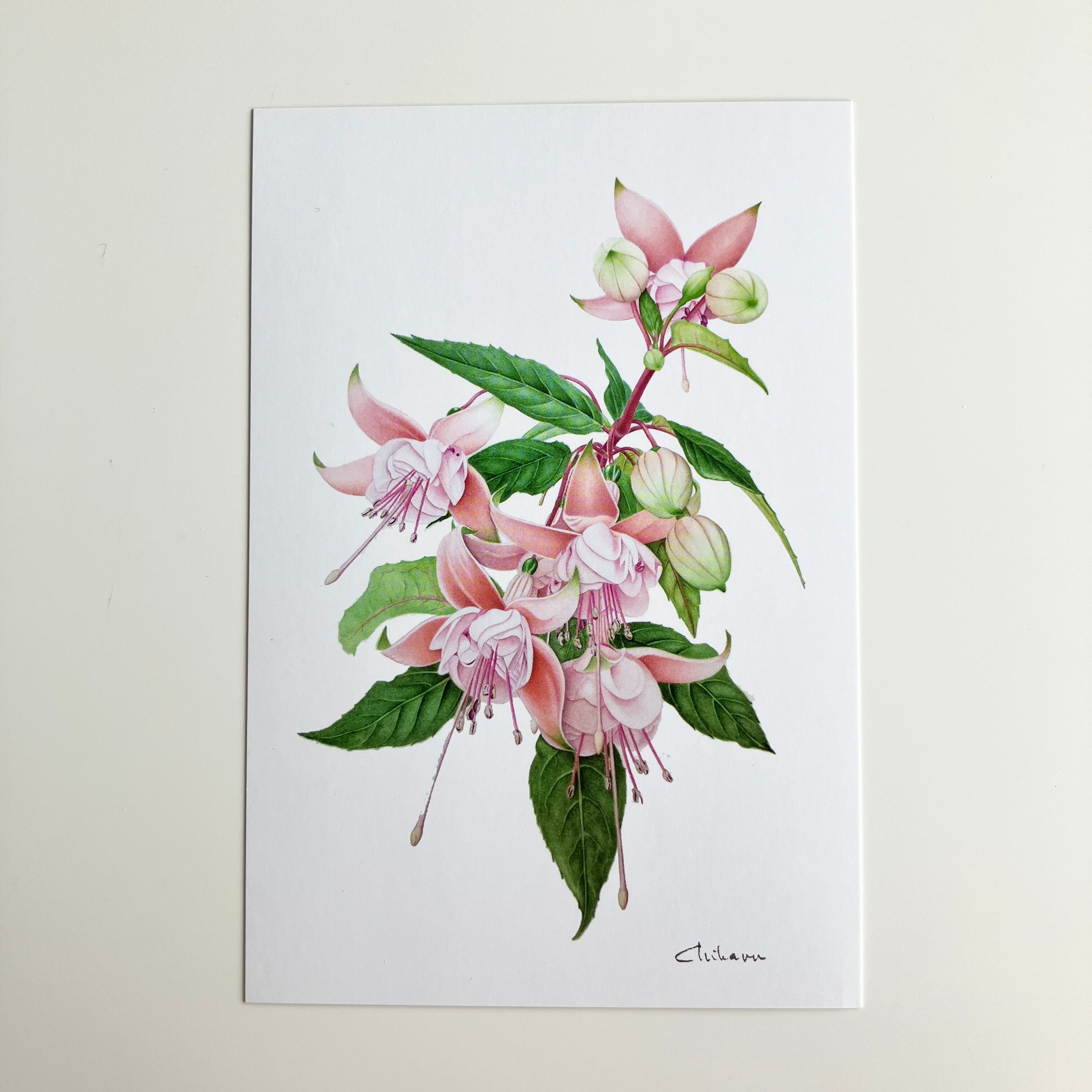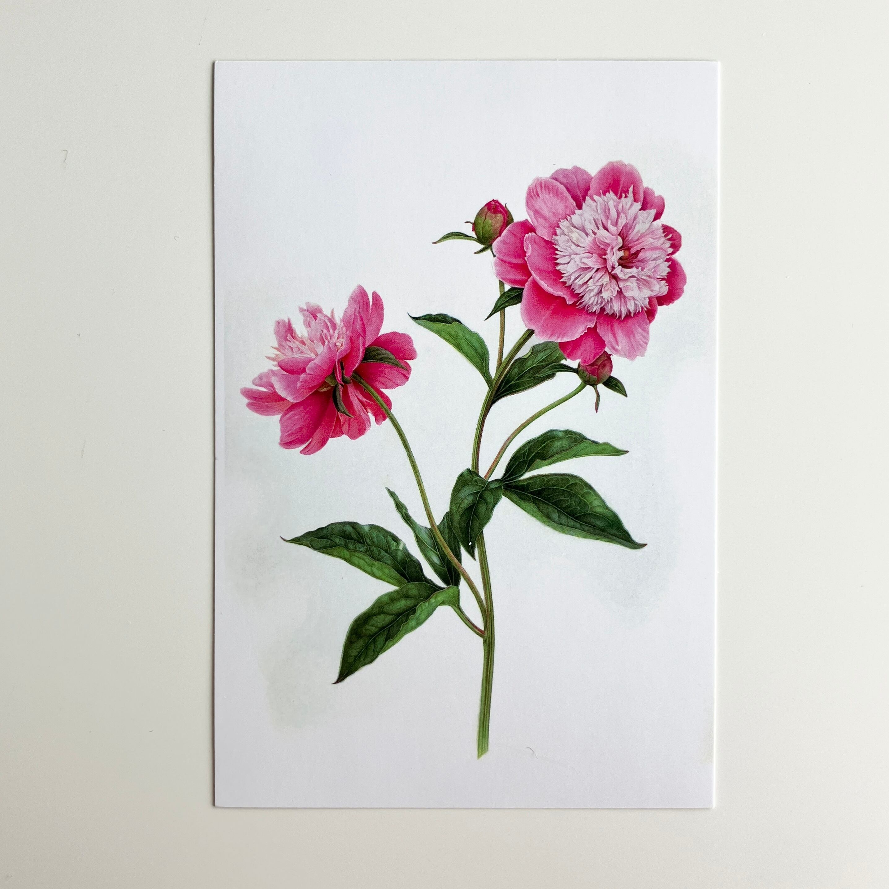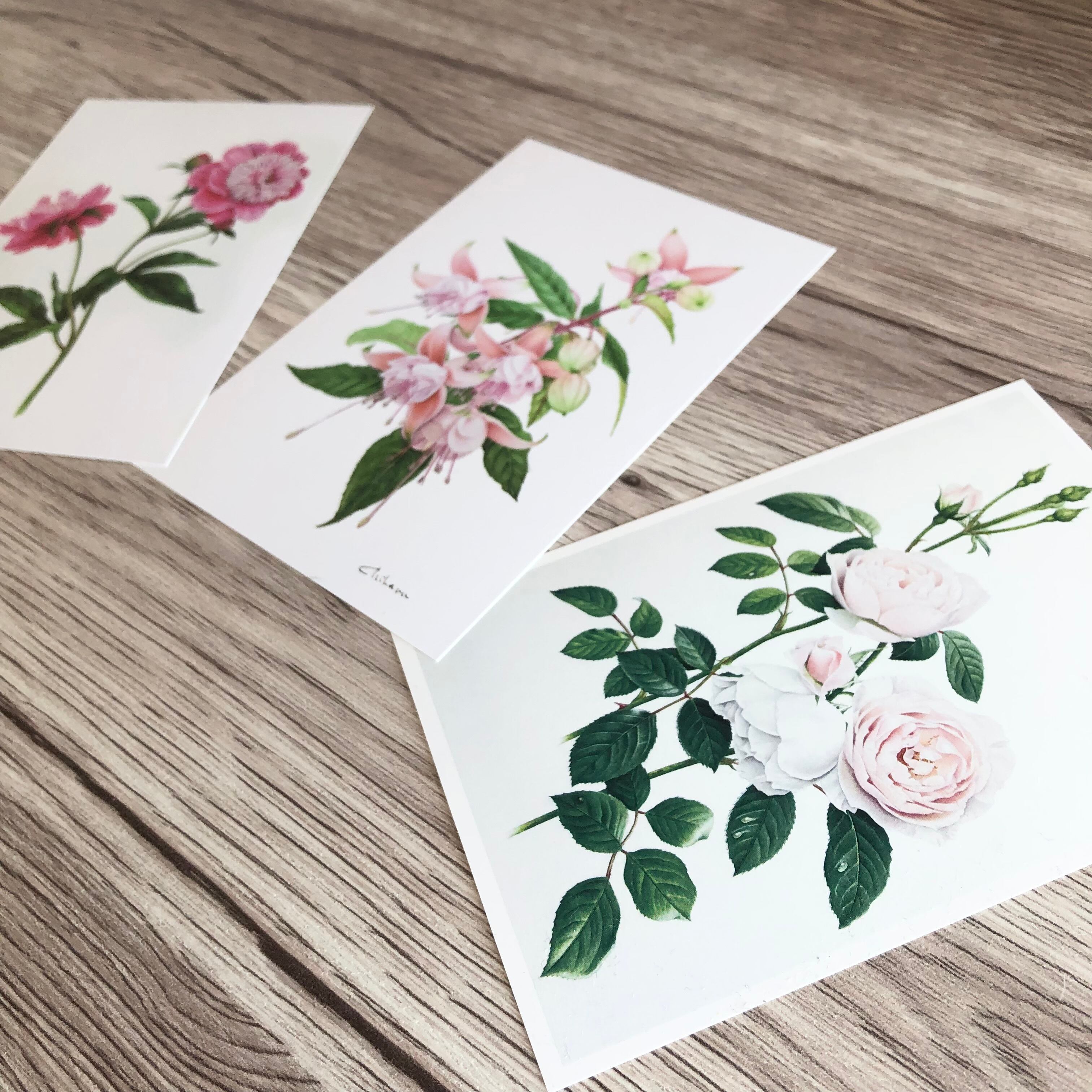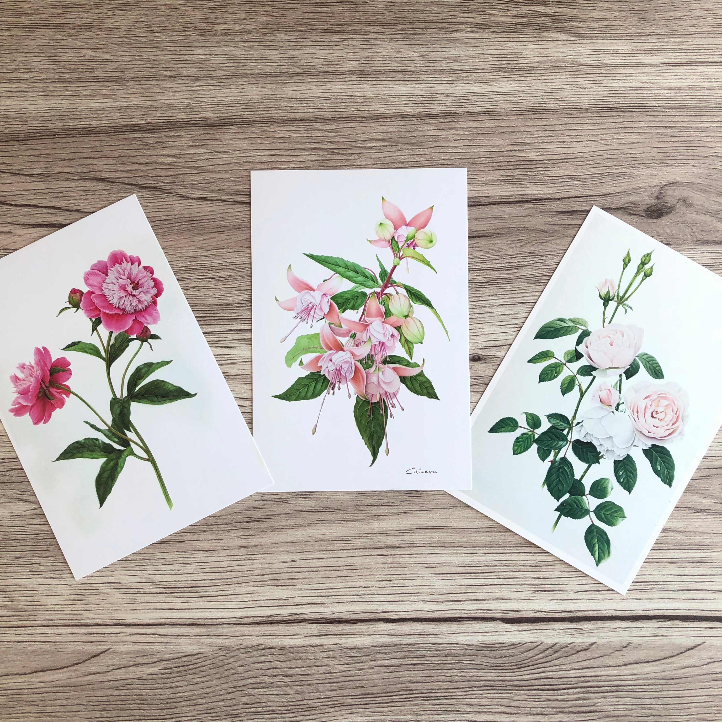 【ボタニカルアート】ポストカード3枚セット(芍薬/フクシア/デスデモーナ(ピンクのバラ))