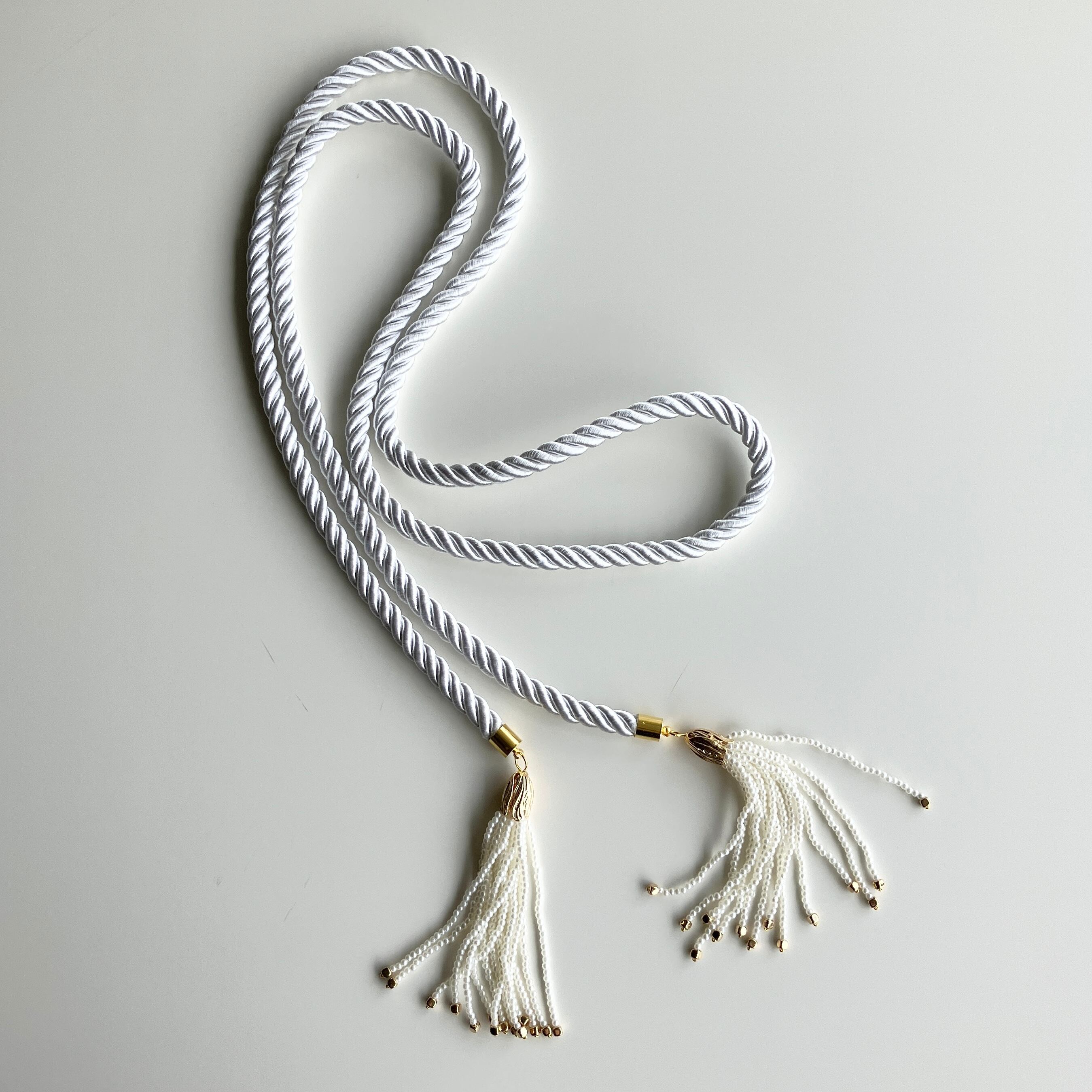 腰元で上品なパールタッセルがゆらめく紐ベルト。