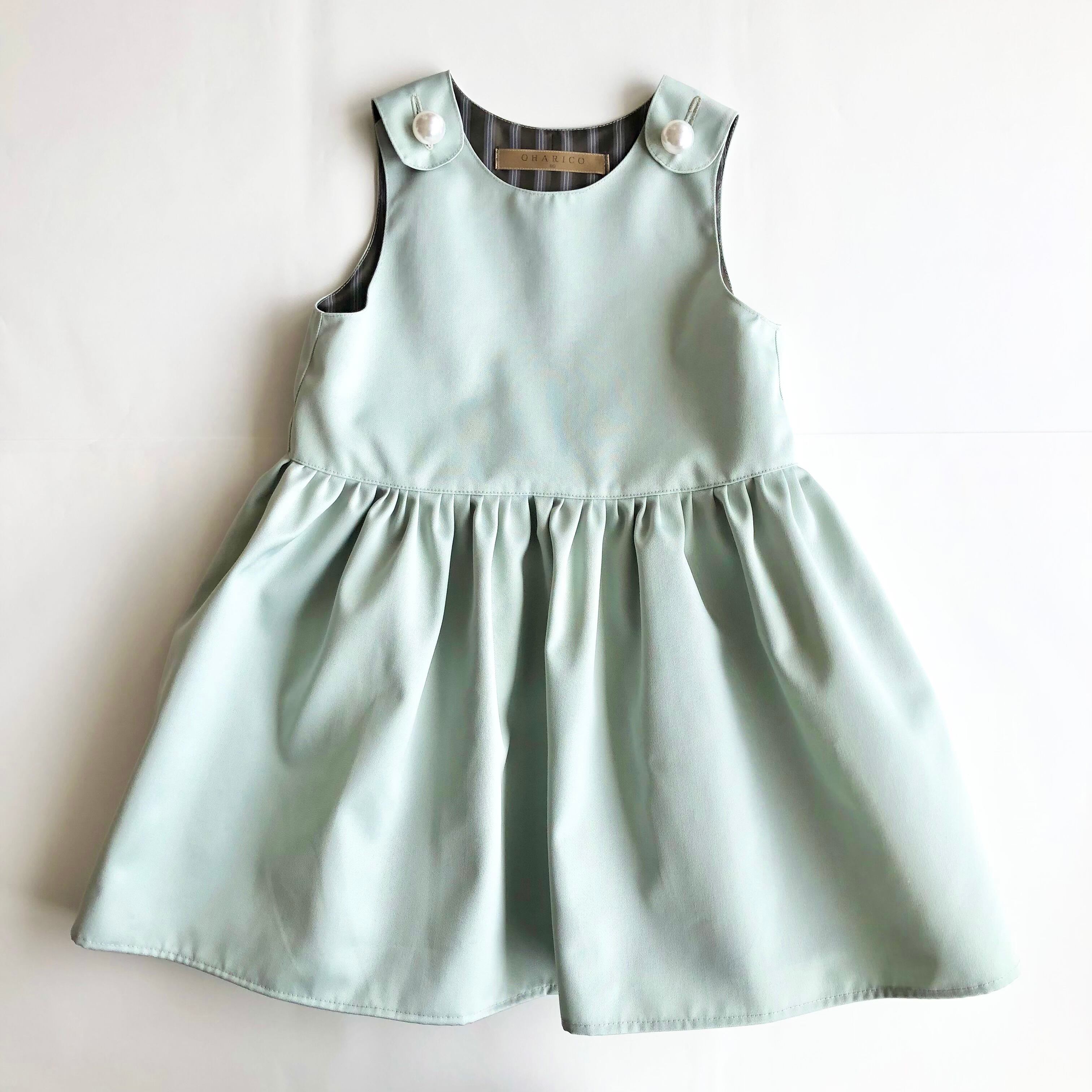 肩にちょこんと乗った大きなパールボタンが特徴の、ベビーキッズの女の子向けよそゆきワンピース(ジャンパースカート)です。