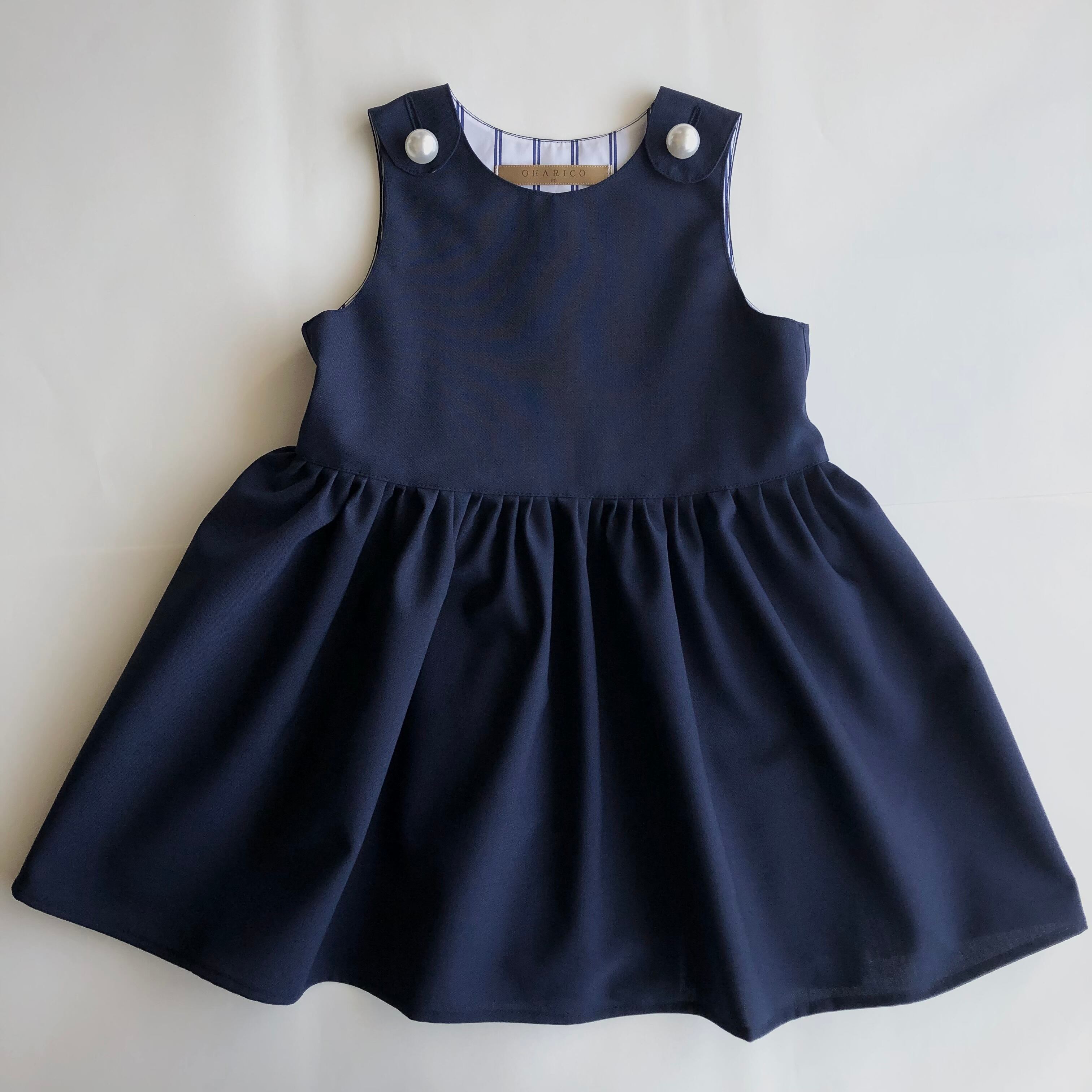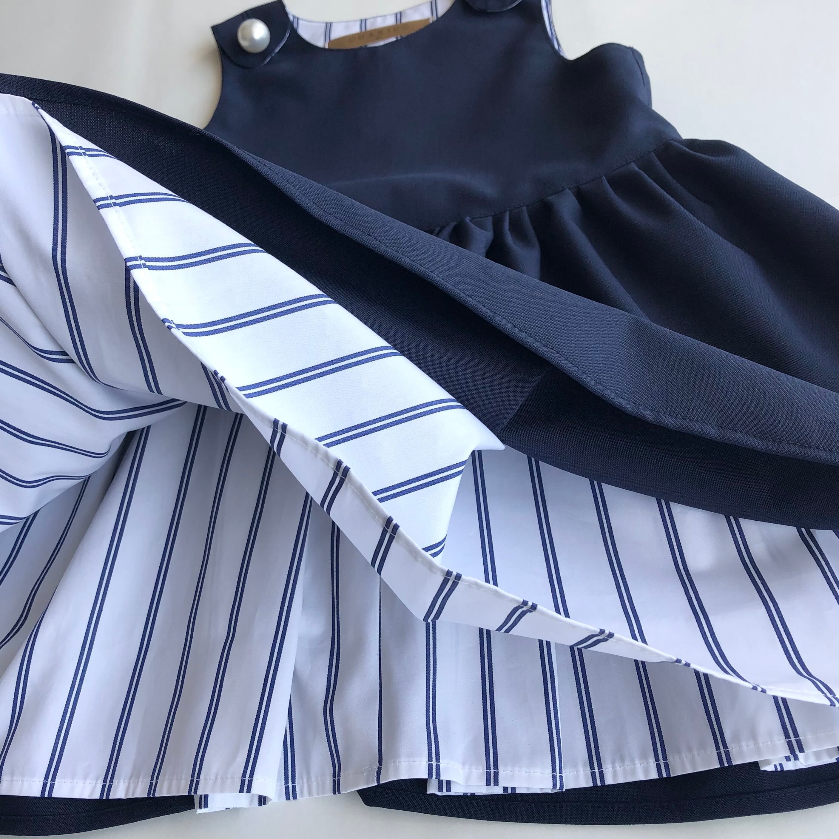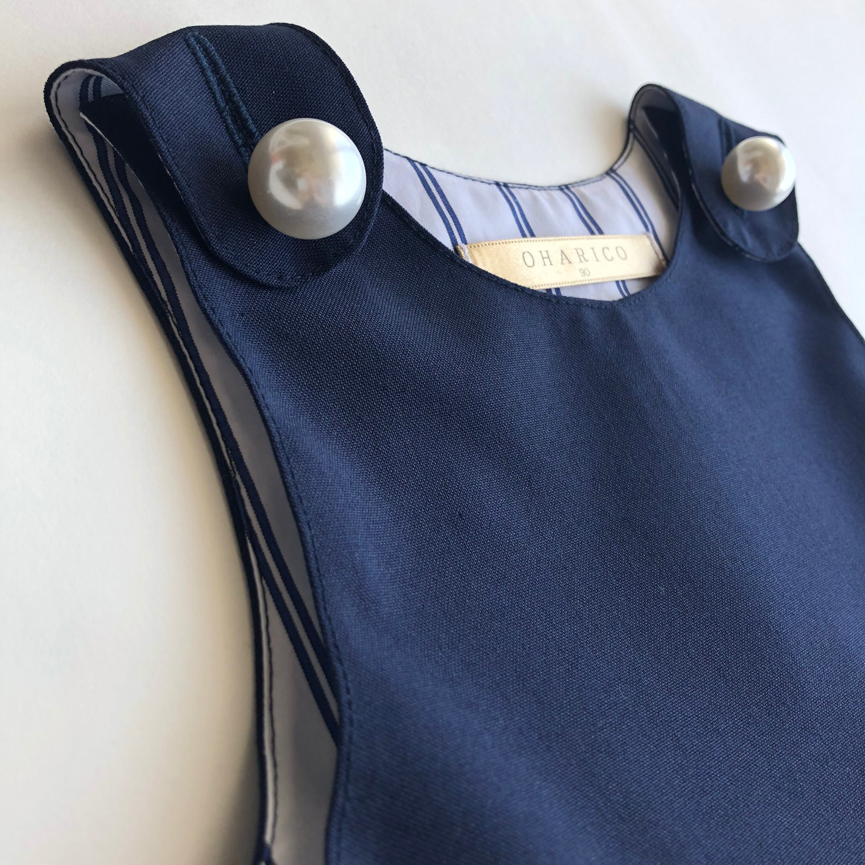 ダークネイビー(濃紺)の生地で、ちょっぴり大人っぽい可愛さを感じられます。裏地はお洒落なストライプでコットン100%。