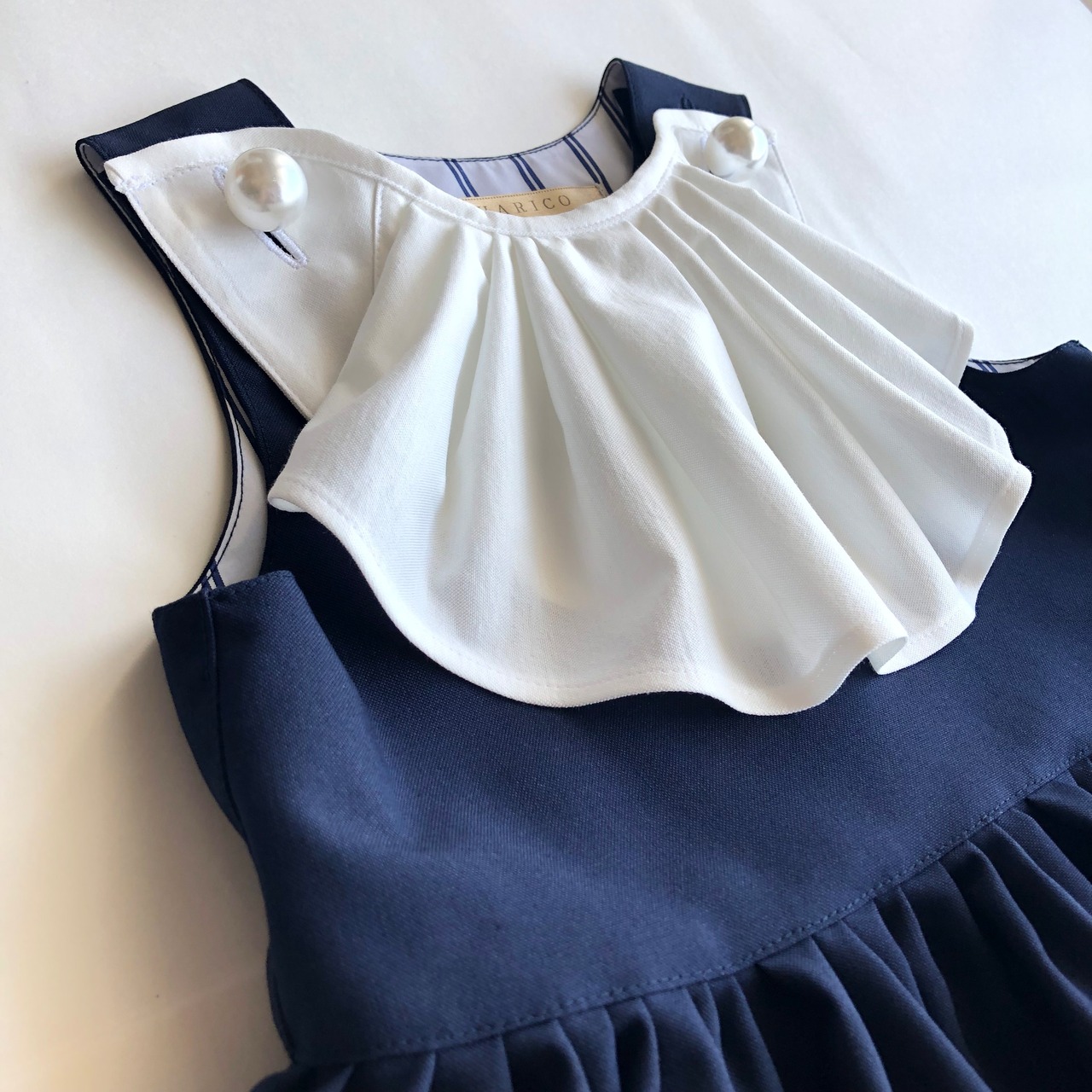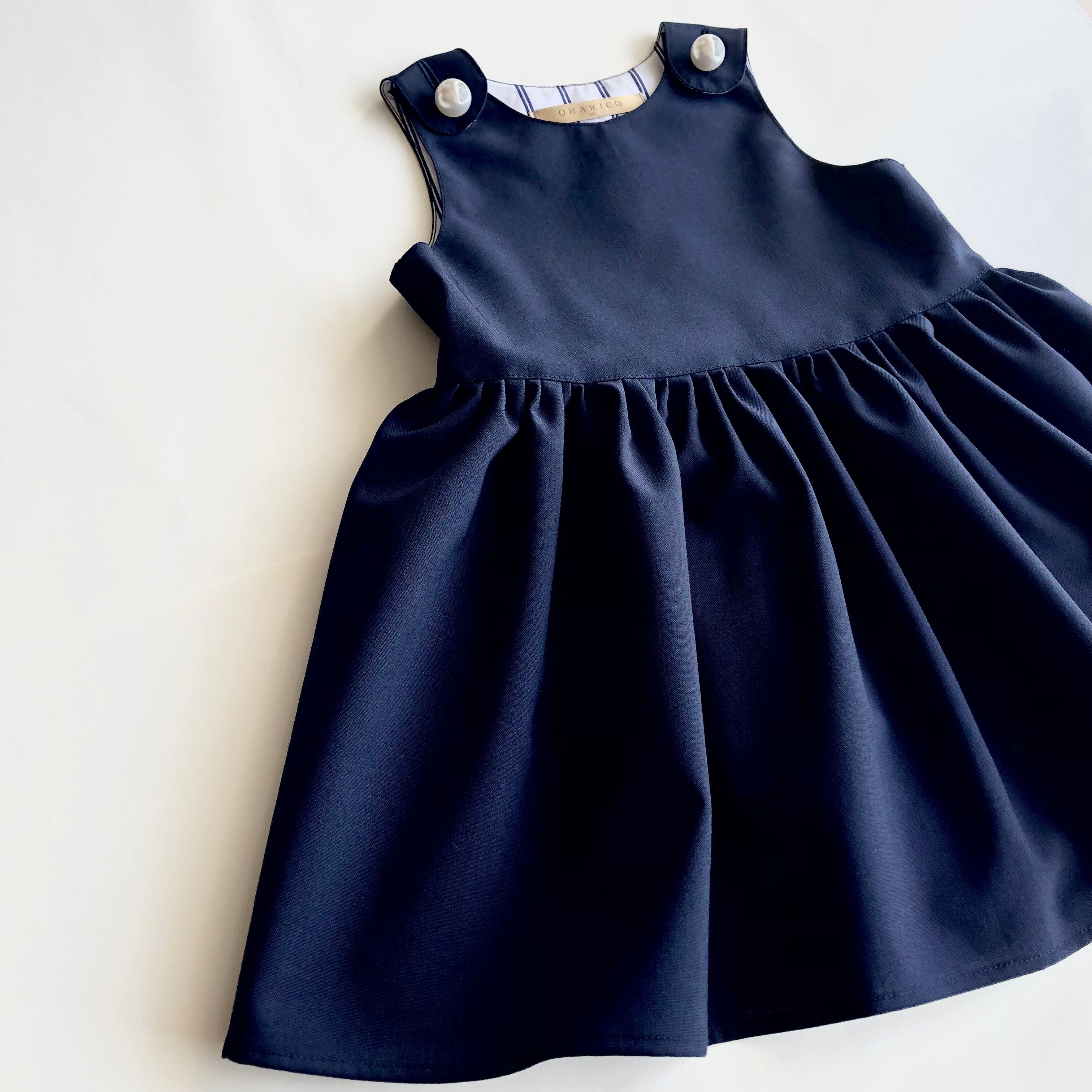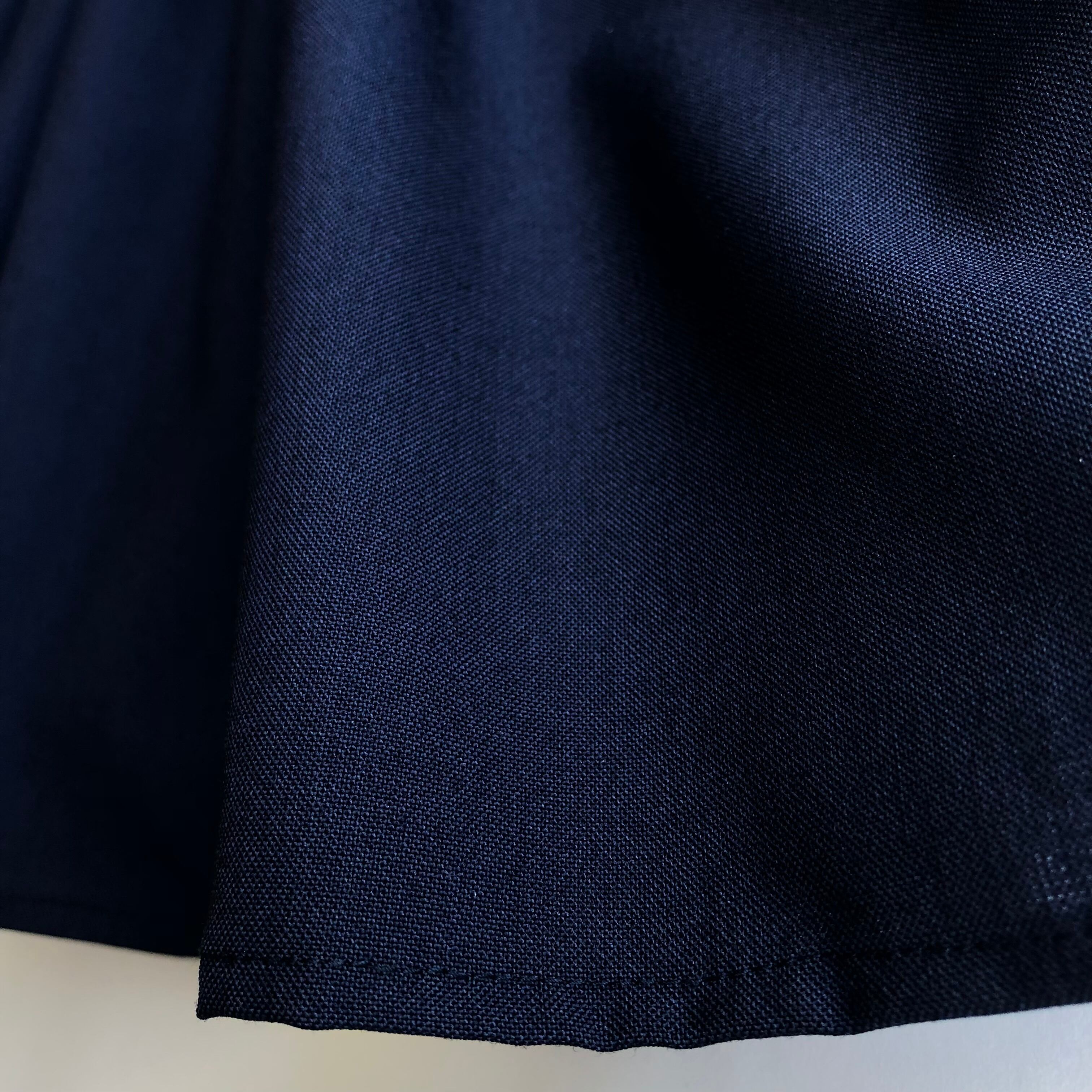 ダークネイビー(濃紺)の生地で、ちょっぴり大人っぽい可愛さを感じられます。裏地はお洒落なストライプでコットン100%。
