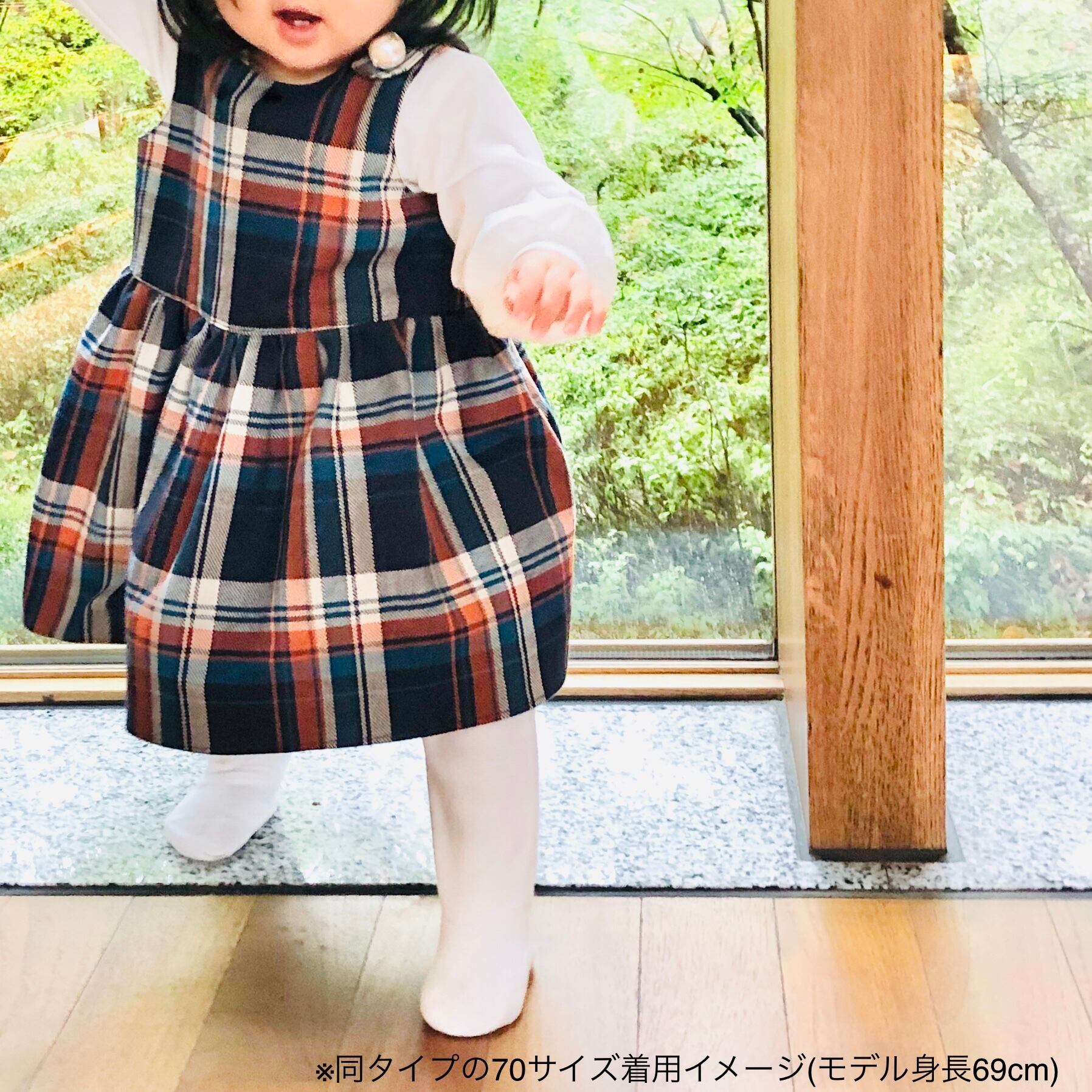 ジャンスカ(ジャンパースカート)なので、中にシャツやセーターにタイツ、または股スナップがついたボディ肌着を組み合わせて、可愛いコーデをいろいろと楽しんでみてください。(インナーは襟がない方がベターです)