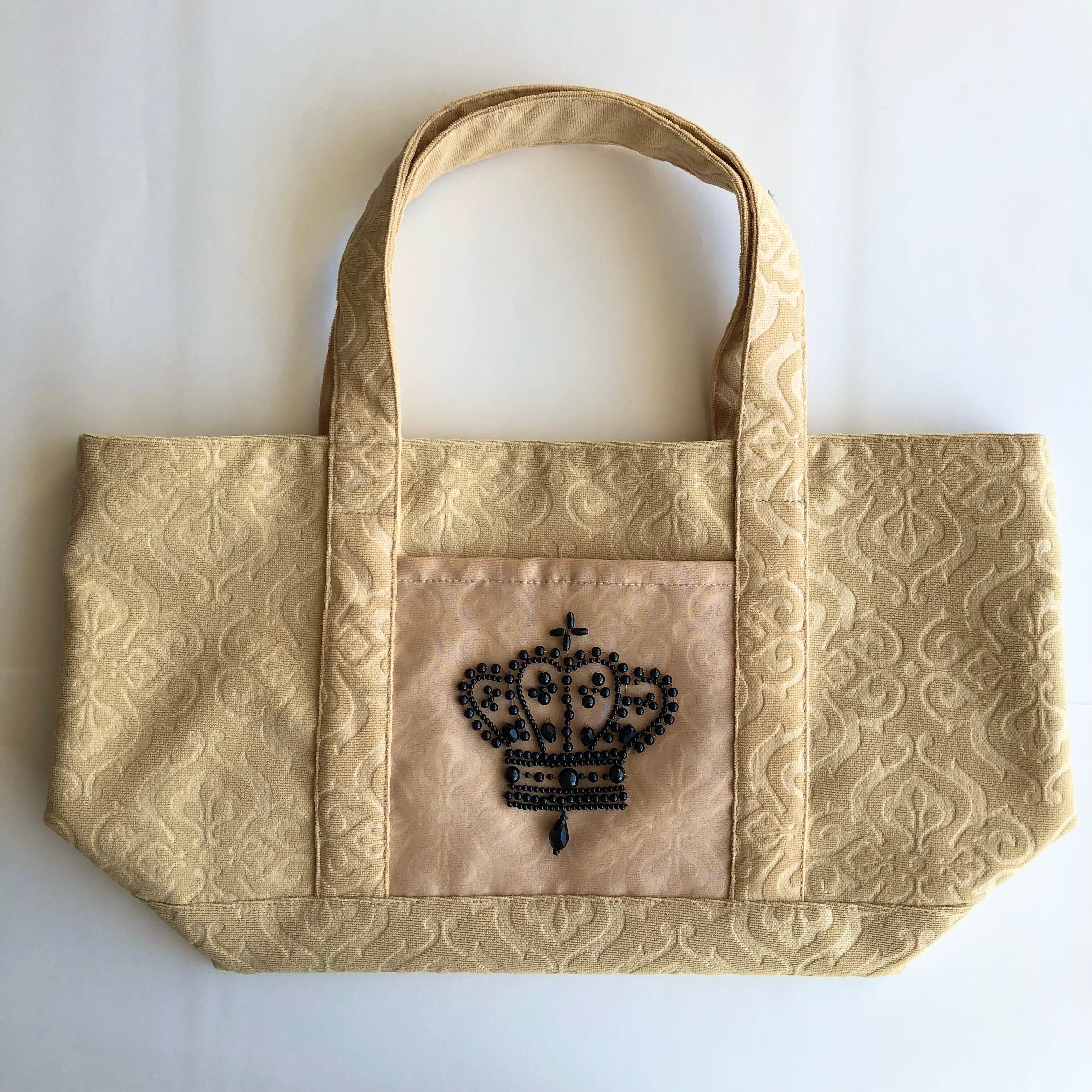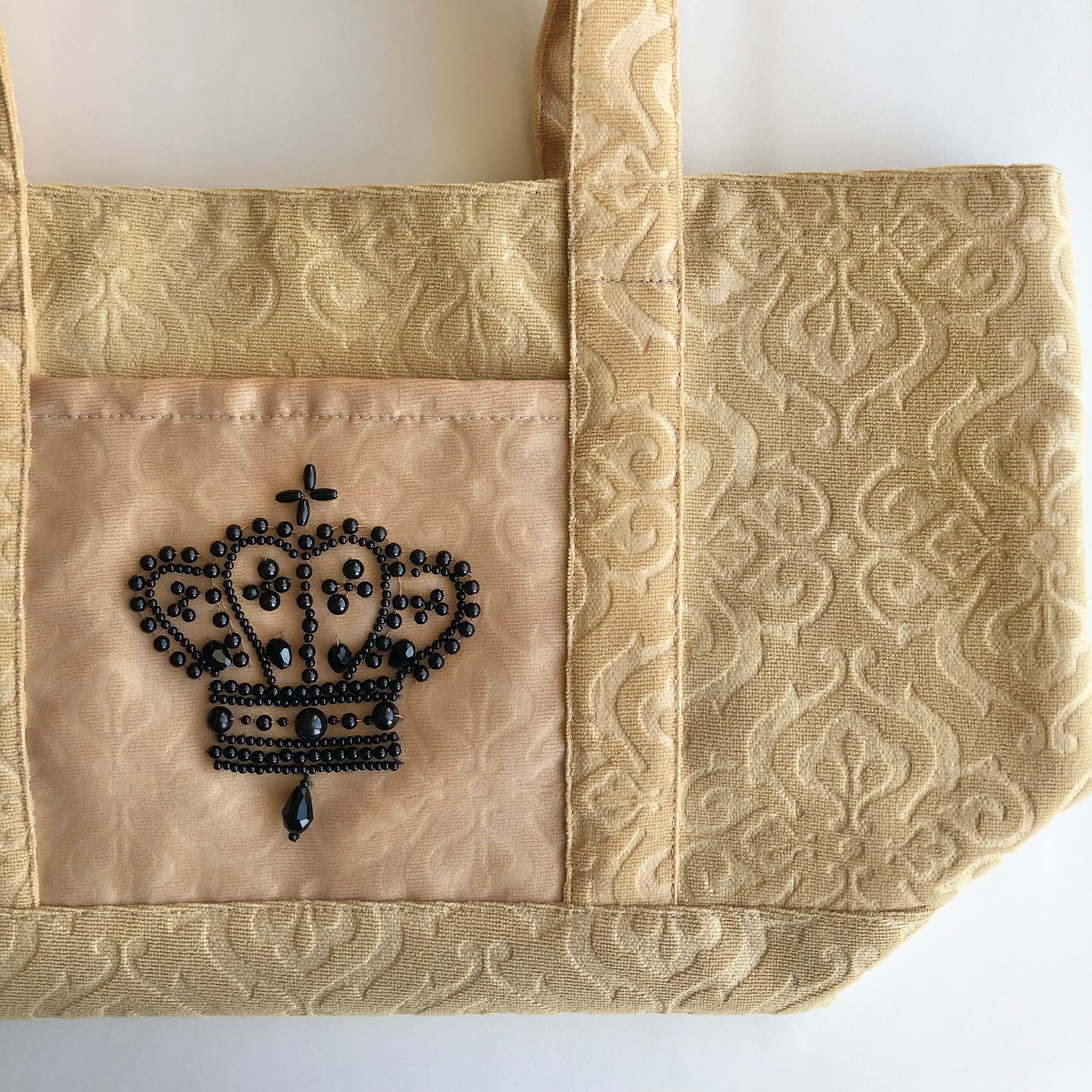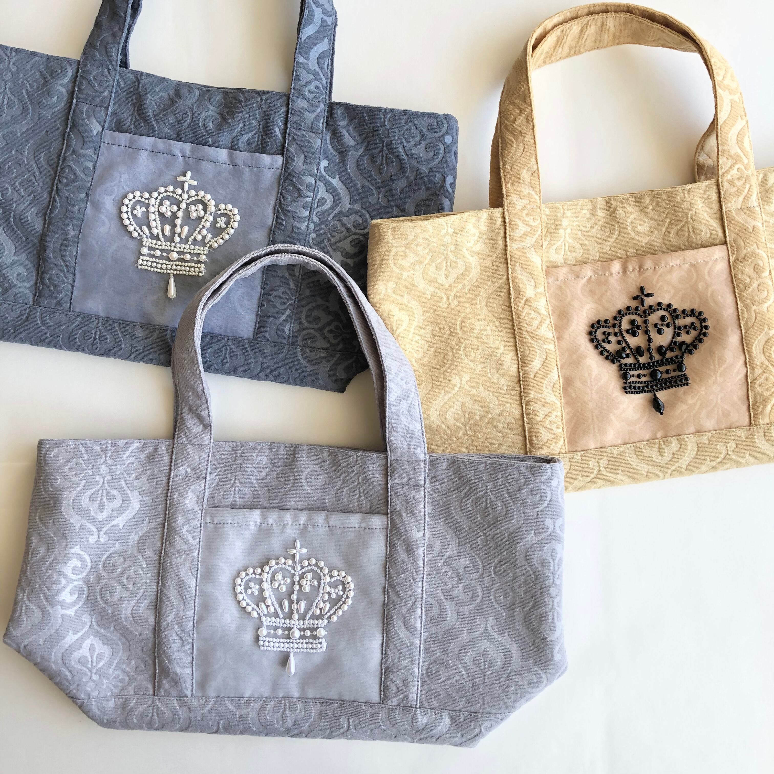クラウン(王冠)のパール刺繍が美しいミニトートです。優雅なダマスク柄が艶やかさを醸しています。