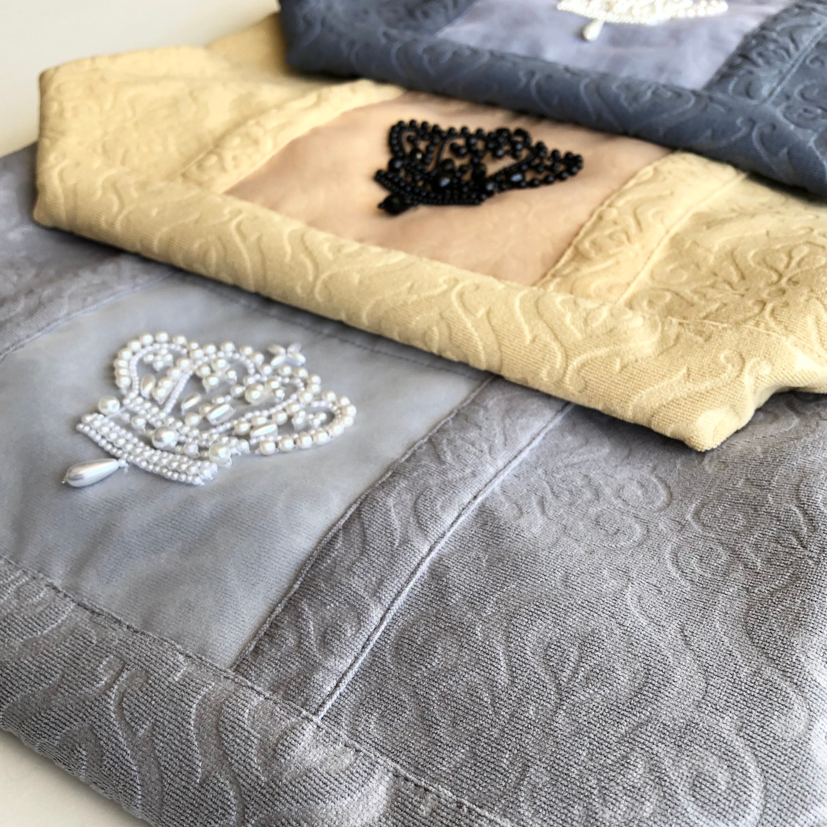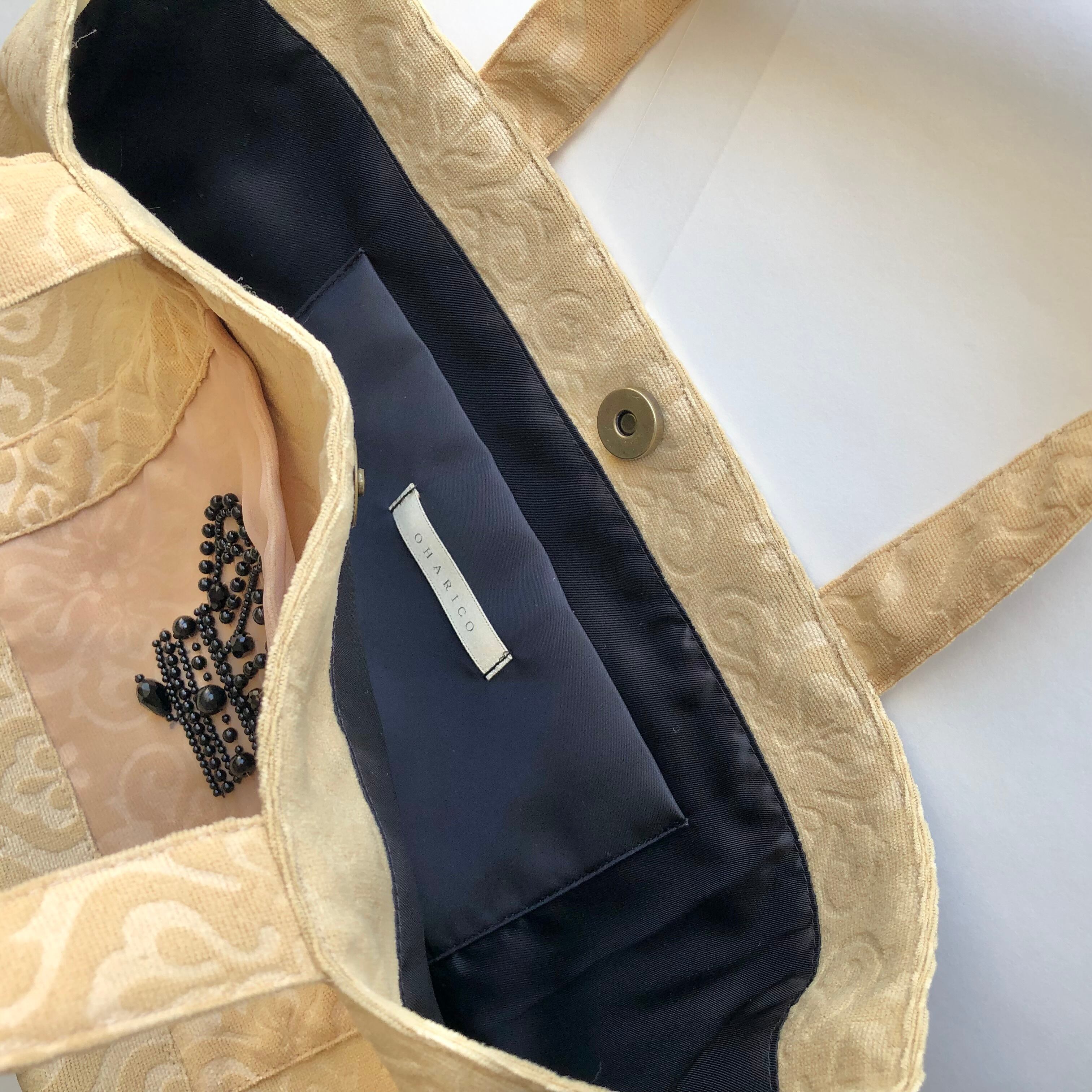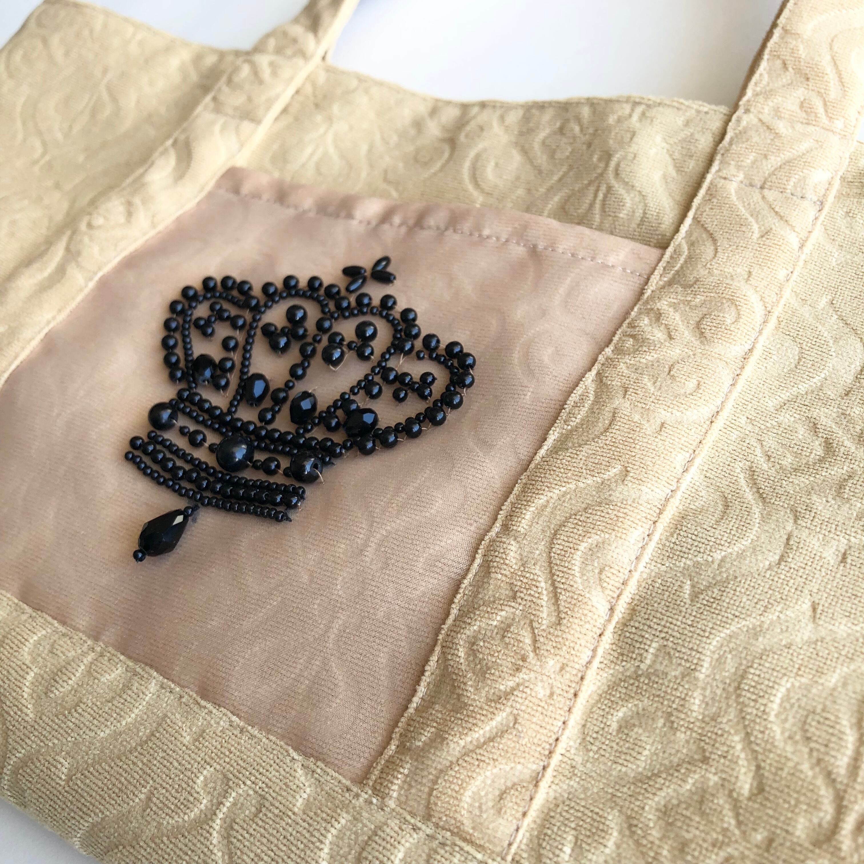 クラウン(王冠)のパール刺繍が美しいミニトートです。優雅なダマスク柄が艶やかさを醸しています。