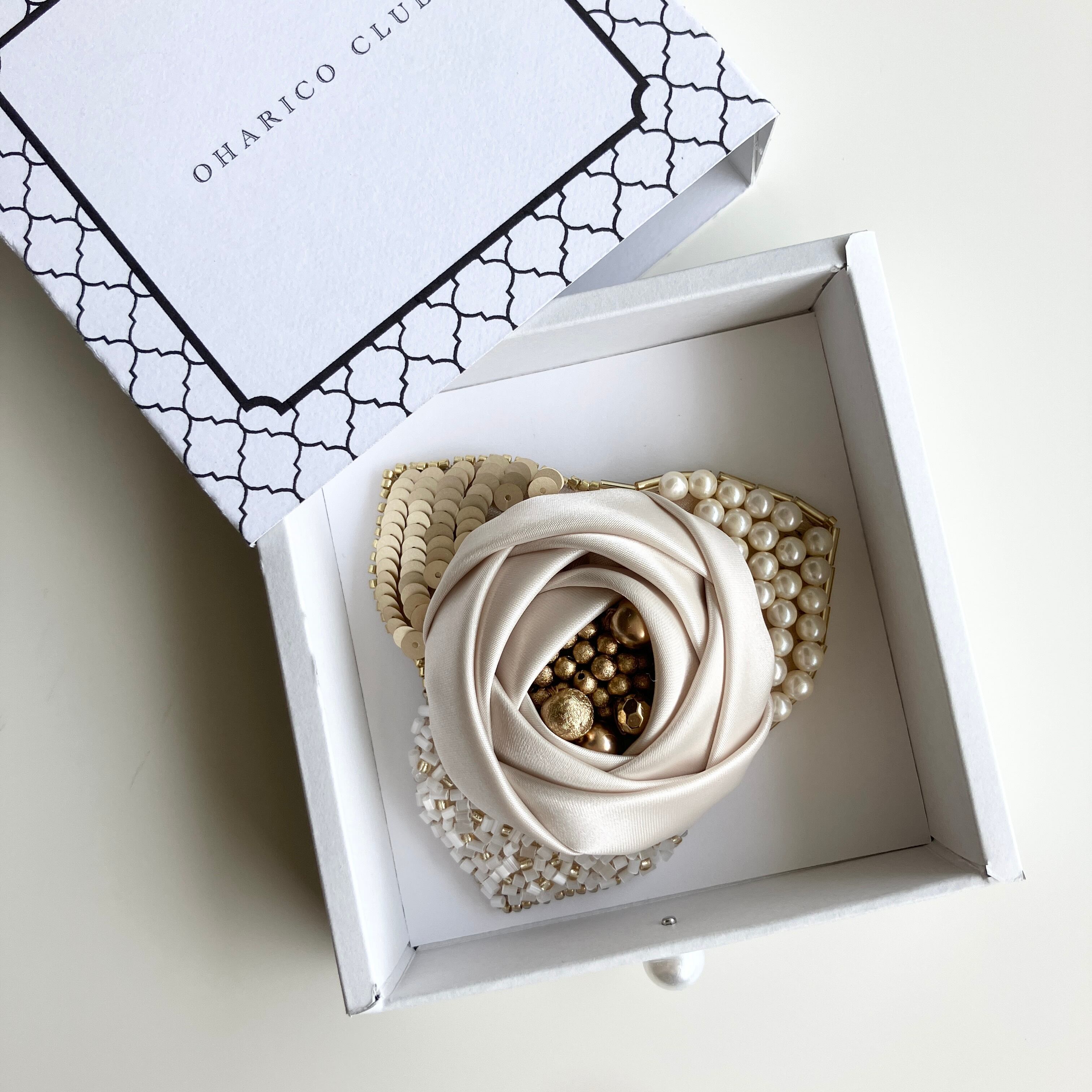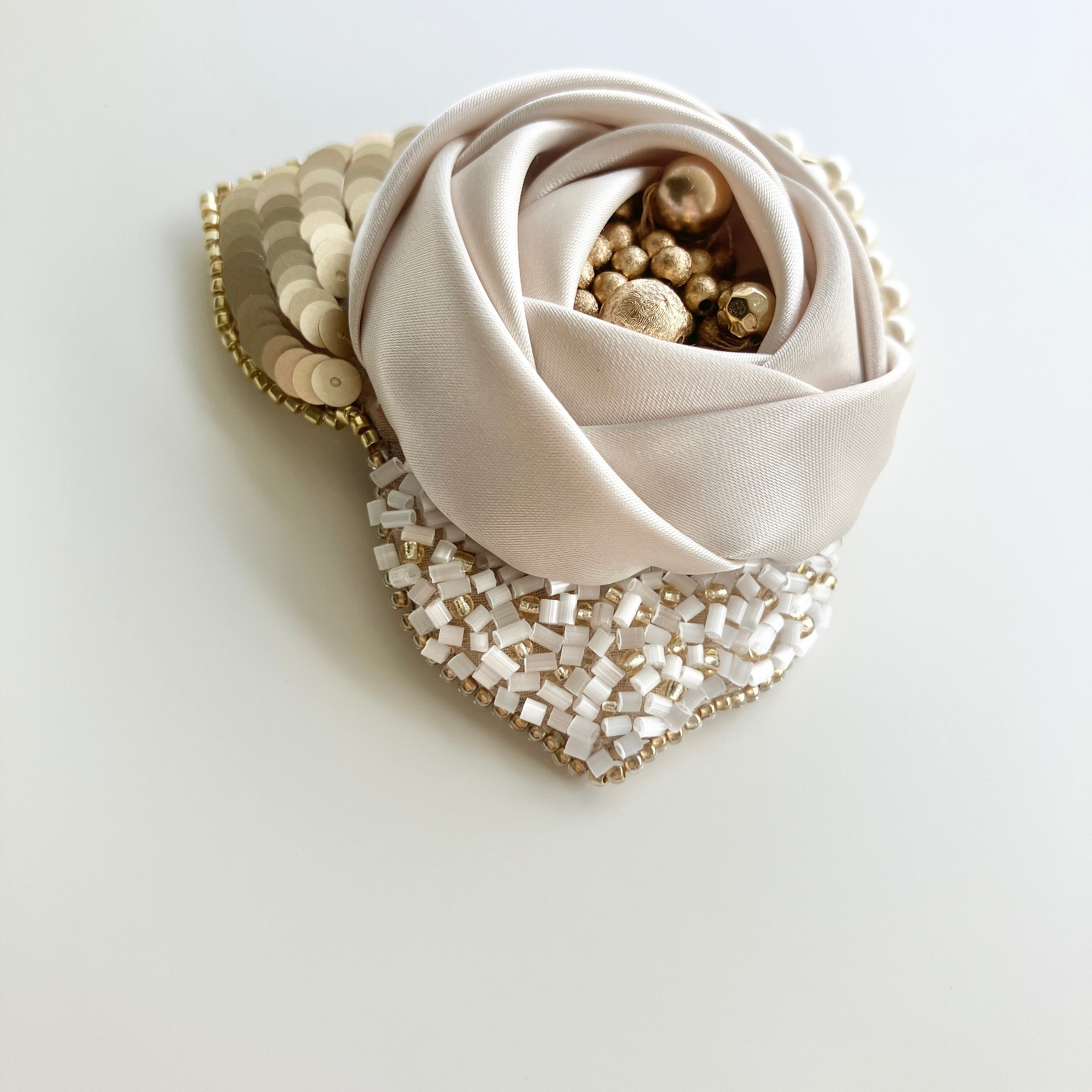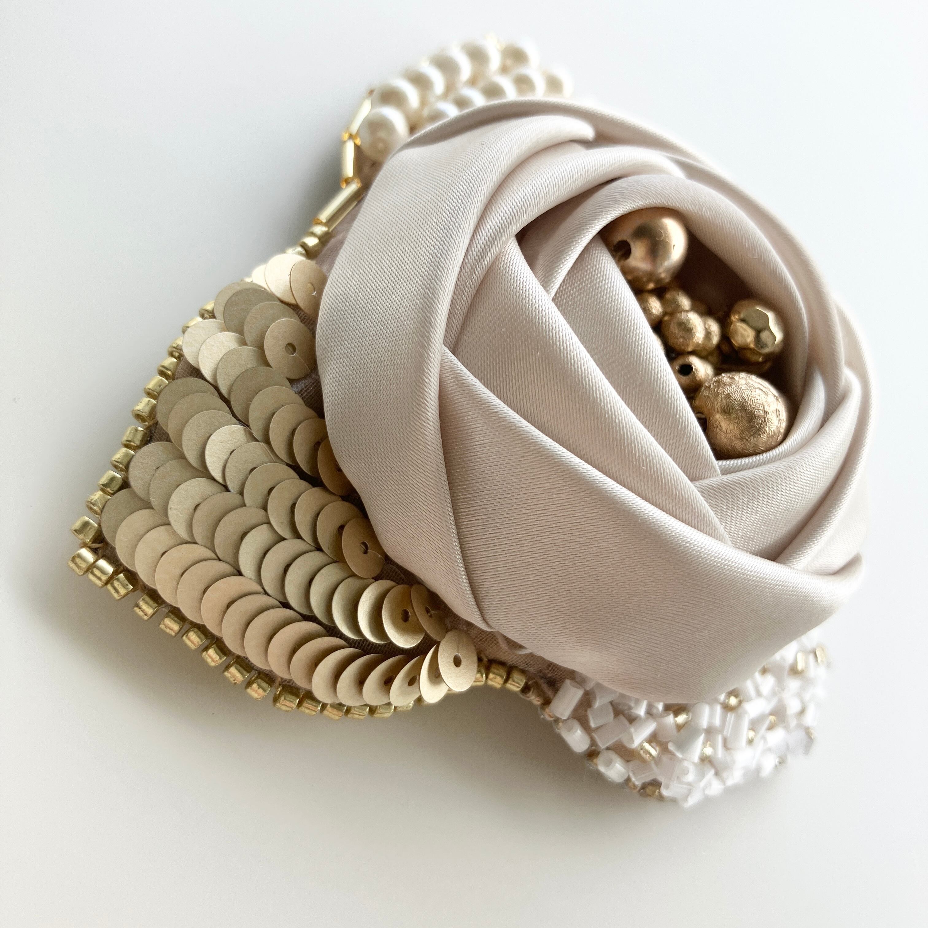 オートクチュール刺繍技法を使った手刺繍で、ひとつひとつ丁寧に仕上げ、ビーズ刺繍のコサージュとして仕立てています。