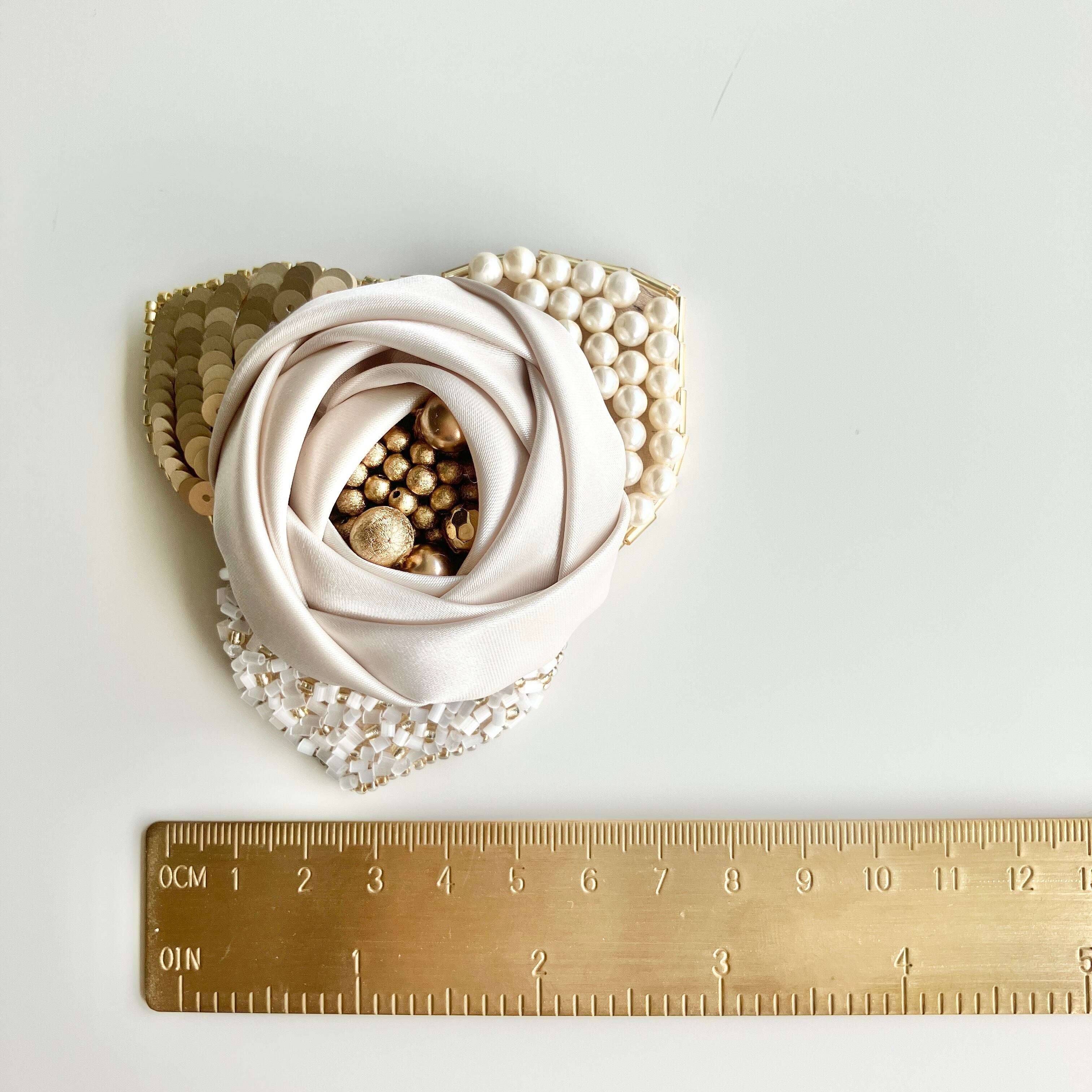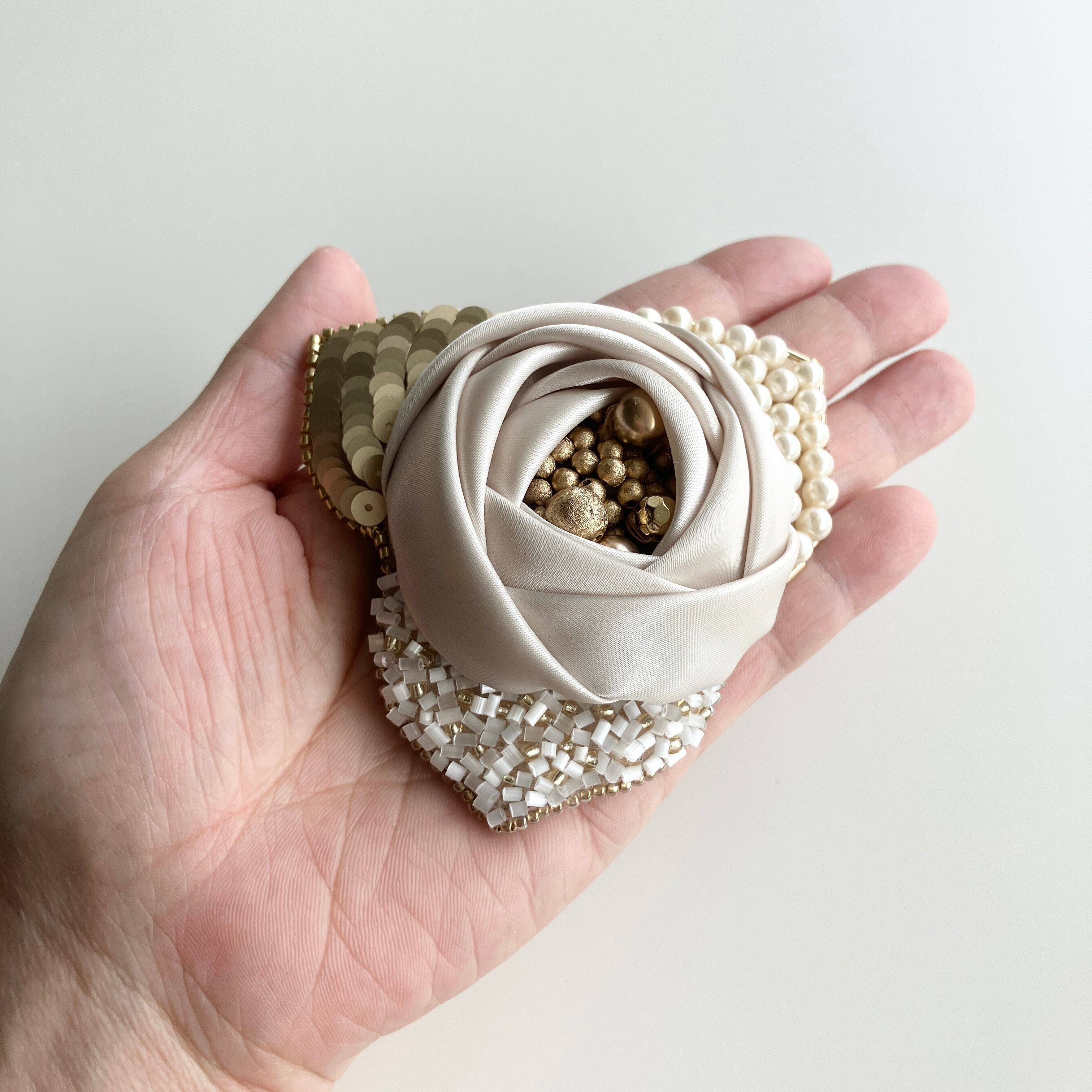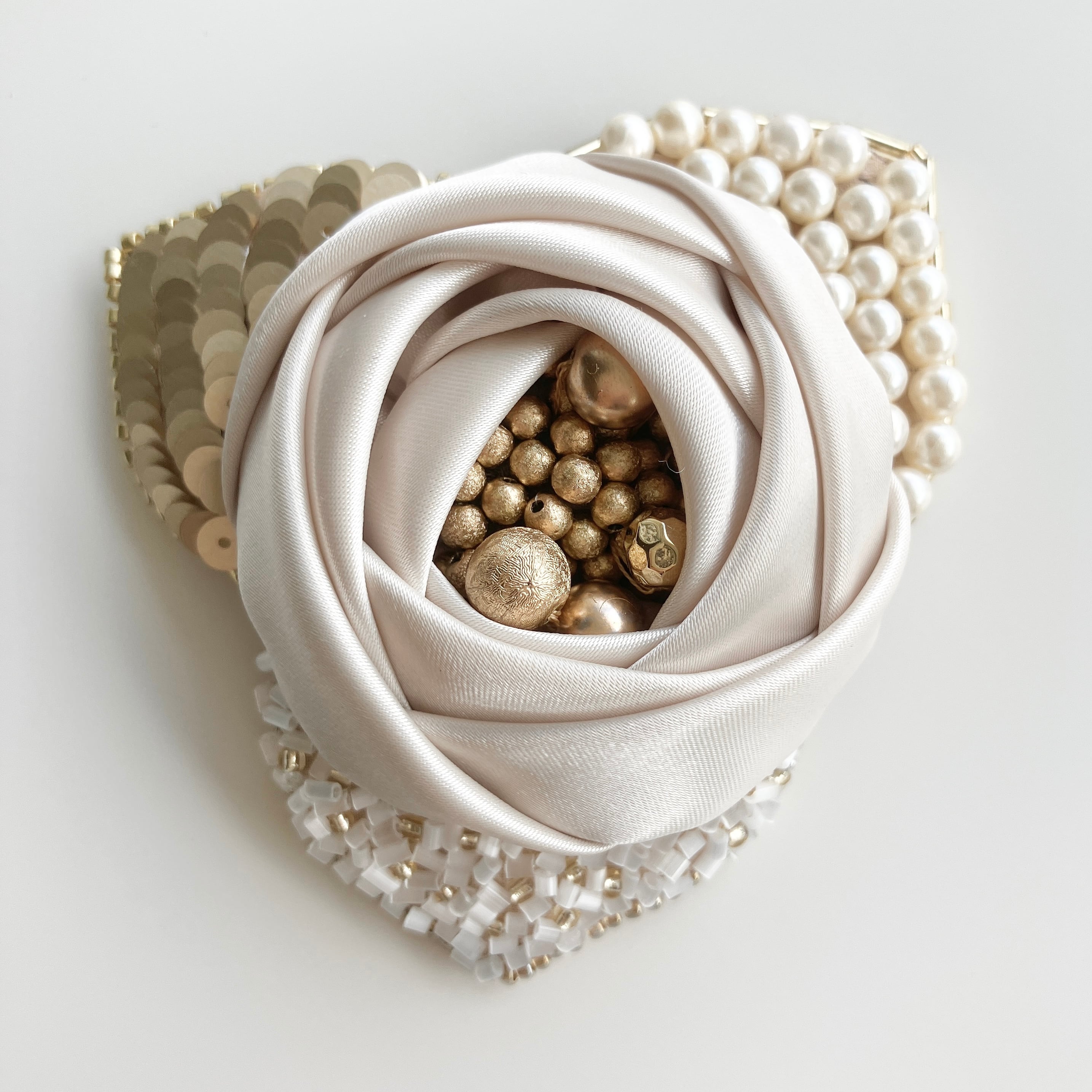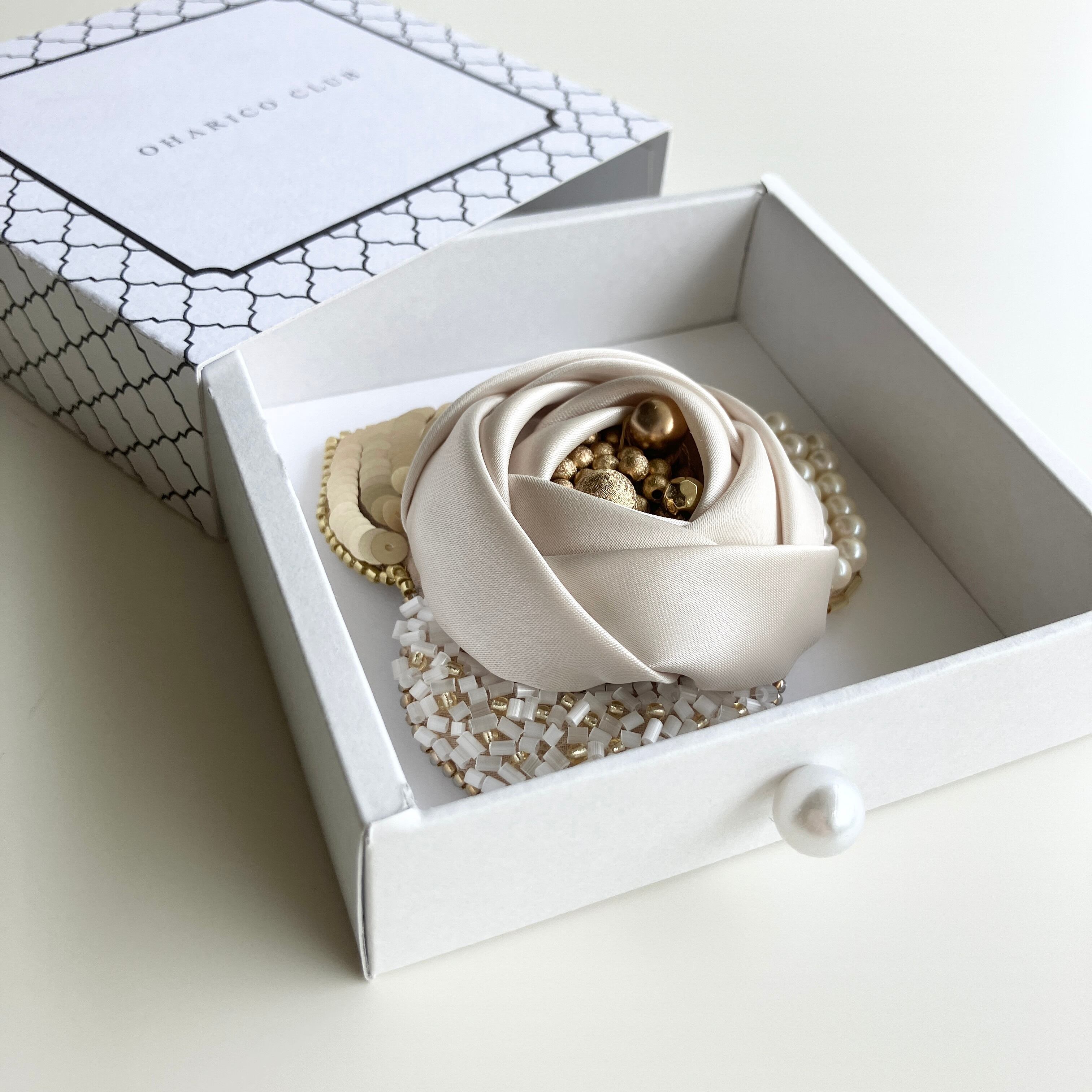 オートクチュール刺繍技法を使った手刺繍で、ひとつひとつ丁寧に仕上げ、ビーズ刺繍のコサージュとして仕立てています。