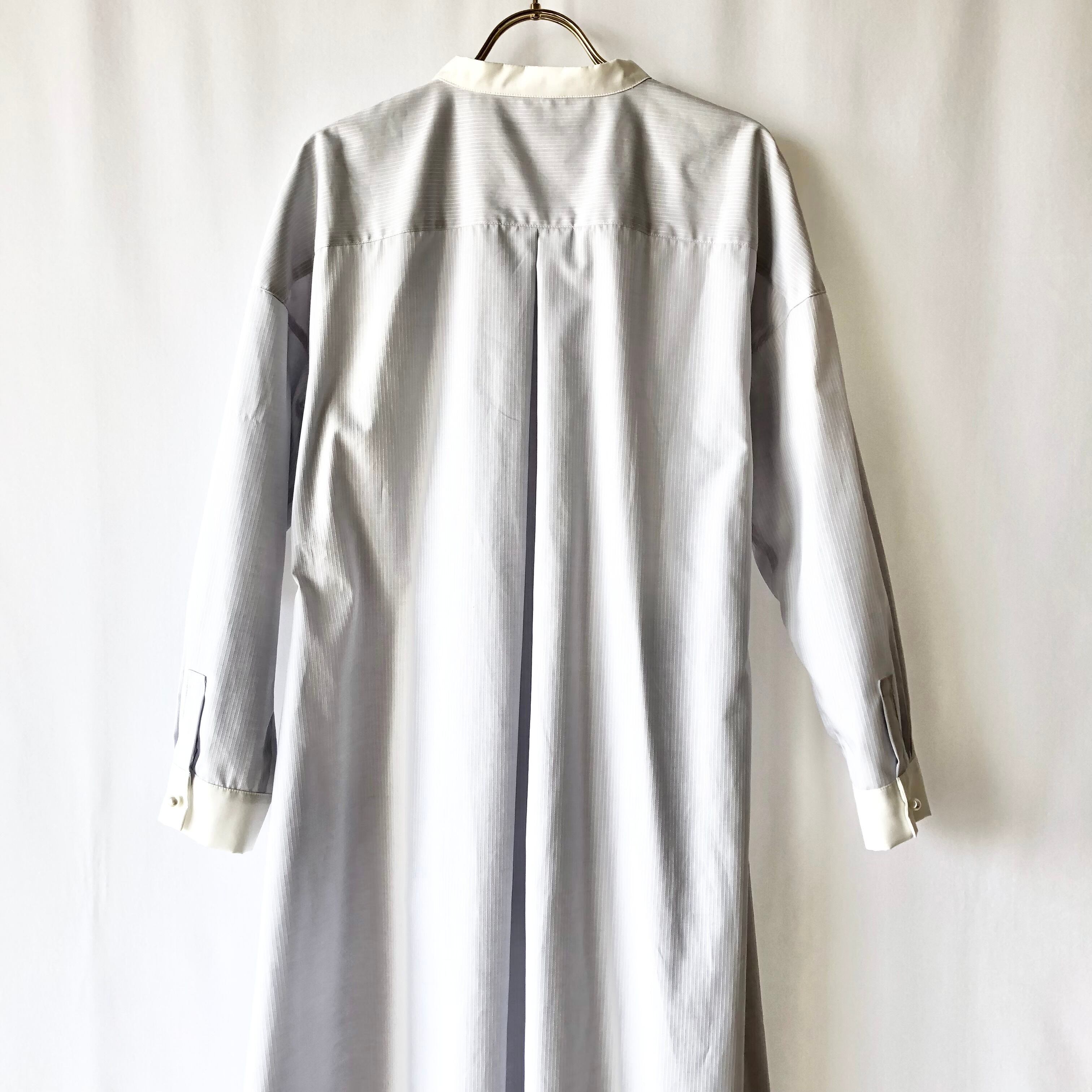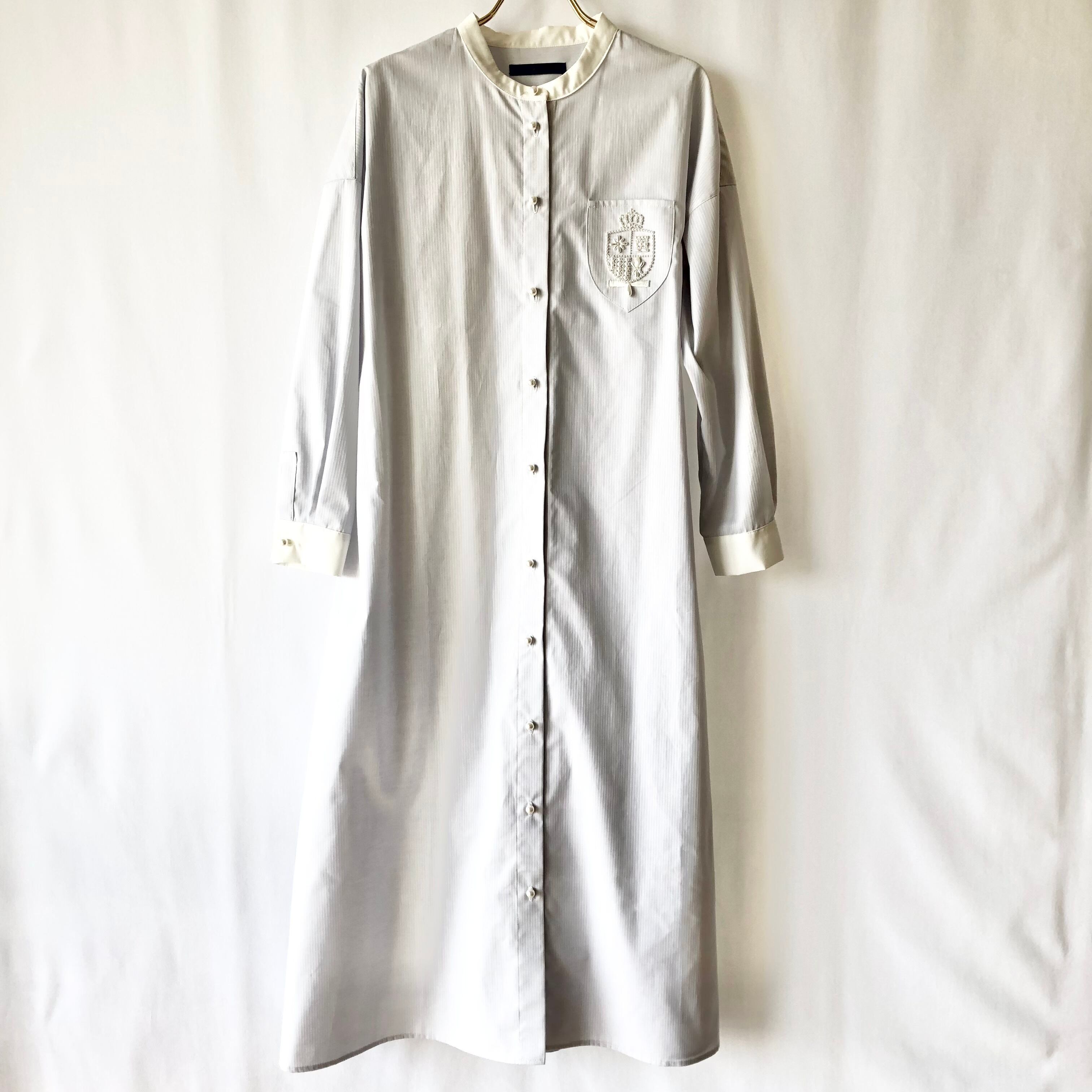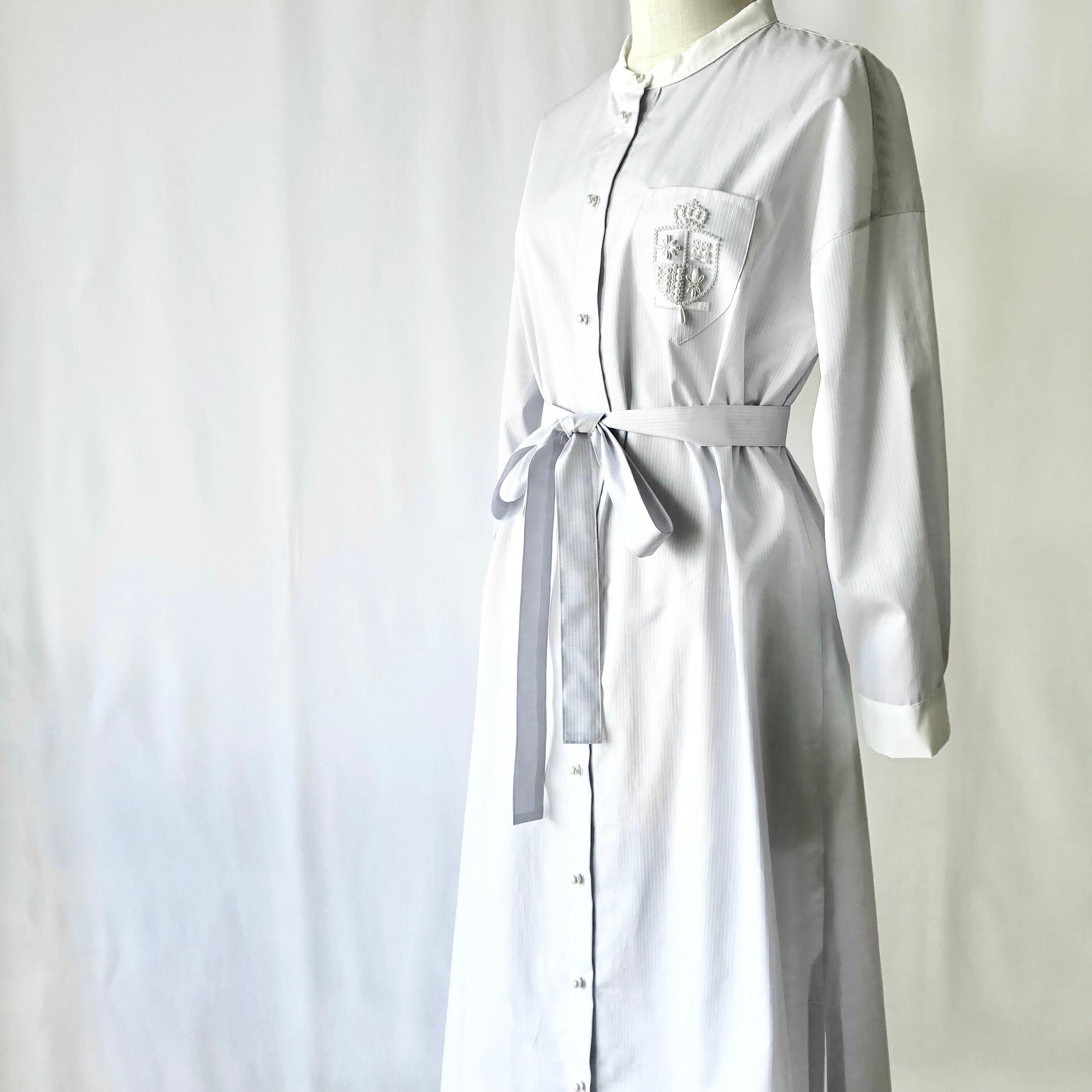 紋章パール刺繍のクレリックシャツワンピース【シャツドレス/スタンドカラー/サックスストライプ/オートクチュール刺繍】