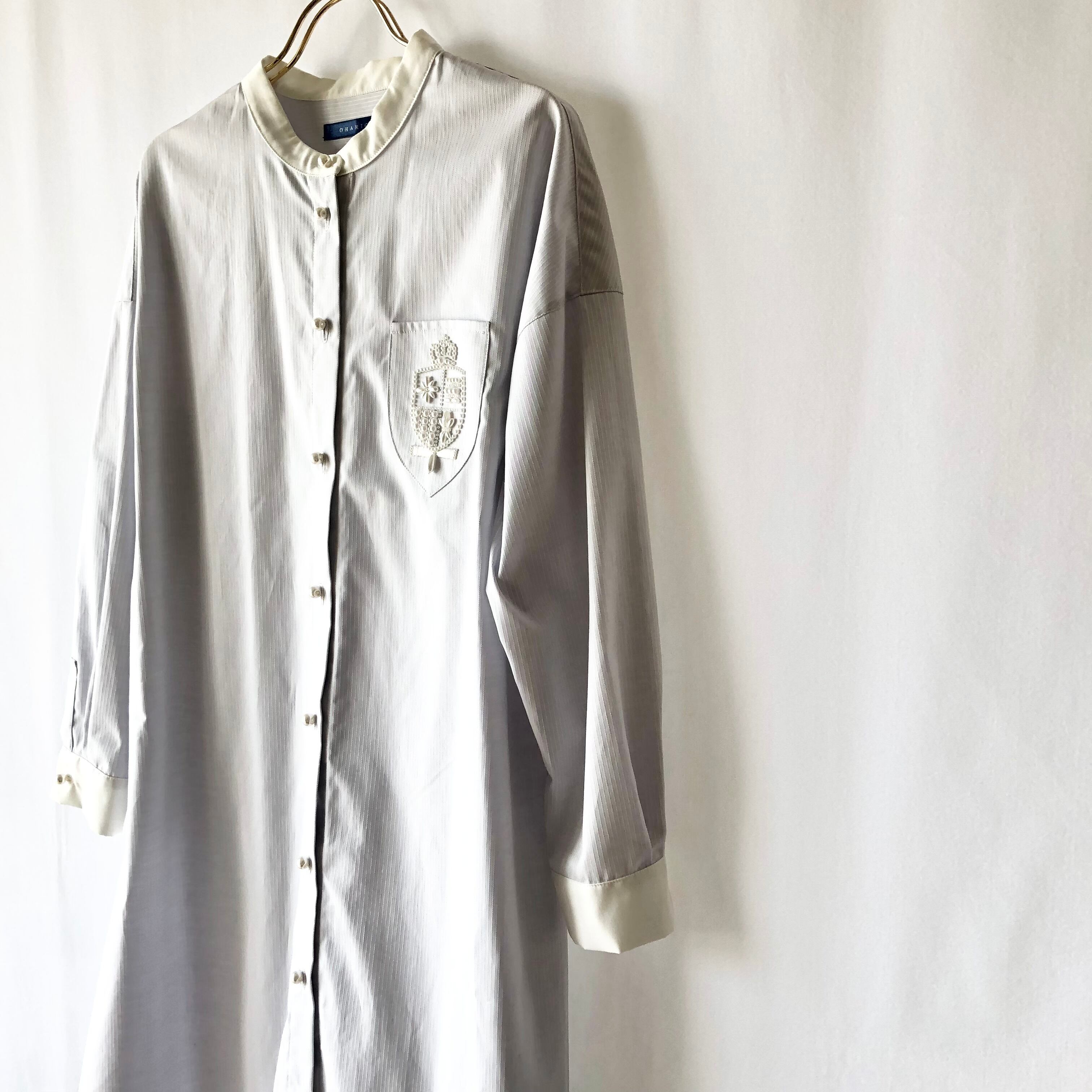 【紋章パール刺繍のクレリックシャツワンピース/スタンドカラー/オートクチュール刺繍ポケット】