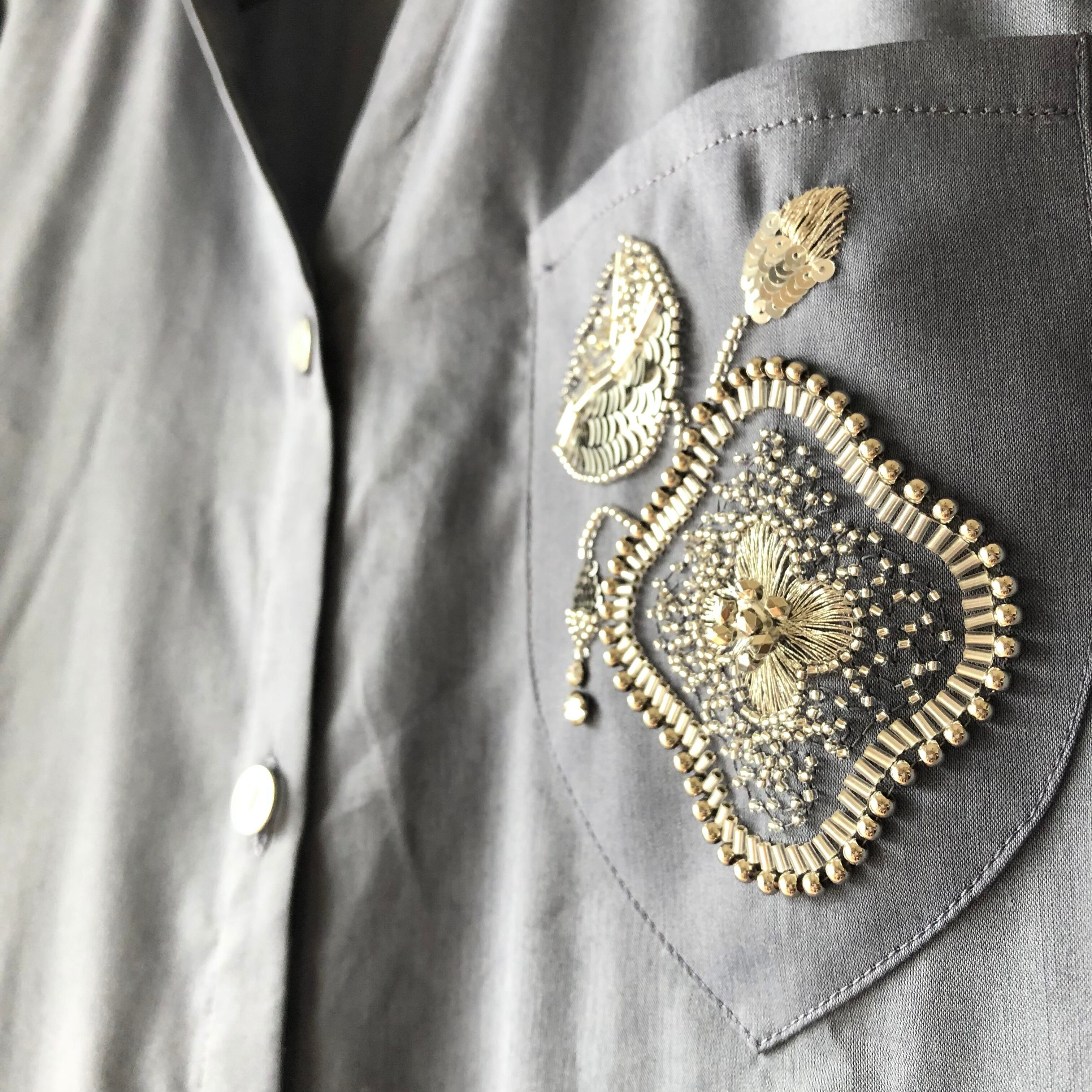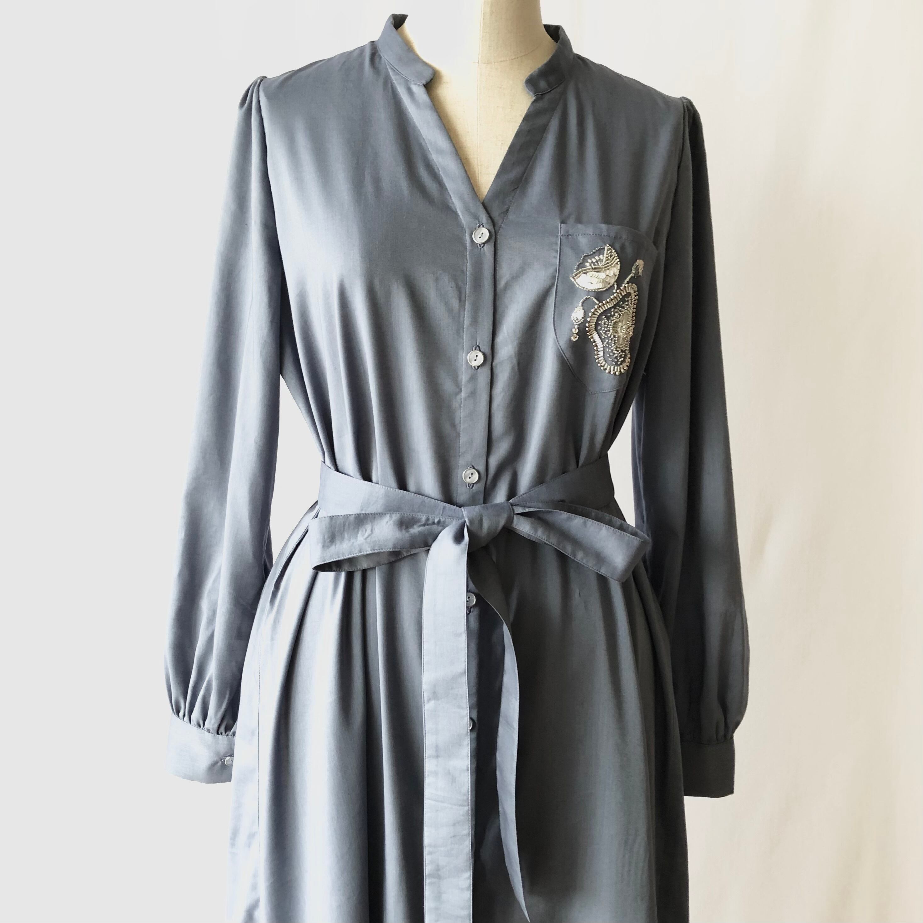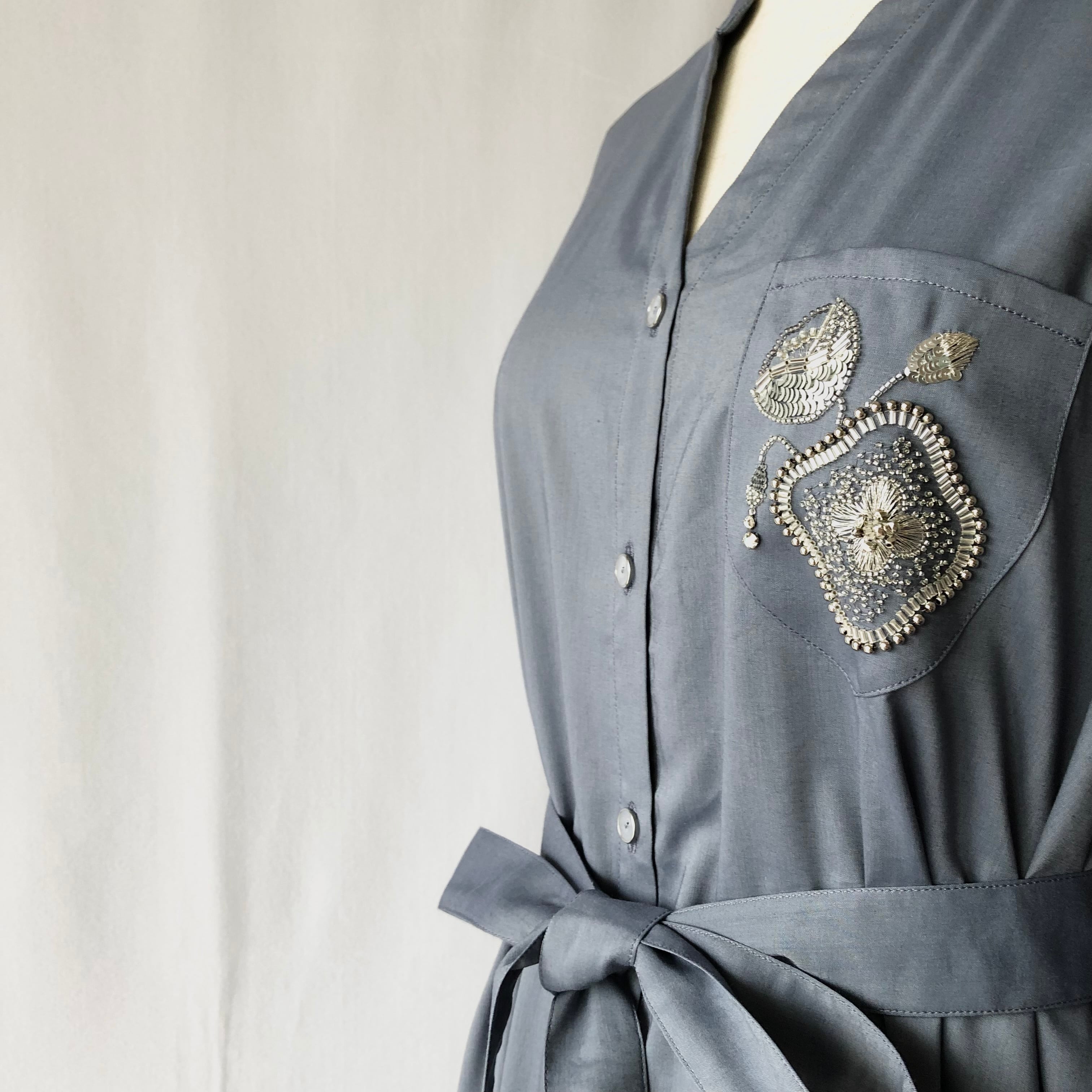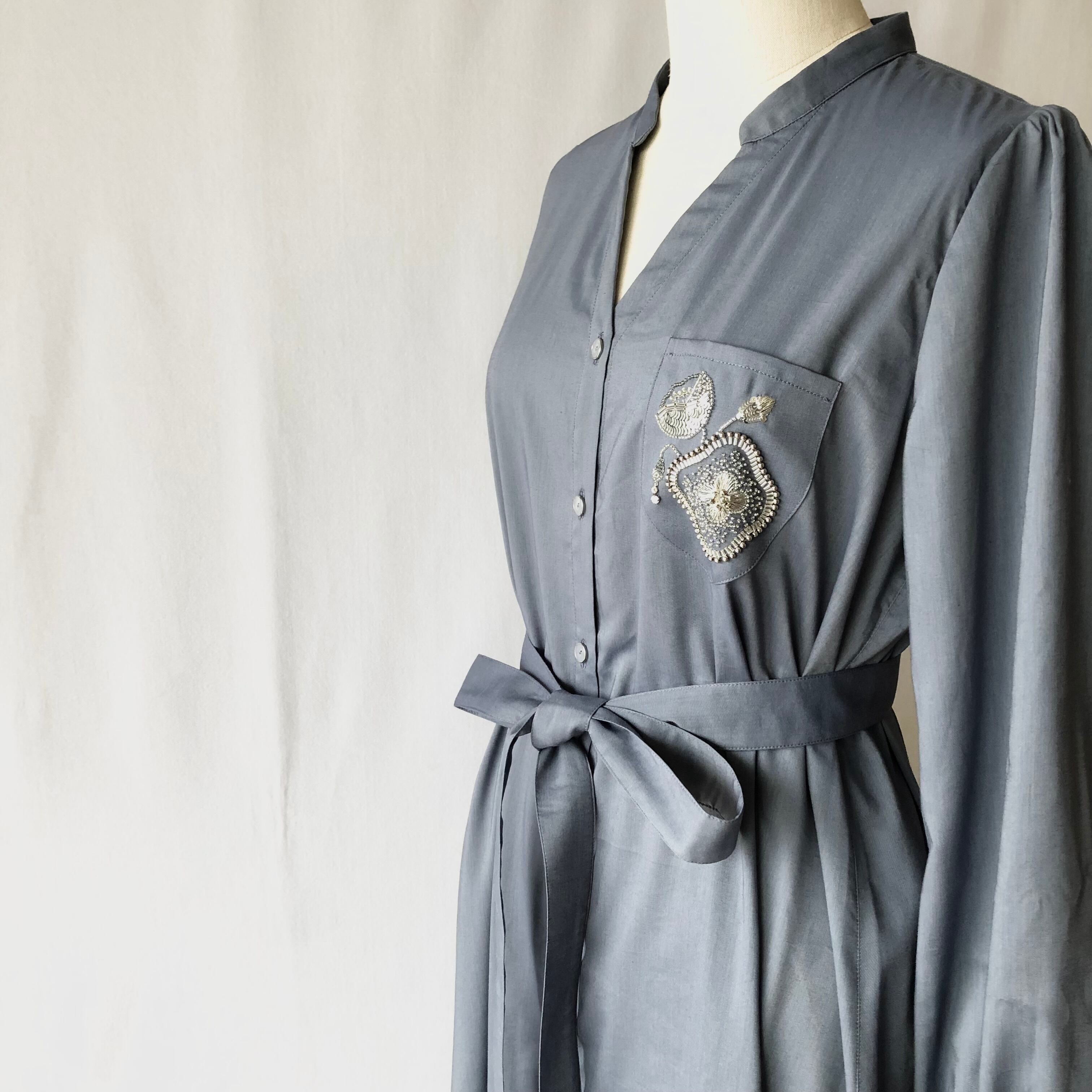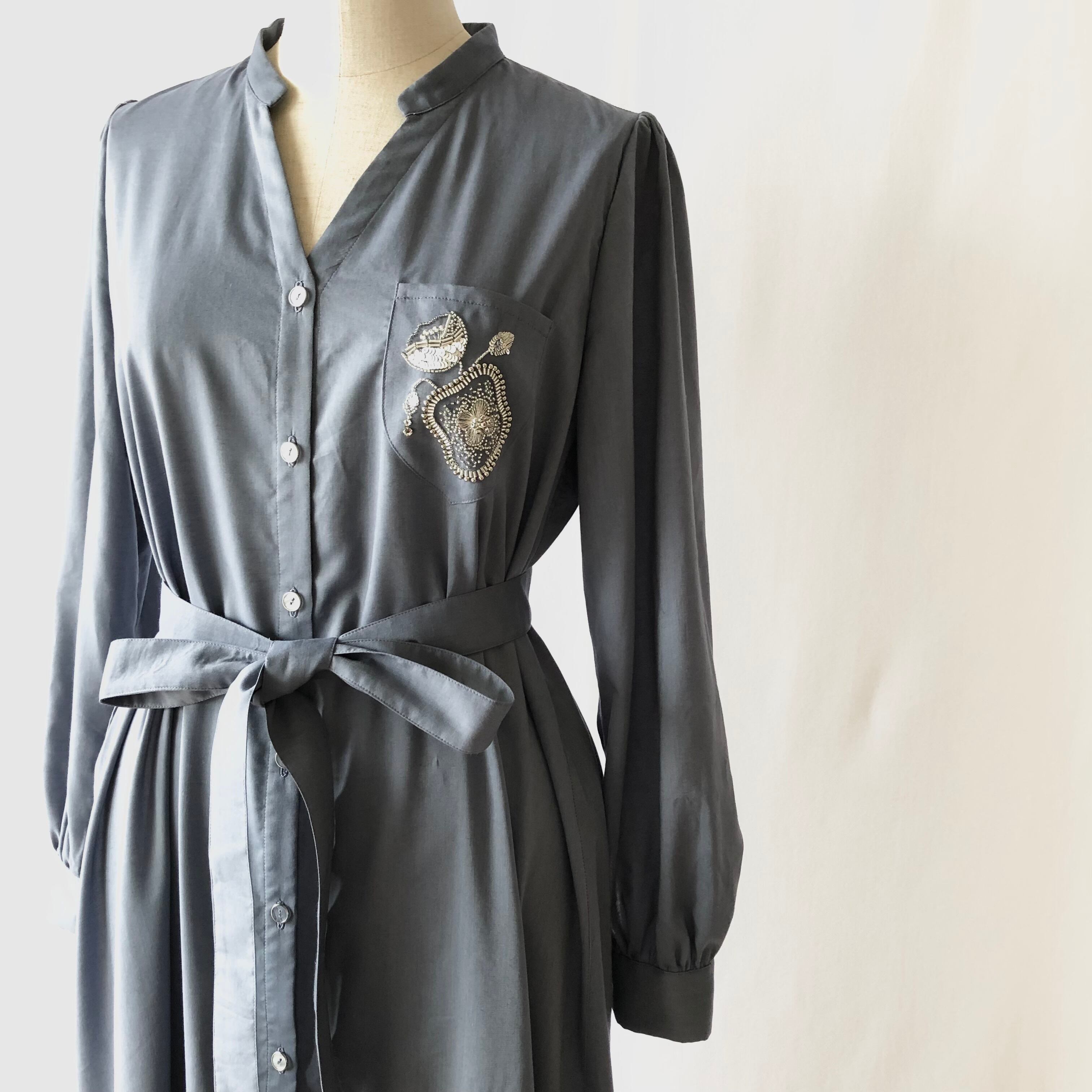 銀に輝くビーズ刺繍が美しい、ブルーグレーのシャツワンピース。