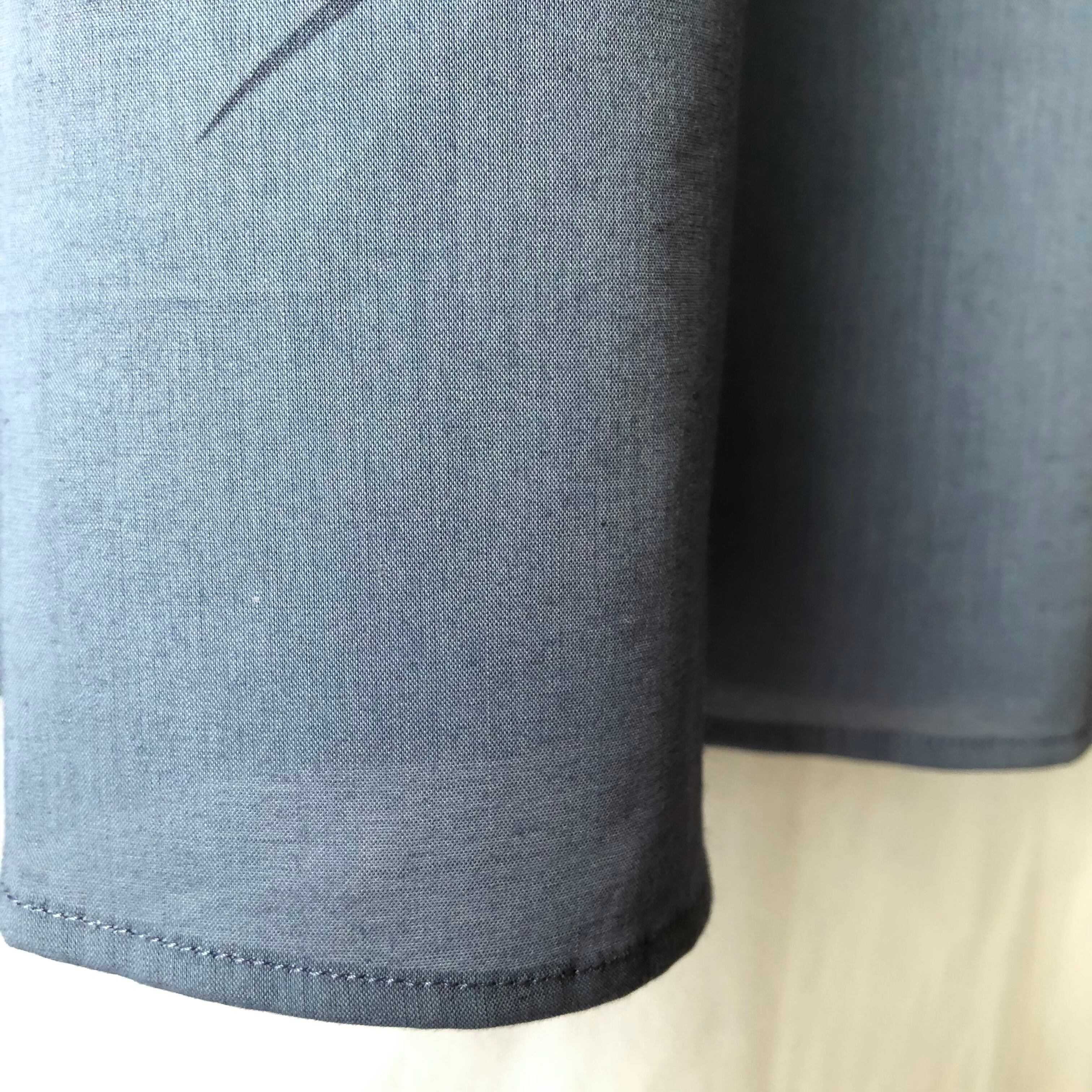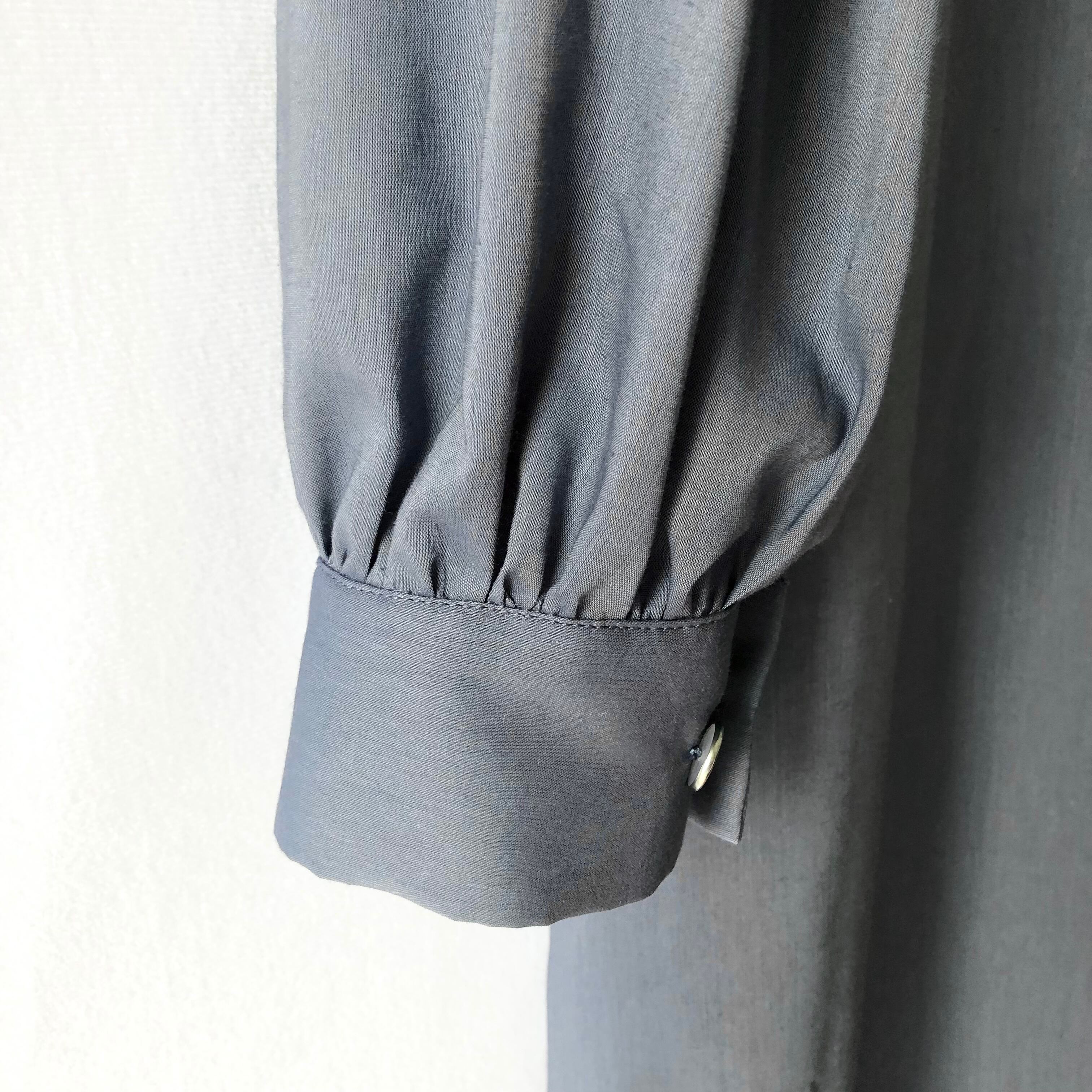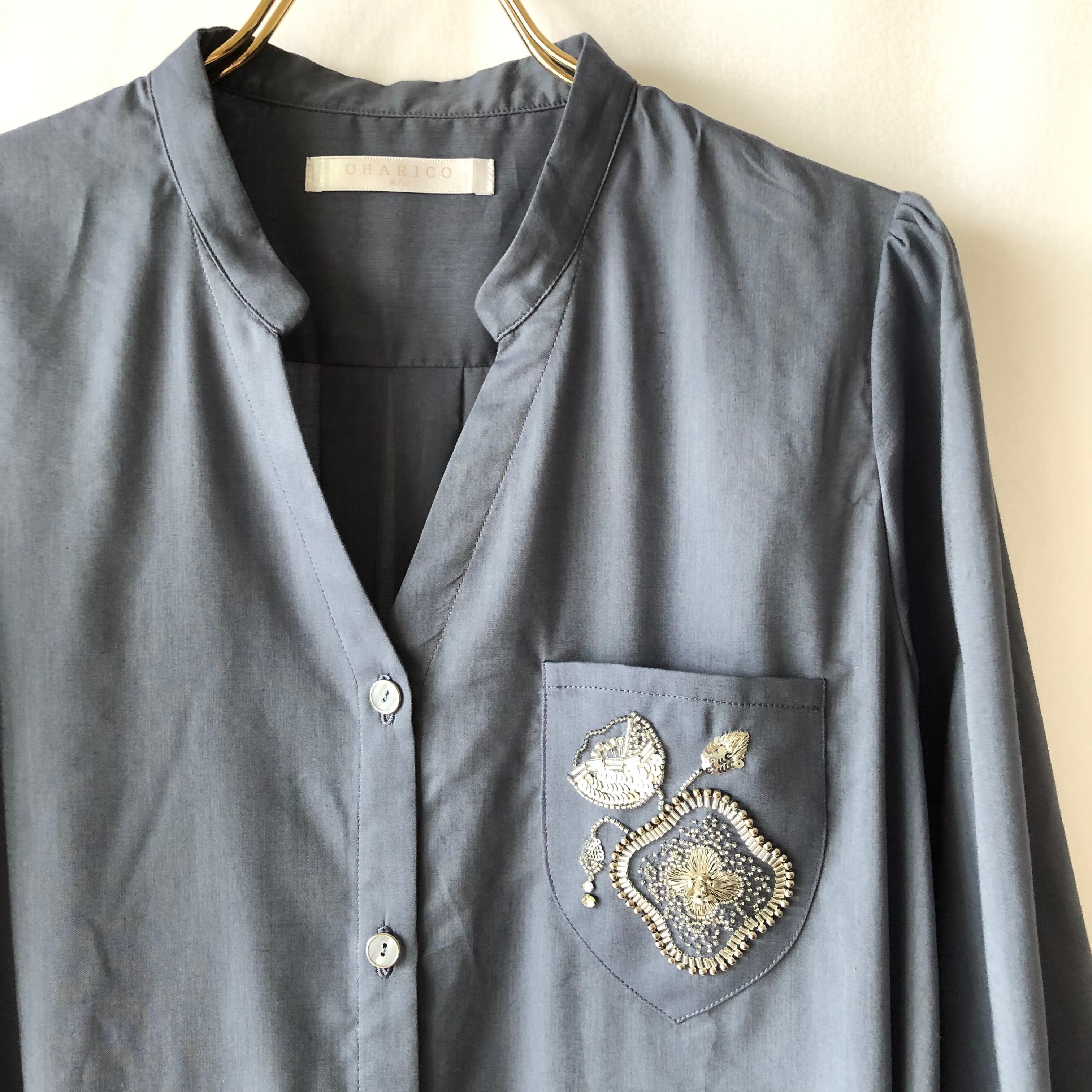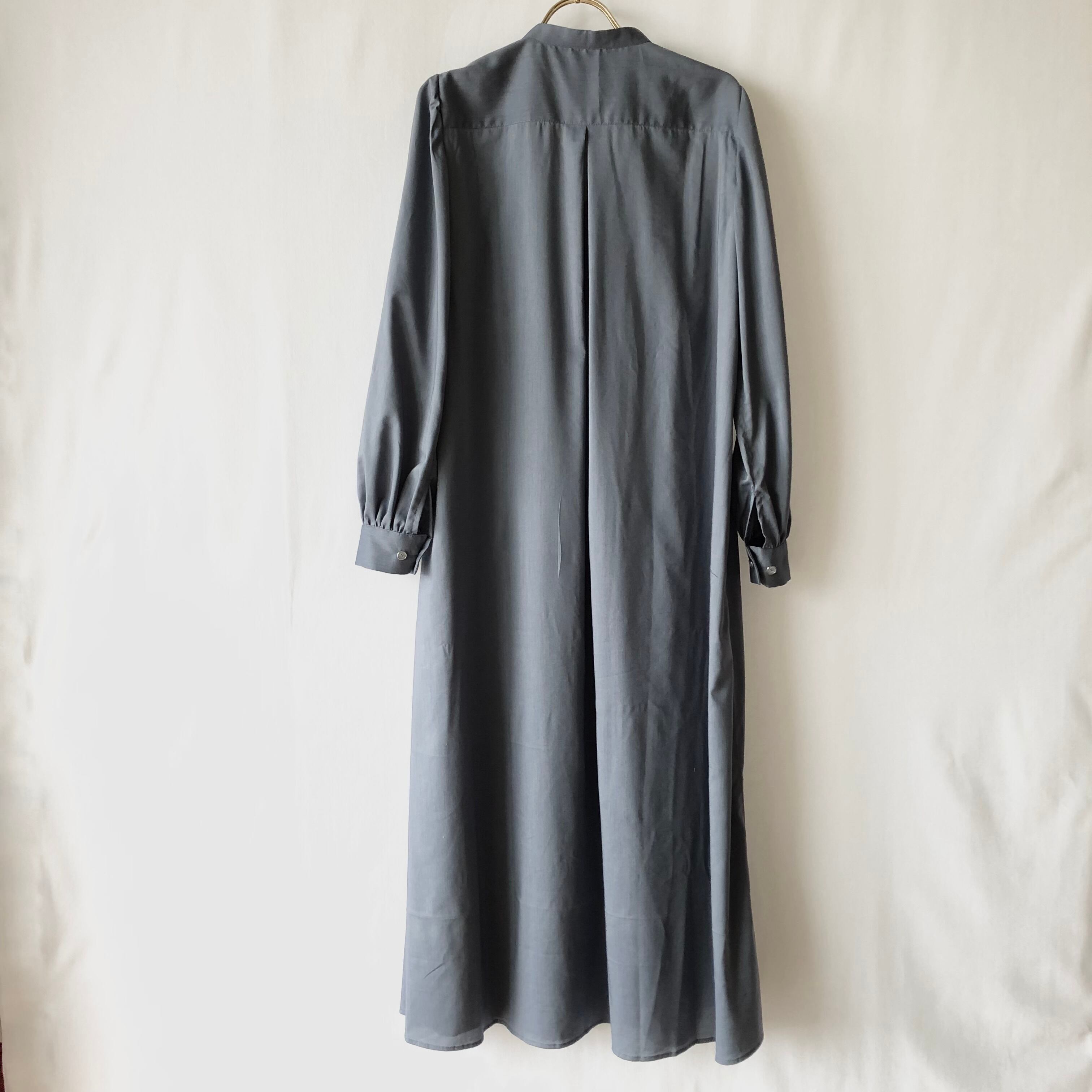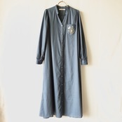 【シャツワンピース/ブルーグレー/Vネックのスタンドカラー/銀ポピー刺繍】