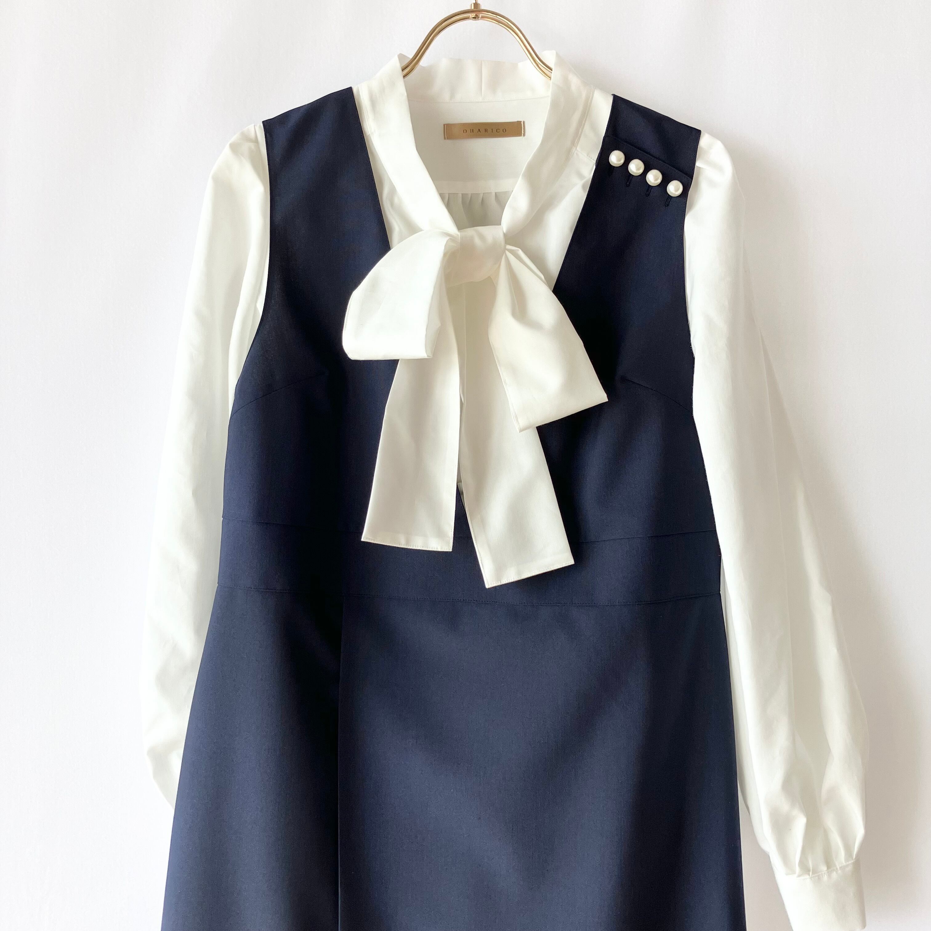 このジャンパースカートにぴったりのなアクセサリー、それはパールネックレス。Vネックの空きに合わせた、大きなひと粒パールネックレス(別売)もおすすめです。