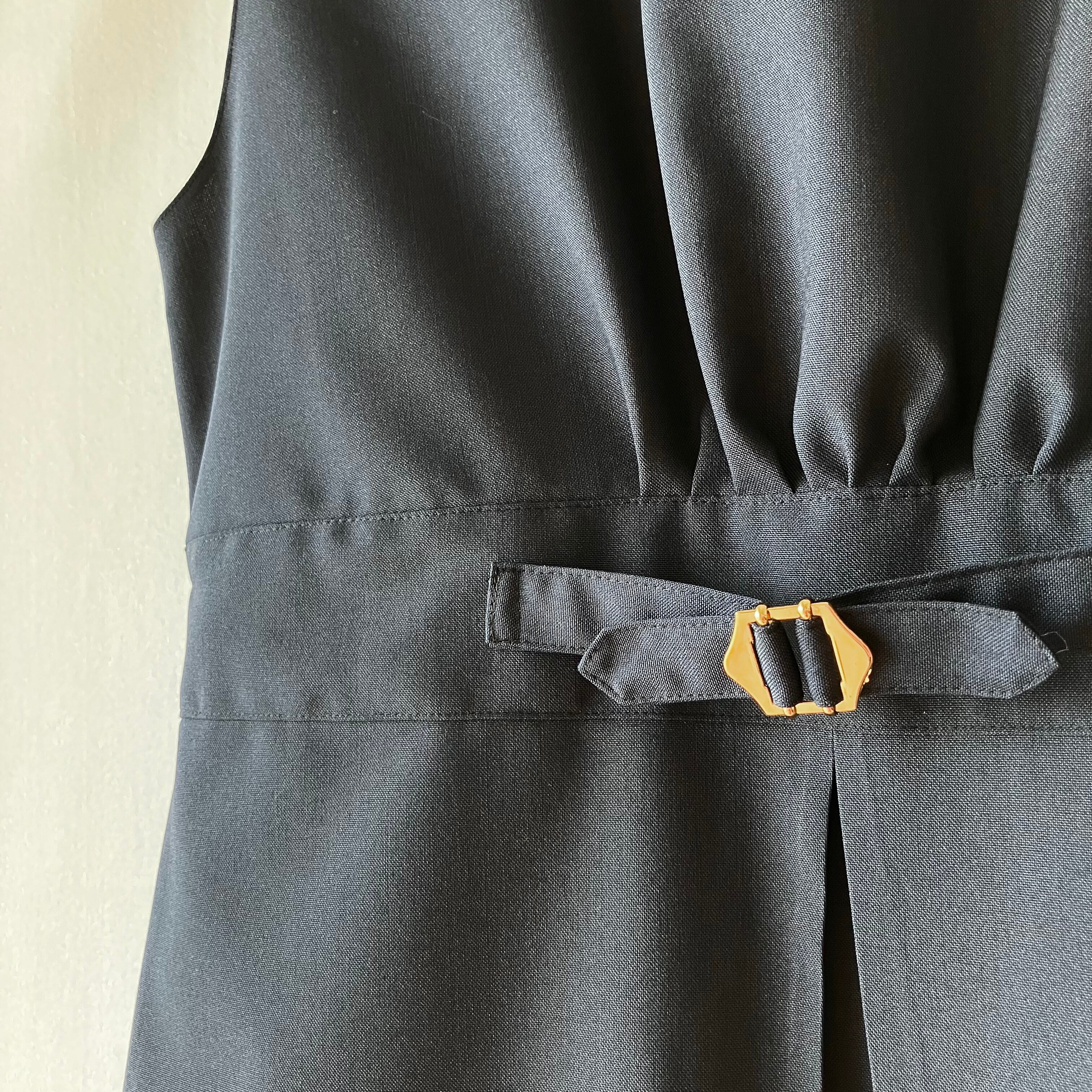 後ろのウエスト部分にベルトがあるので、ちょっとウエストに絞りを入れたいな、という時に締めてみてください。これだけで、ぐっと女性らしくスタイルアップに。