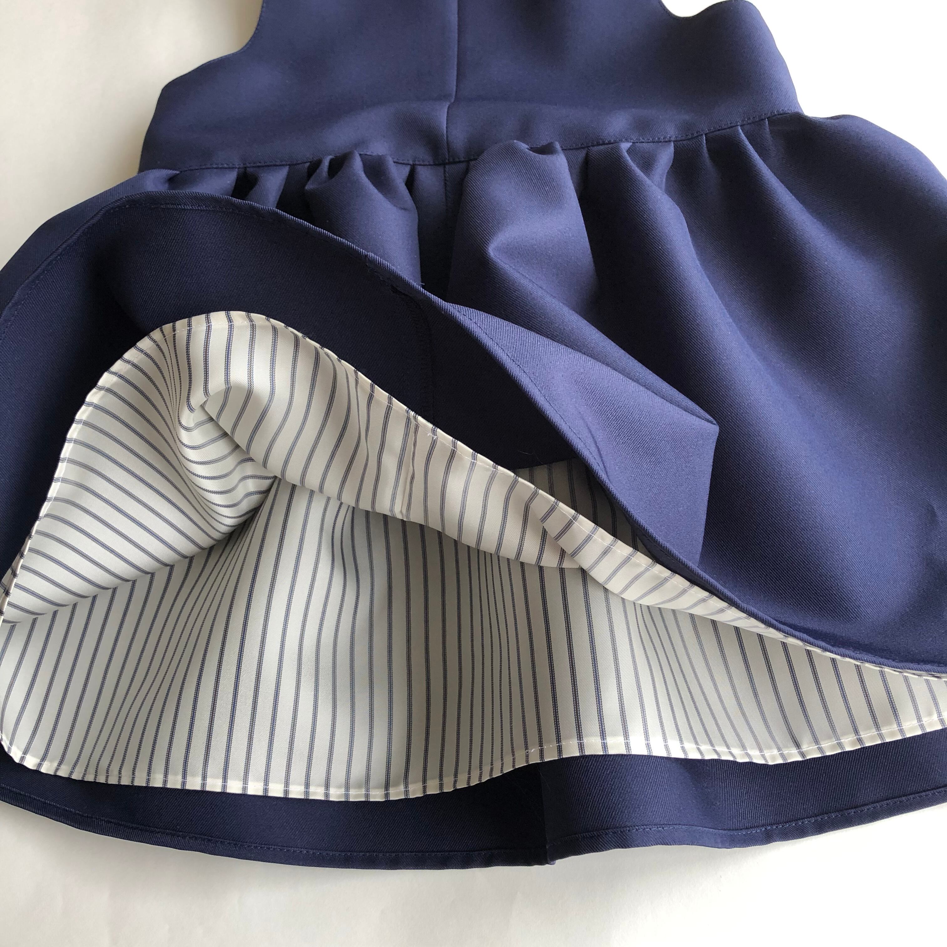 ダークネイビー(濃紺)の生地で、ちょっぴり大人っぽい可愛さを感じられます。裏地は高級裏地のキュプラ100%。