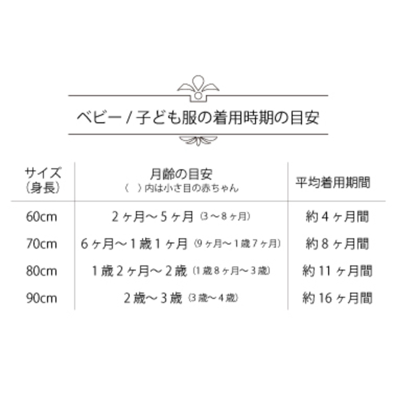 個人差はありますが6か月で70サイズ、1歳で80サイズが目安です。詳しくは商品写真内の「ベビー/子供服の着用時期の目安」をご覧ください。